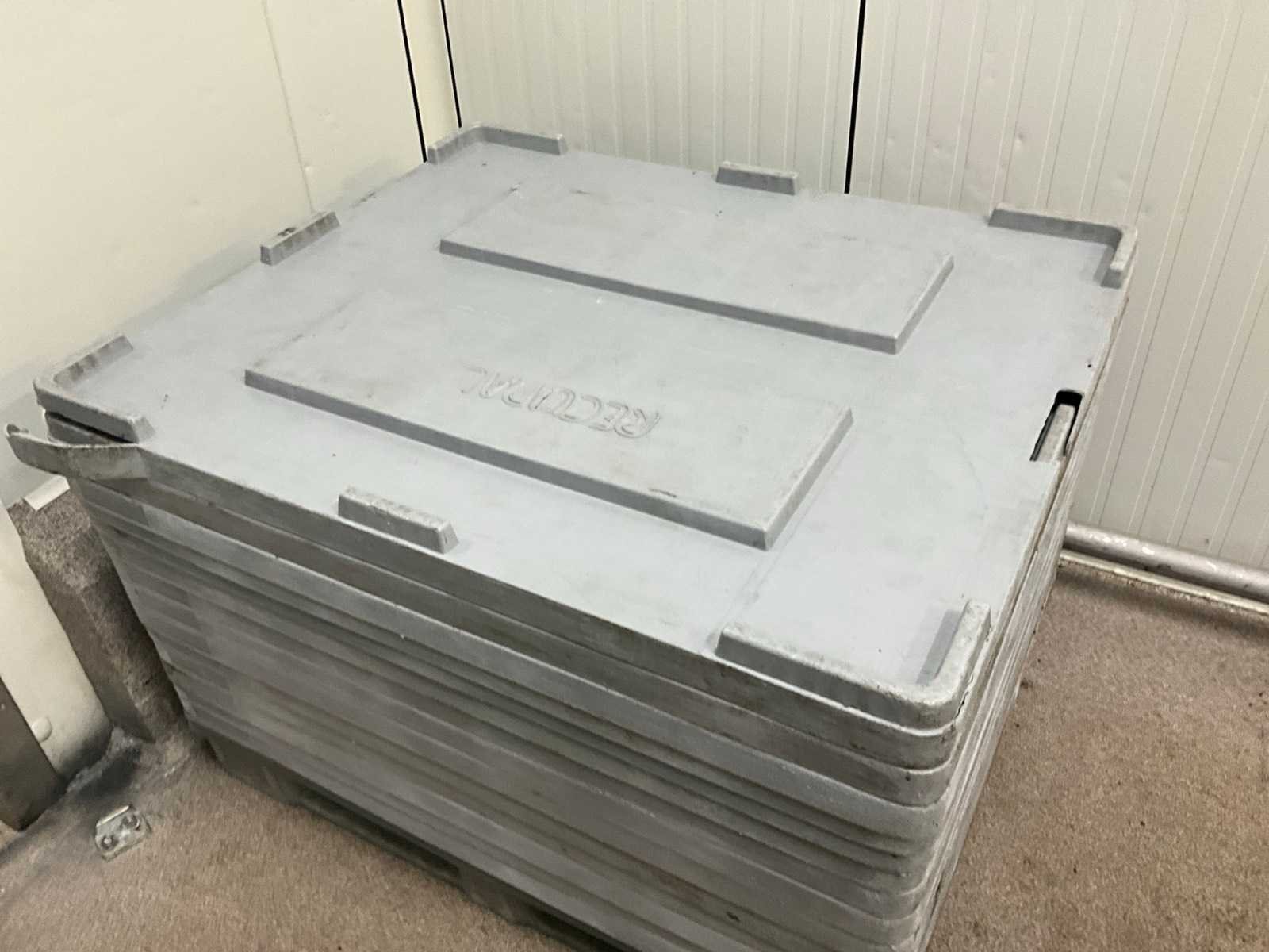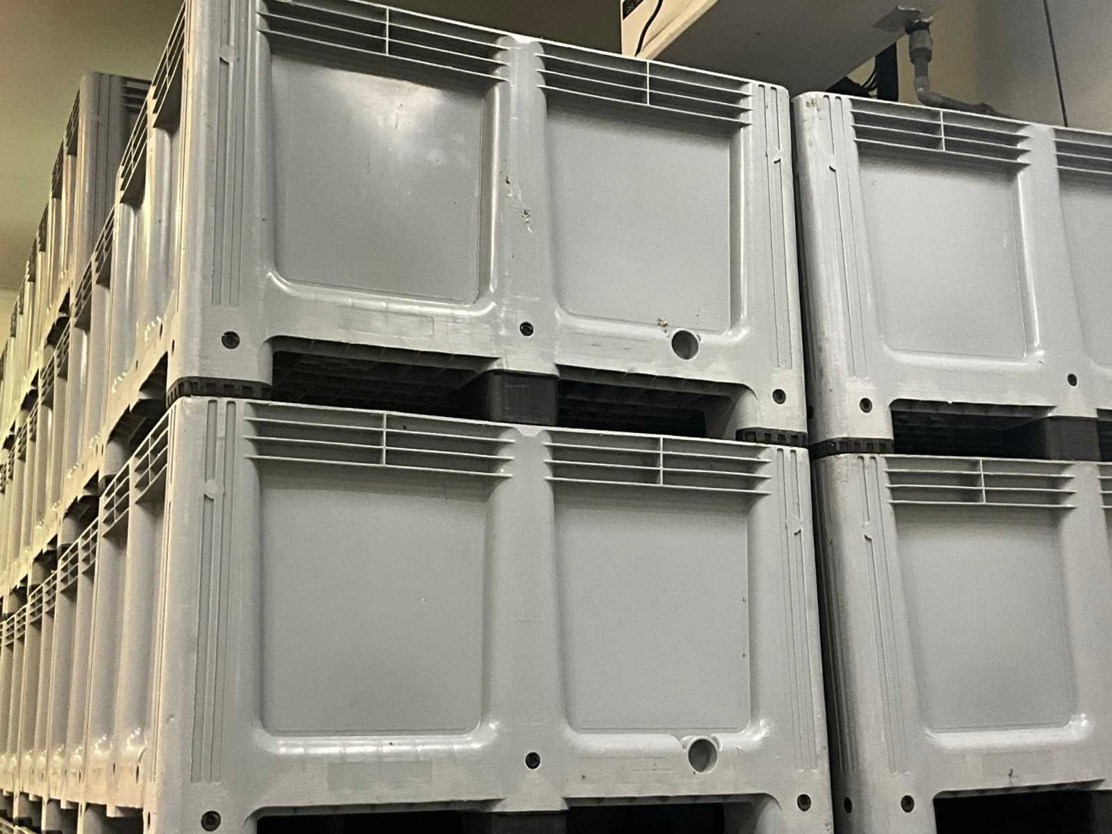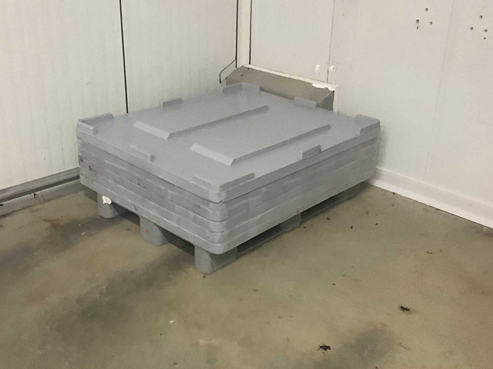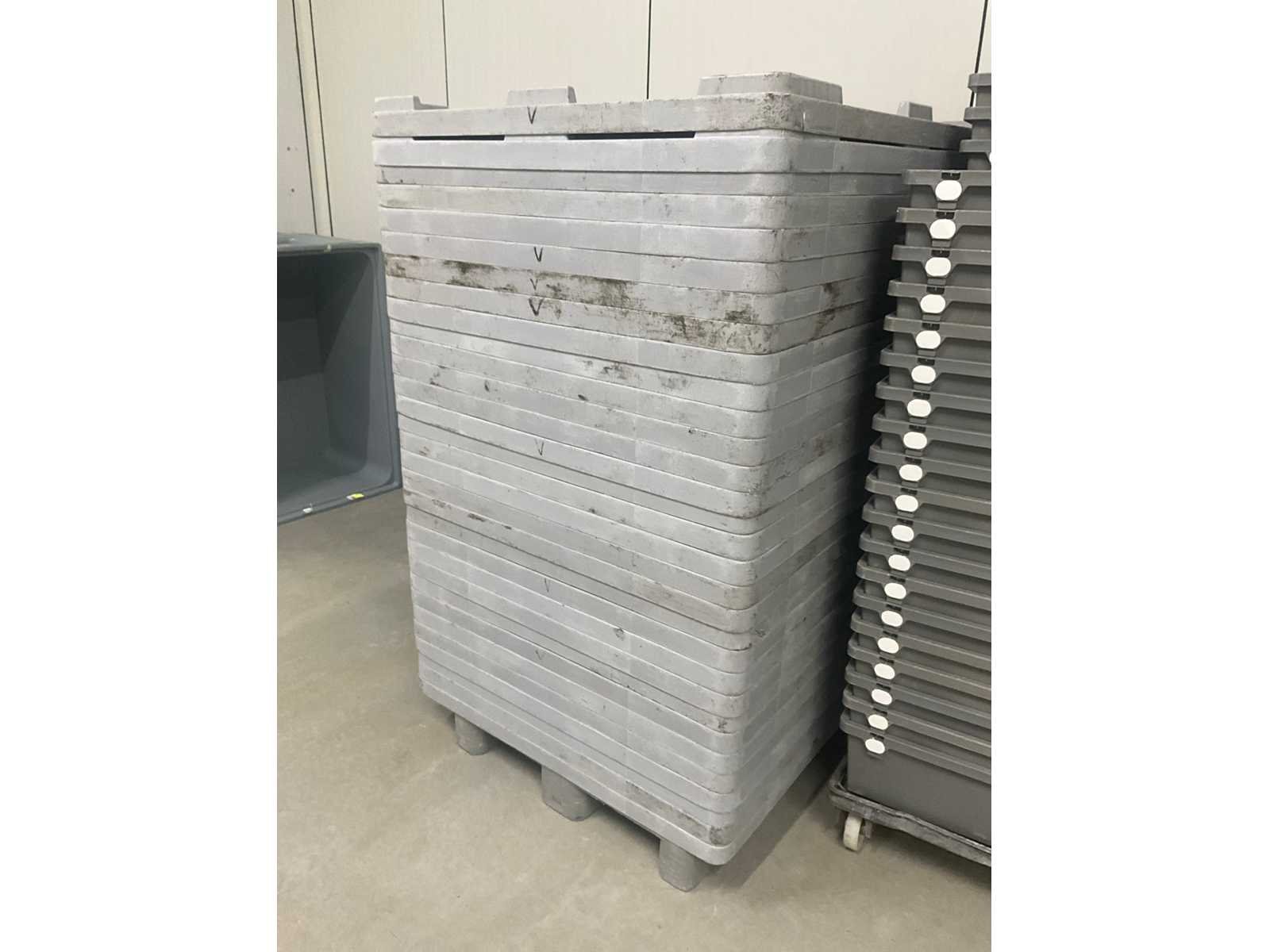 Stapelbaar en compleet met circa 50 palletdeksels. Nee Merk: Plastibac Afmeting l: 1200mm Afmeting b: 1000mm Afmeting h: 750mm