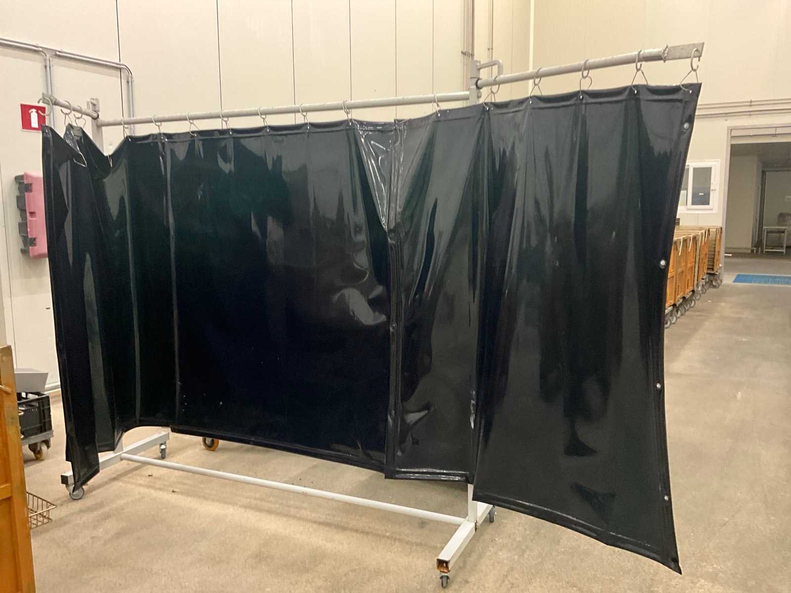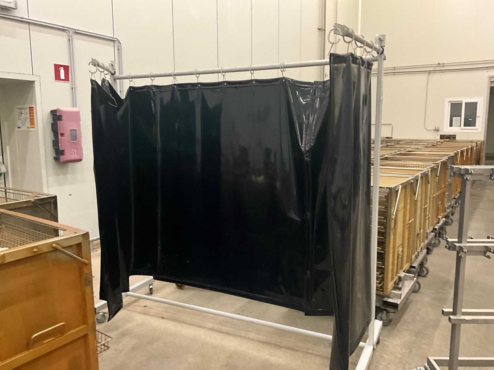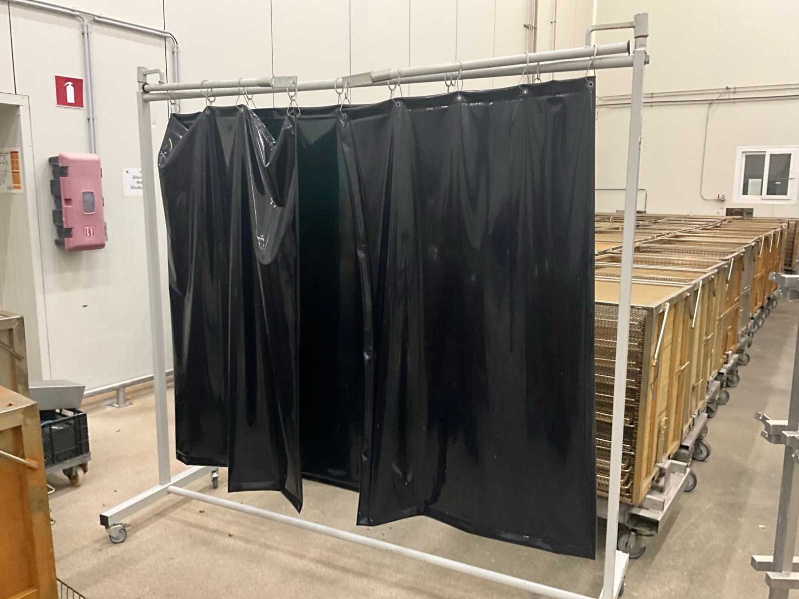 Voorzien van kunststoffen gordijn en 2 uitklapbare metalen baren/elementen van elk 100 cm. Op metalen opstelling en voorzien van 4 zwenkwielen waarvan 2 met rem. Nee Merk: CEPRO Lengte: 210cm Breedte: 75cm Hoogte: 215cm