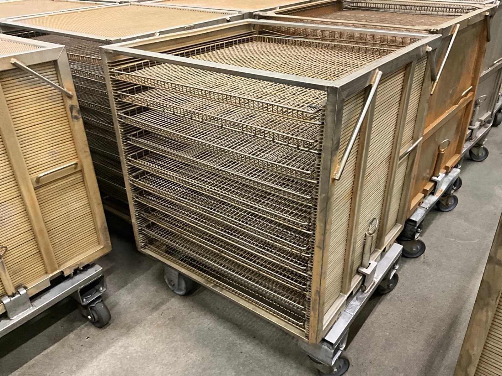Metalen plateaukar inhoudende minimum 10 diverse roosterschalen, elk van circa 82 x 80 x 3,5 cm hoog, in diverse motieven. Afmeting elke kar : 86 x 82 x 115 cm. hoog. Voorzien van 2 zwenkwielen en 2 vaste wielen. Nee