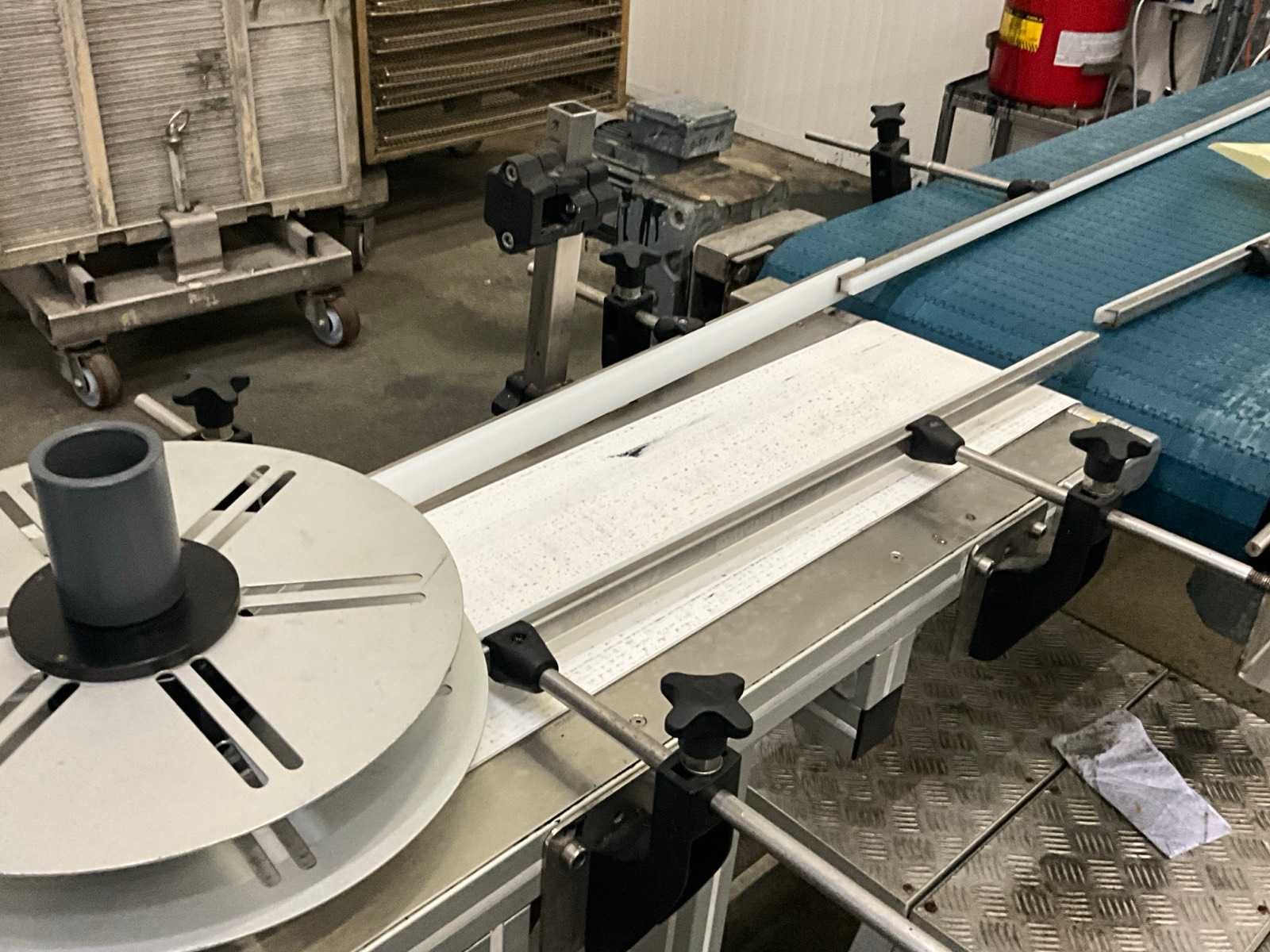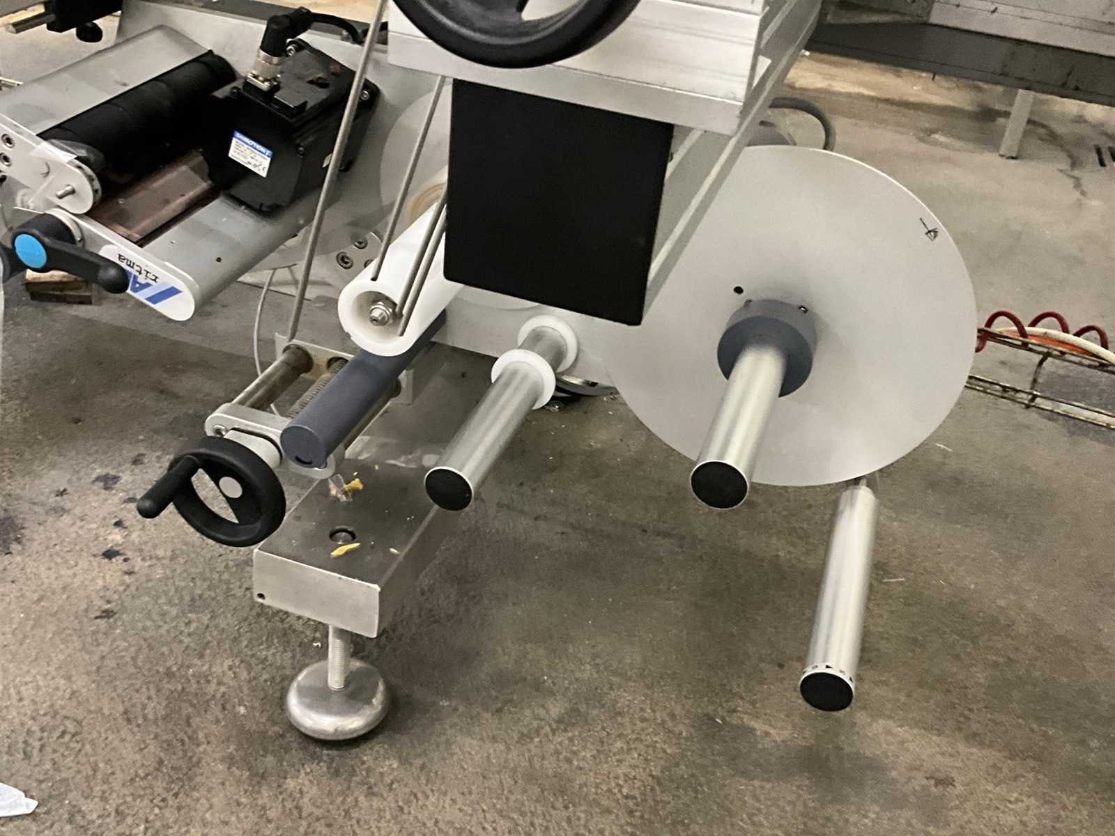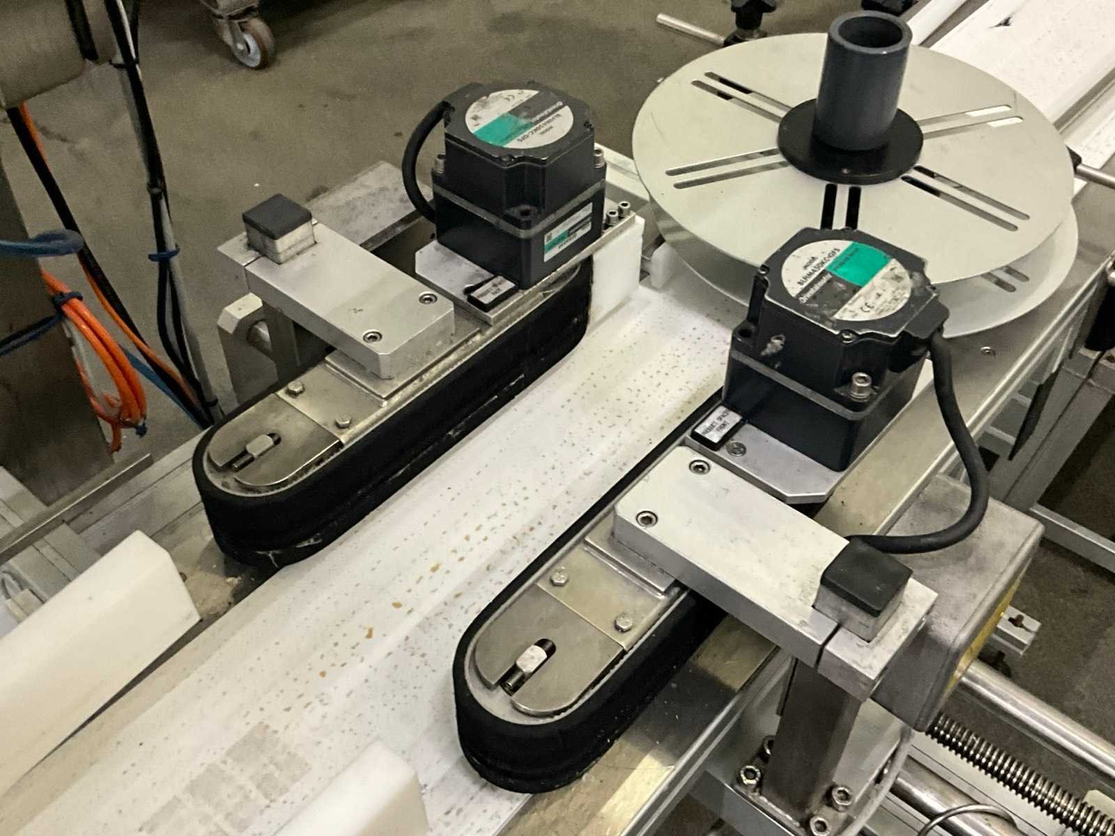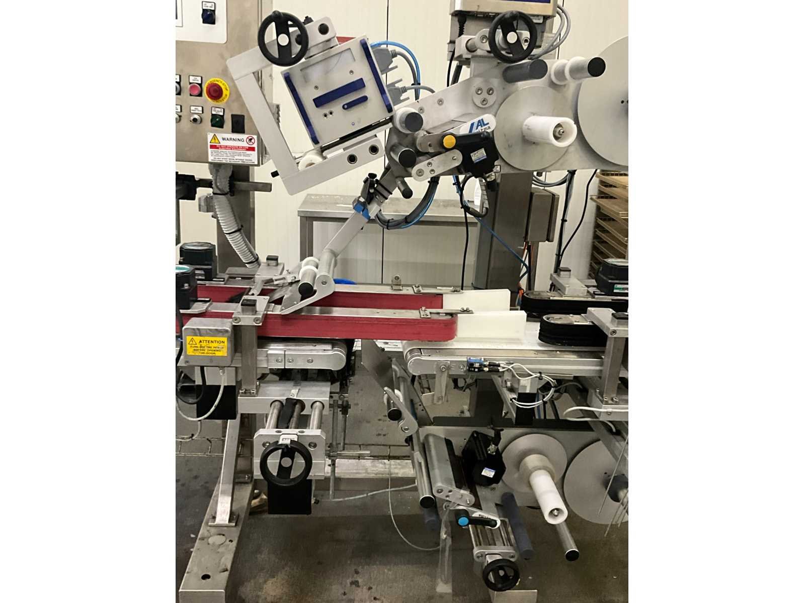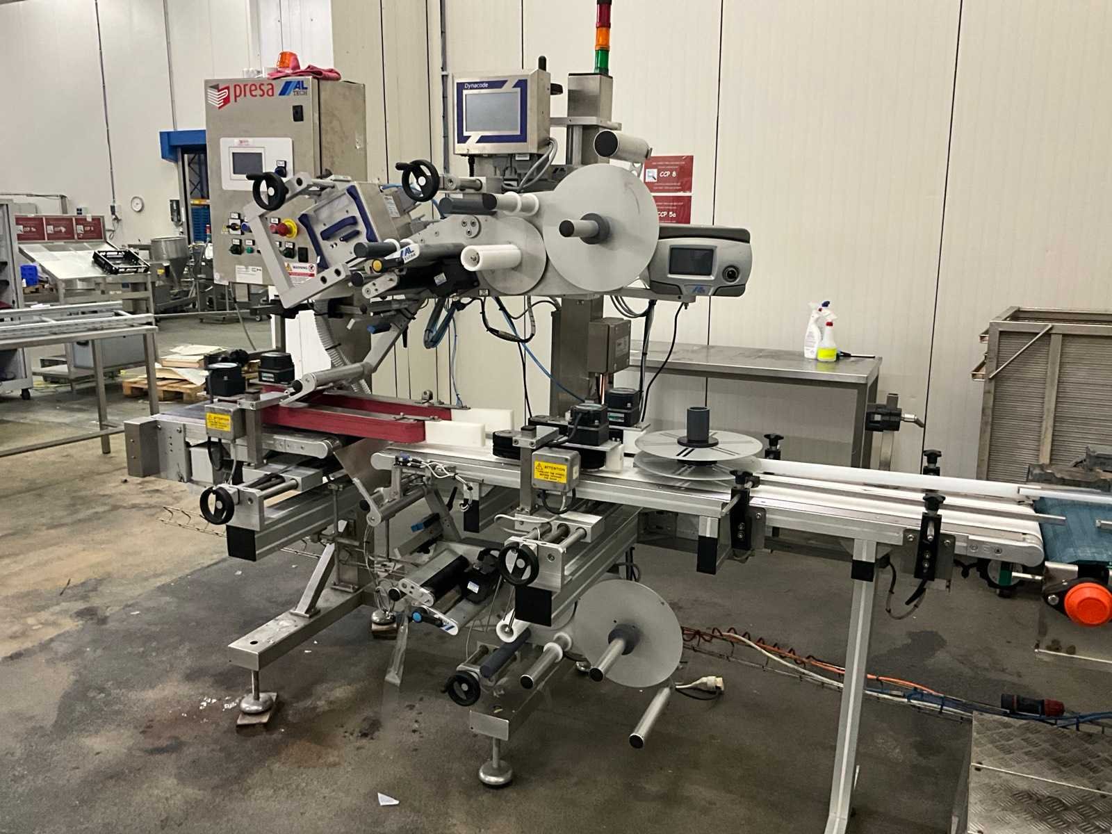 Bestaande uit etiketteermachine AL TECH model AL belt op RvS staander Getra en voorzien van verstelbare bedieningskast/monitor AL TECH, direct folie printer Carl Valentin type Dynacode II 53 - 12 met digitaal controlepaneel, 2x etiketteerkop AL ritma en bedieningskast Presa, voorzien van 2 diverse transportbanden op onderstel waaronder van 160 en 70 cm lang. Beiden banden 20 cm breed en met diverse spoelen voor etikettenrollen. Nee Merk: AL TECH Totale afmeting L: 2500mm Totale afmeting Breedte: 1000mm Totale afmeting Hoogte: 2150mm