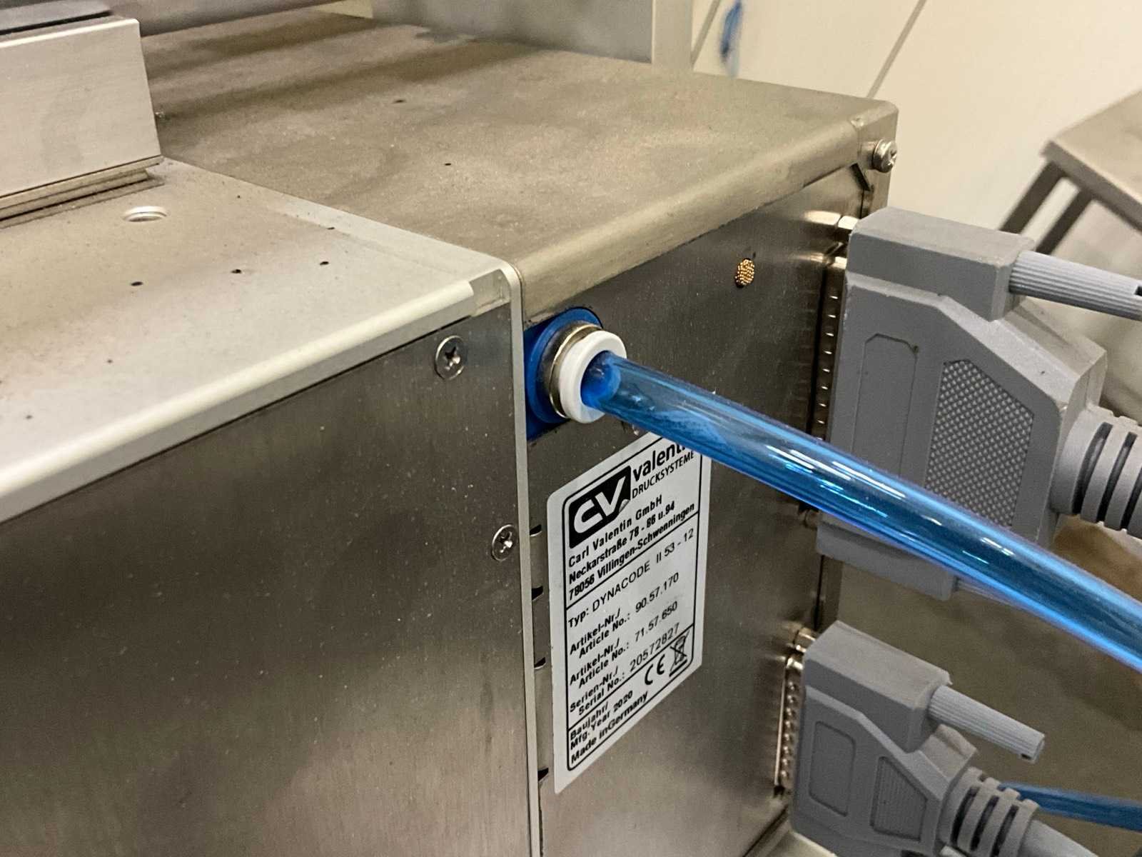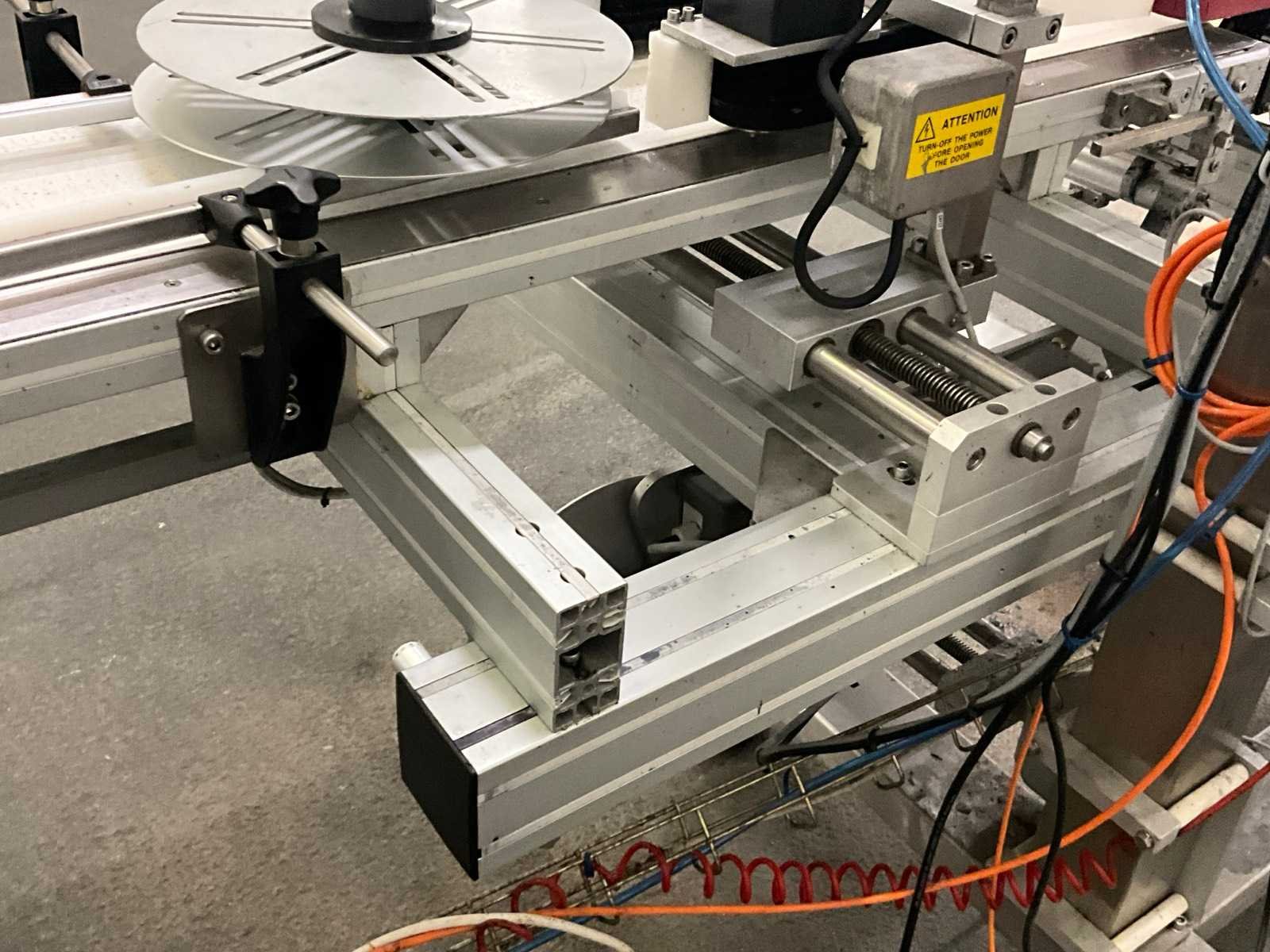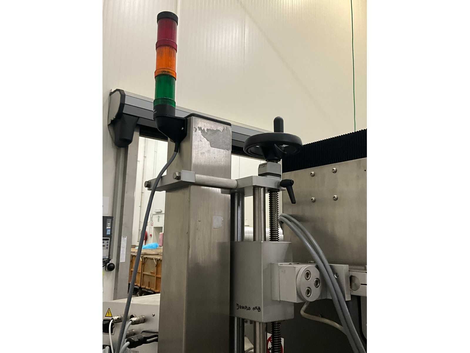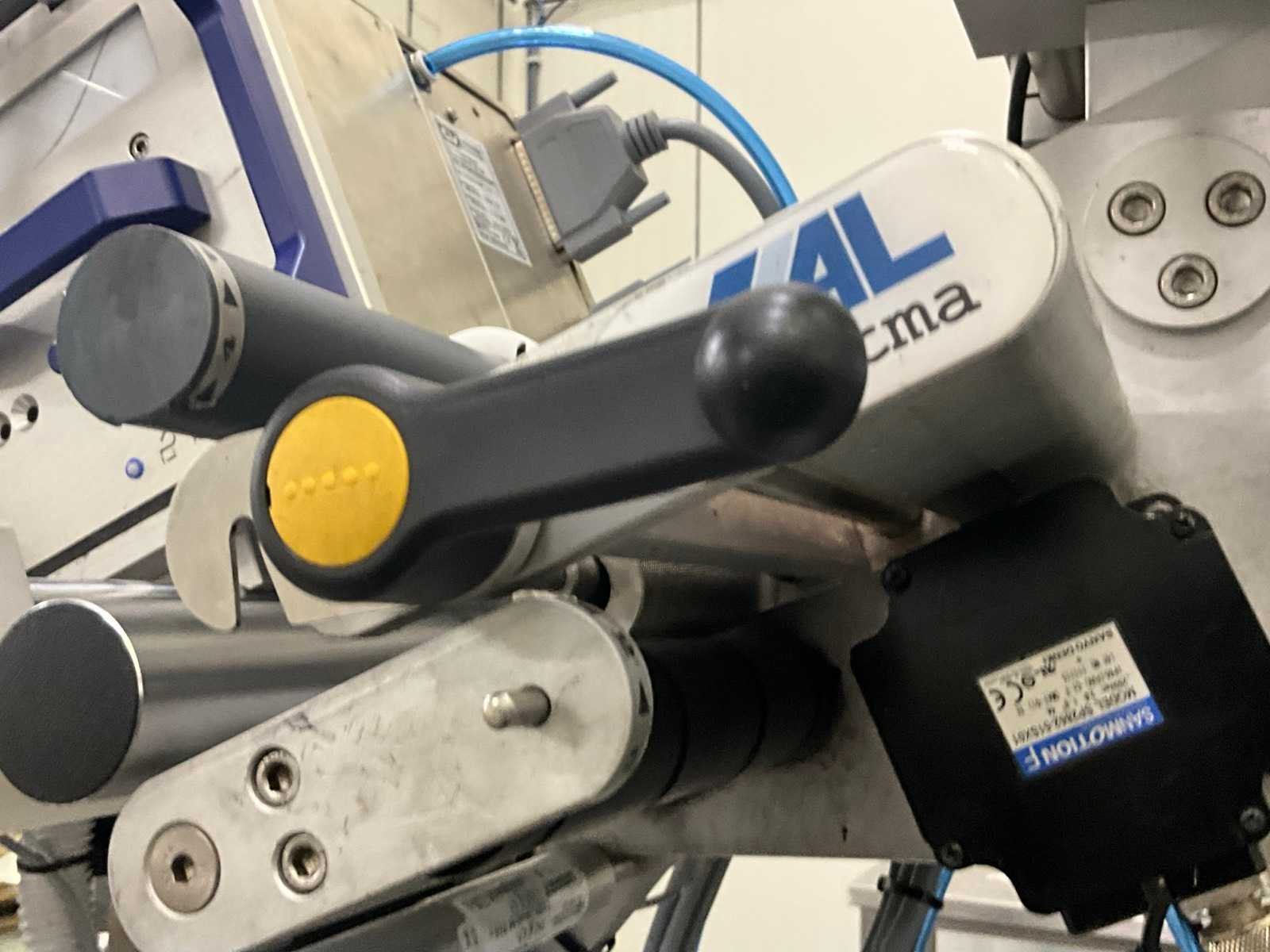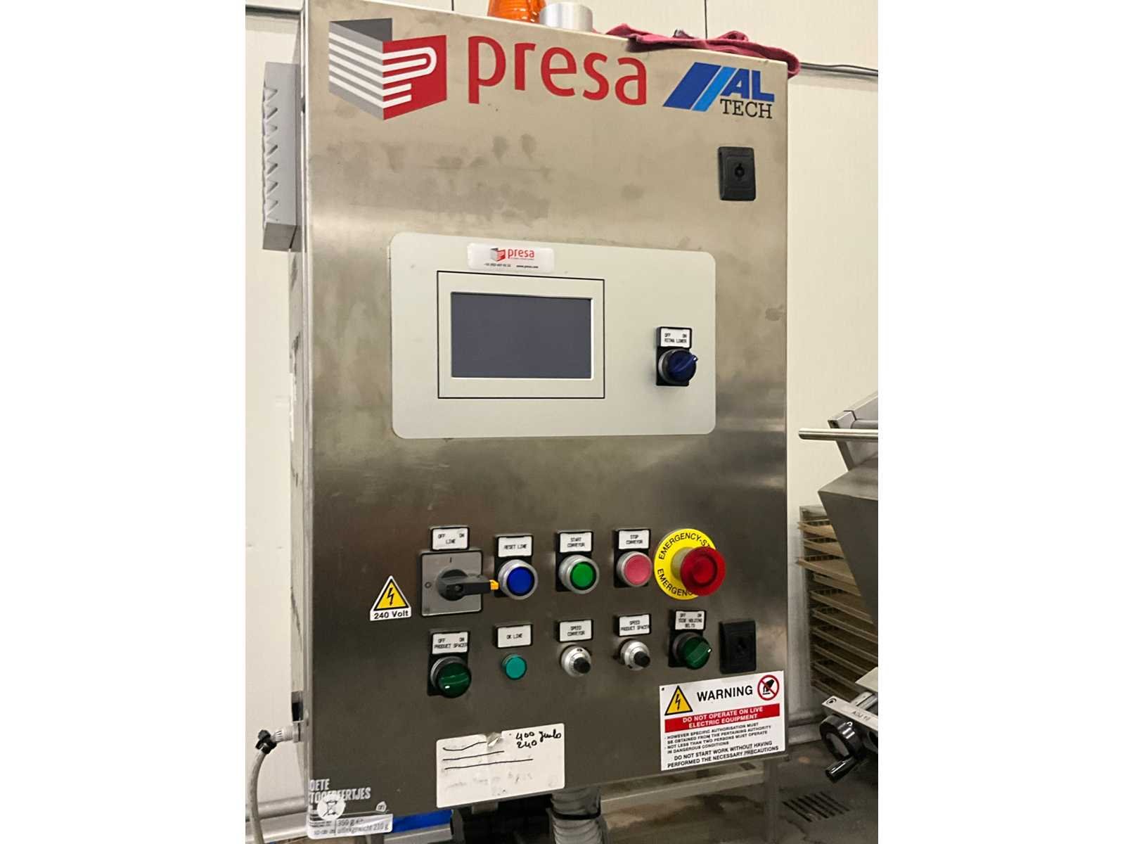 Bestaande uit etiketteermachine AL TECH model AL belt op RvS staander Getra en voorzien van verstelbare bedieningskast/monitor AL TECH, direct folie printer Carl Valentin type Dynacode II 53 - 12 met digitaal controlepaneel, 2x etiketteerkop AL ritma en bedieningskast Presa, voorzien van 2 diverse transportbanden op onderstel waaronder van 160 en 70 cm lang. Beiden banden 20 cm breed en met diverse spoelen voor etikettenrollen. Nee Merk: AL TECH Totale afmeting L: 2500mm Totale afmeting Breedte: 1000mm Totale afmeting Hoogte: 2150mm