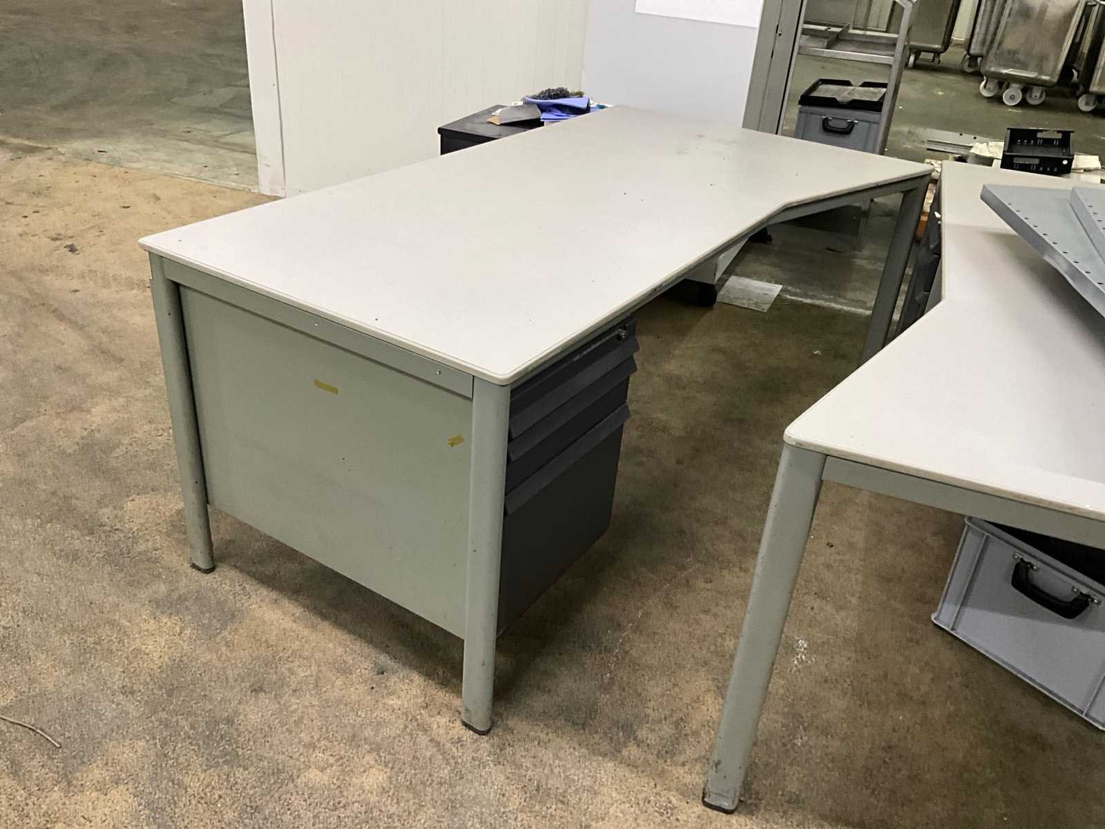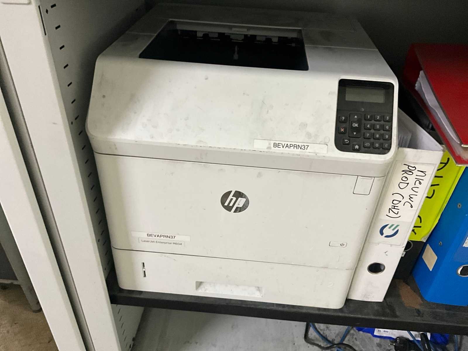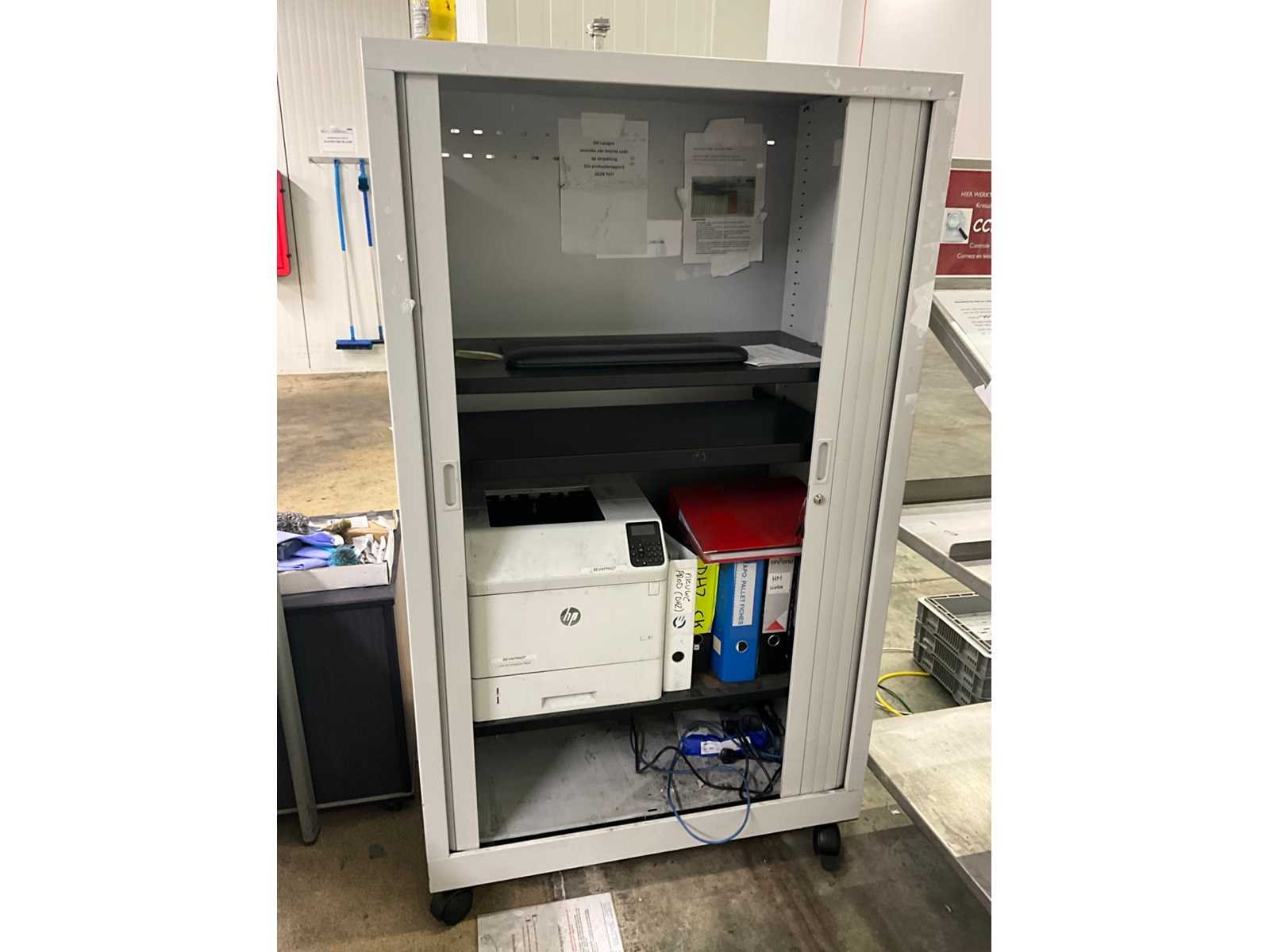 Printer HP type LaserJet Enterprise M604, compleet met verrijdbare metalen dossierkast van circa 100x60x172 cm hoog voorzien van 2 rolluikdeuren, en enige leggers, rvs werkstand voorzien van 3 niveaus waaronder 1 schuin, 97 cm breed en 160 cm hoog, 2 bureaus 180x100 cm en met telkens 3 vaste schuiven. Nee