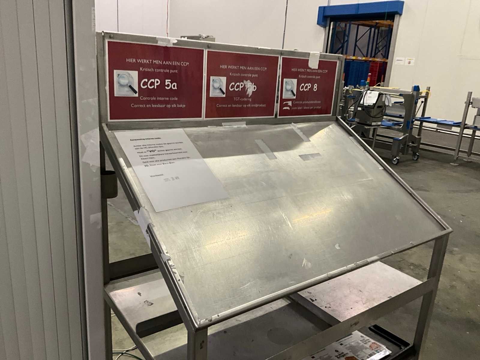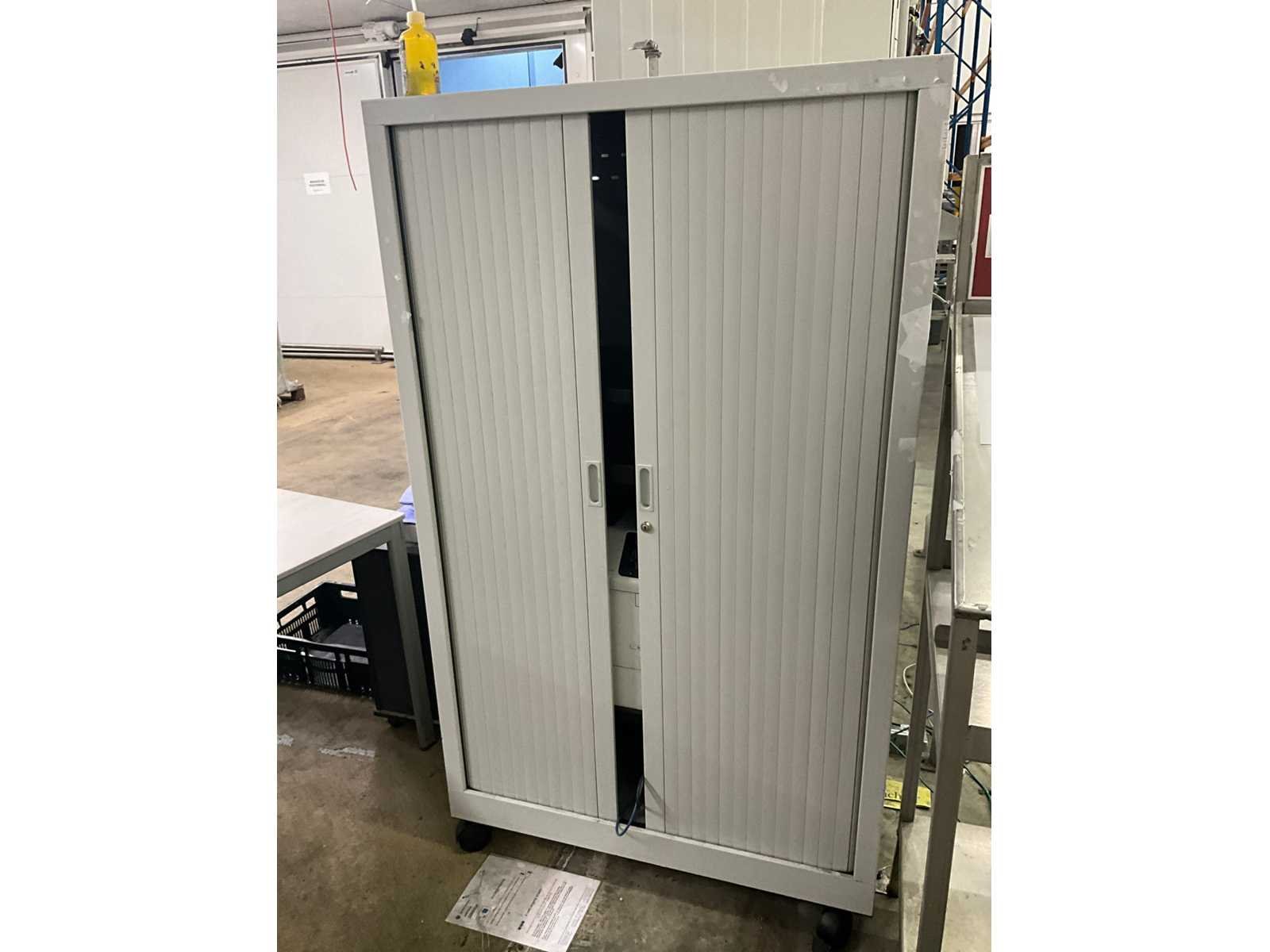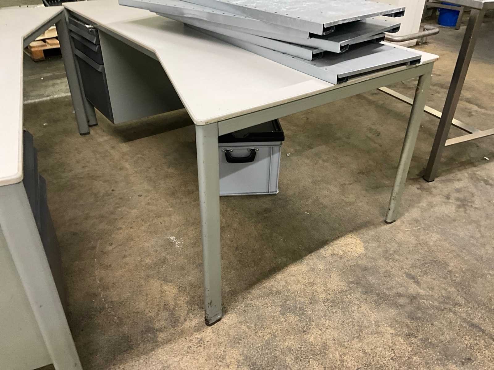 Printer HP type LaserJet Enterprise M604, compleet met verrijdbare metalen dossierkast van circa 100x60x172 cm hoog voorzien van 2 rolluikdeuren, en enige leggers, rvs werkstand voorzien van 3 niveaus waaronder 1 schuin, 97 cm breed en 160 cm hoog, 2 bureaus 180x100 cm en met telkens 3 vaste schuiven. Nee