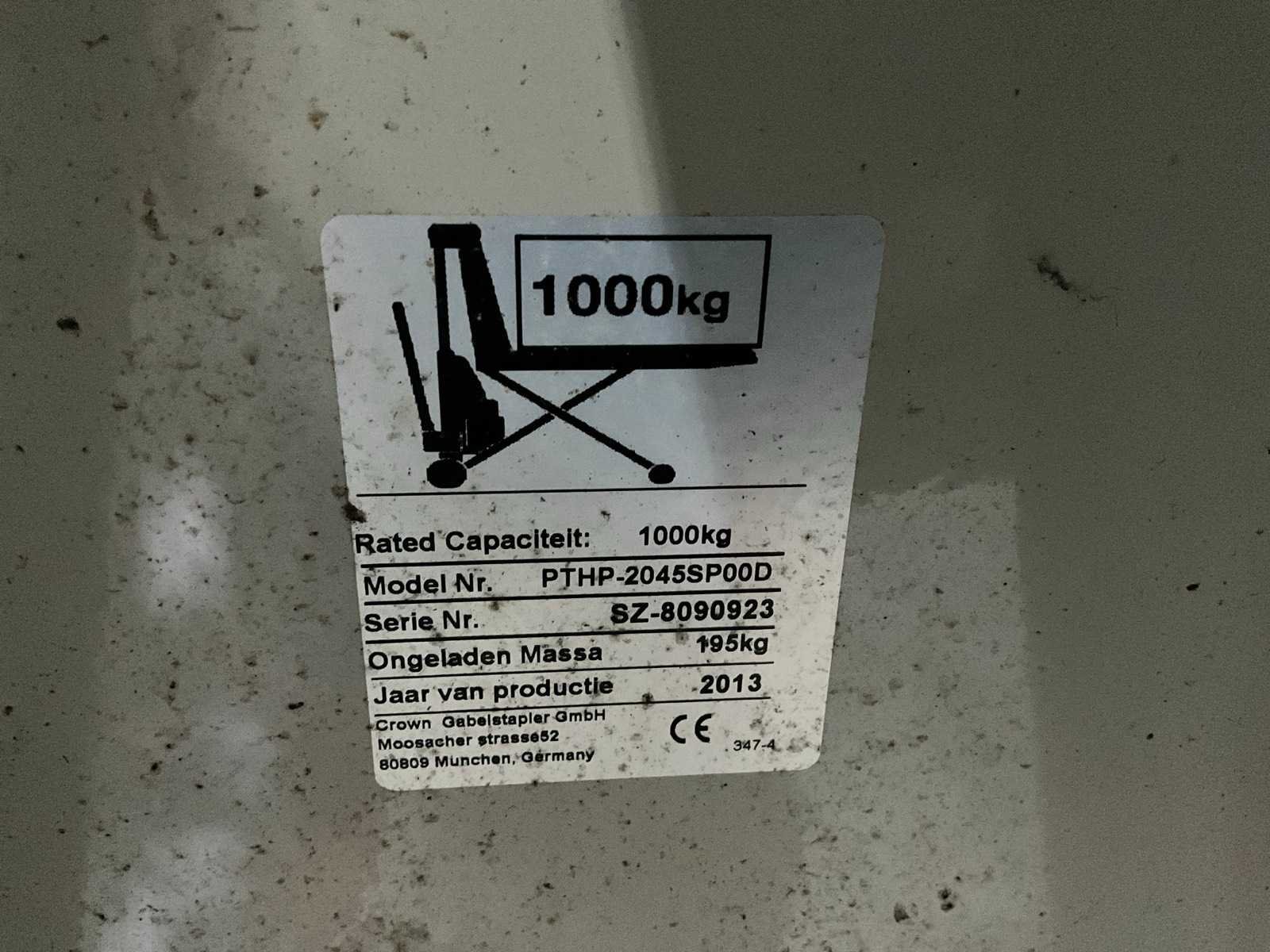 Nee Merk: Crown Type: PTHP-2045SP00D Bouwjaar: 2013 Hefvermogen: 1000kg Lepellengte: 1150mm