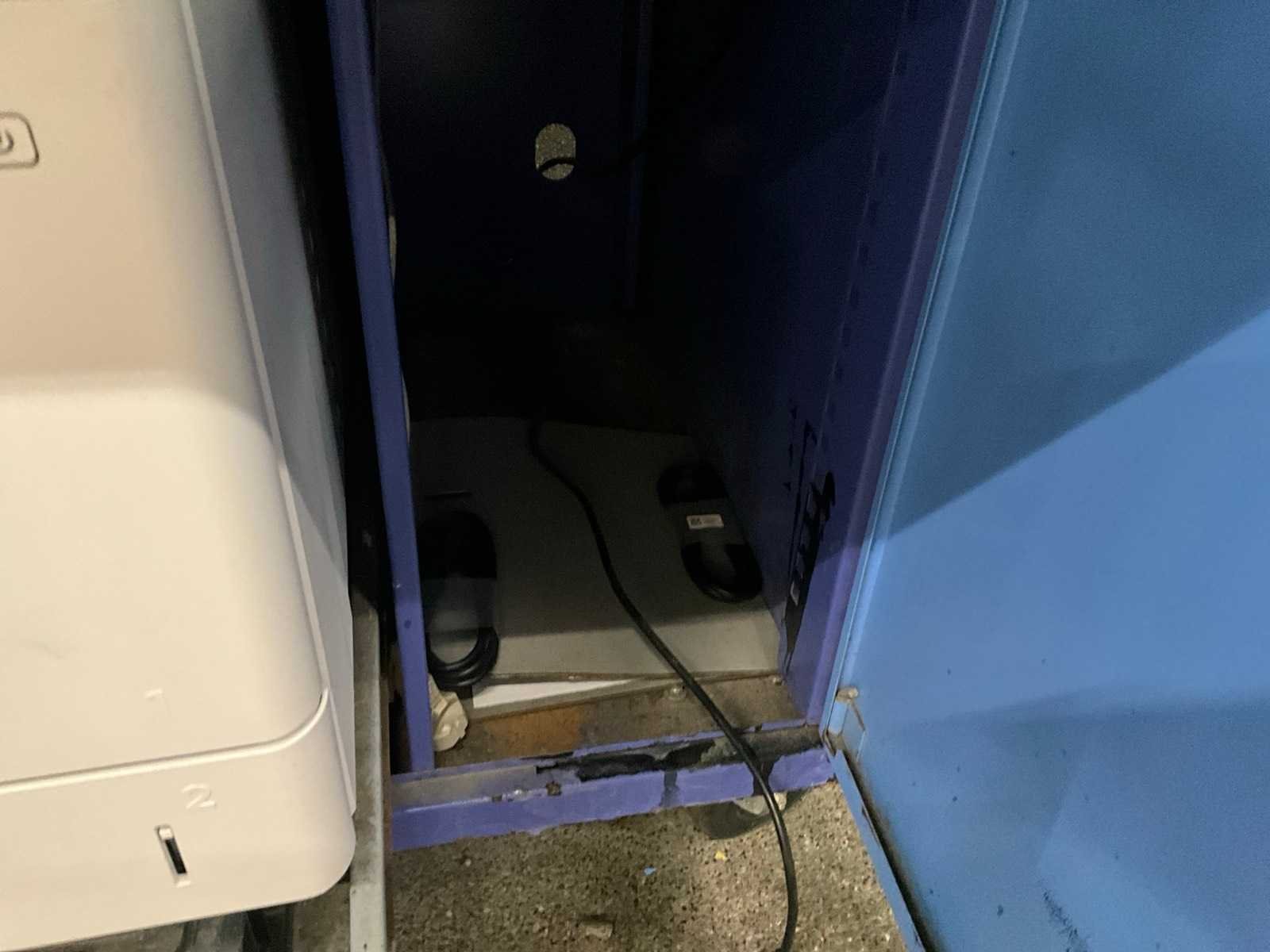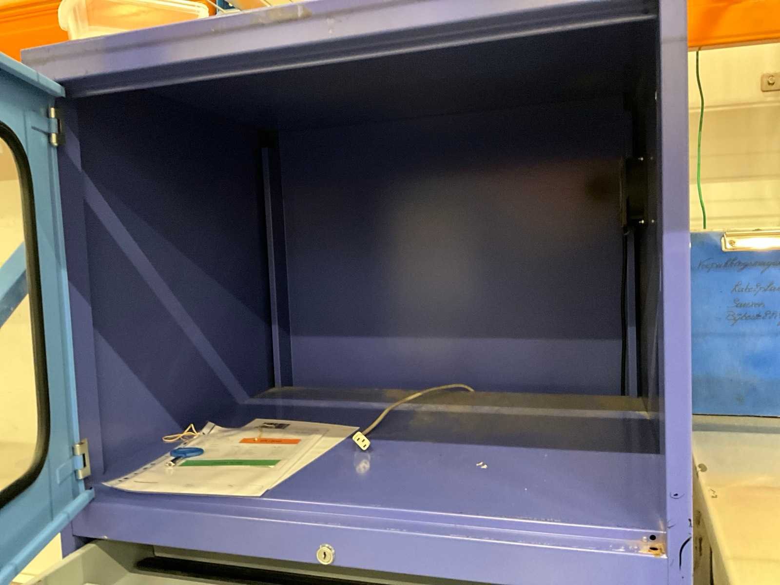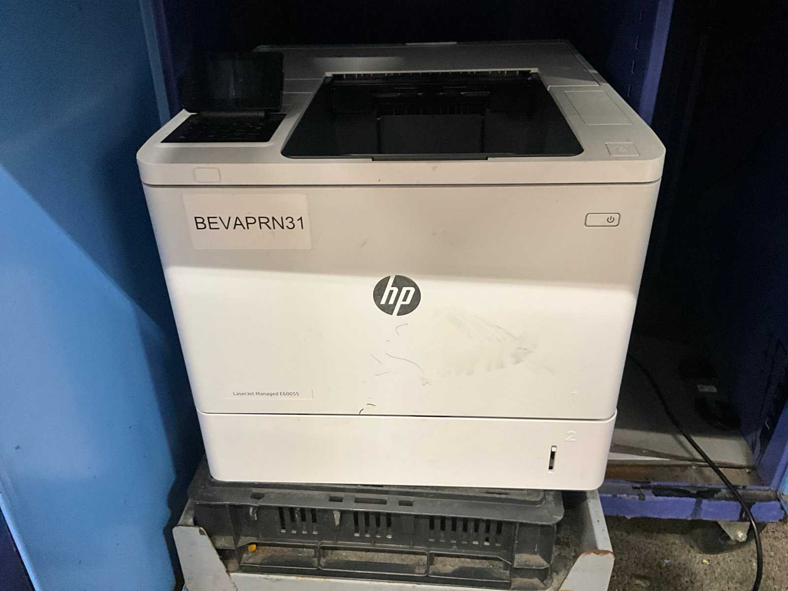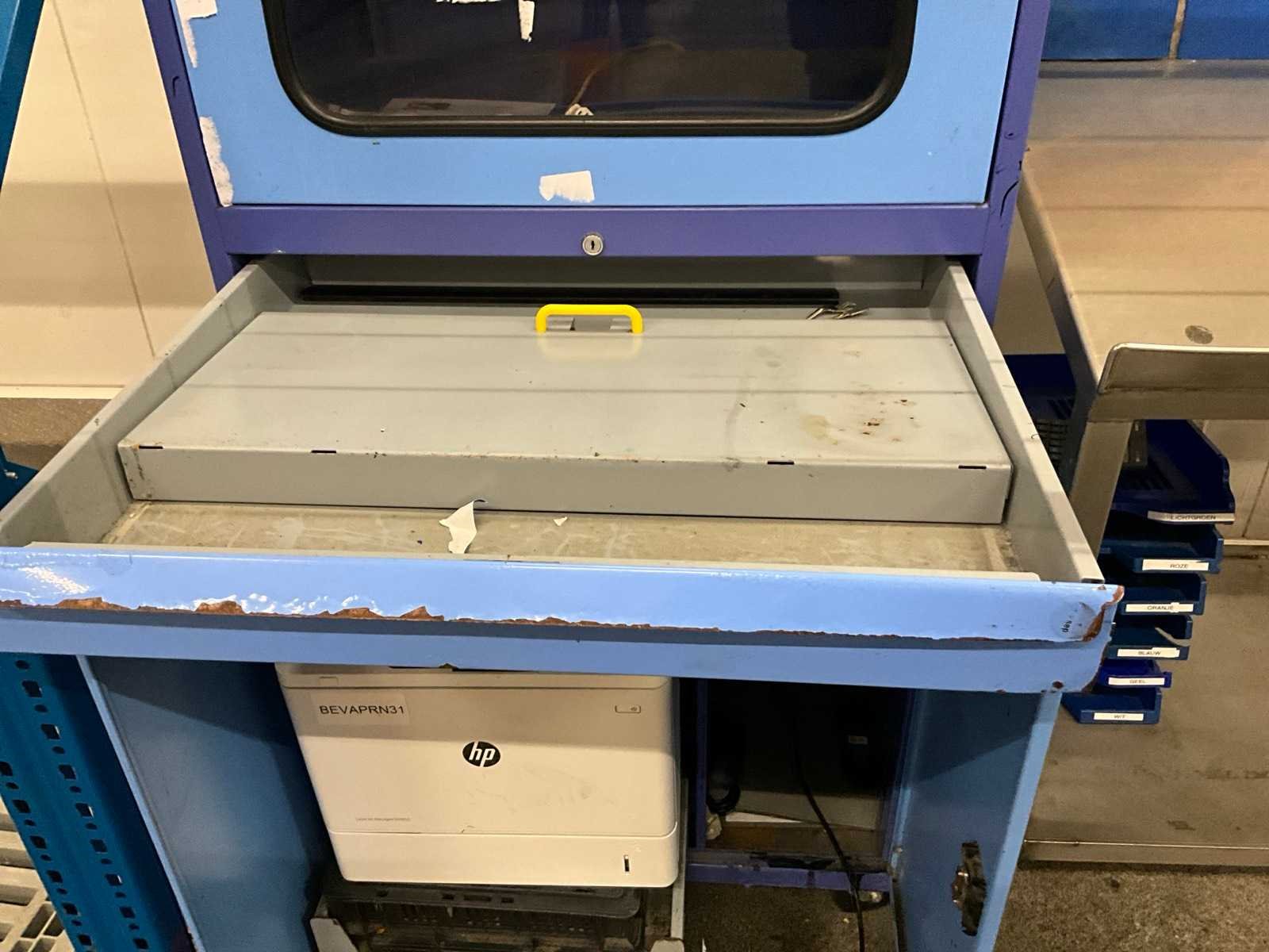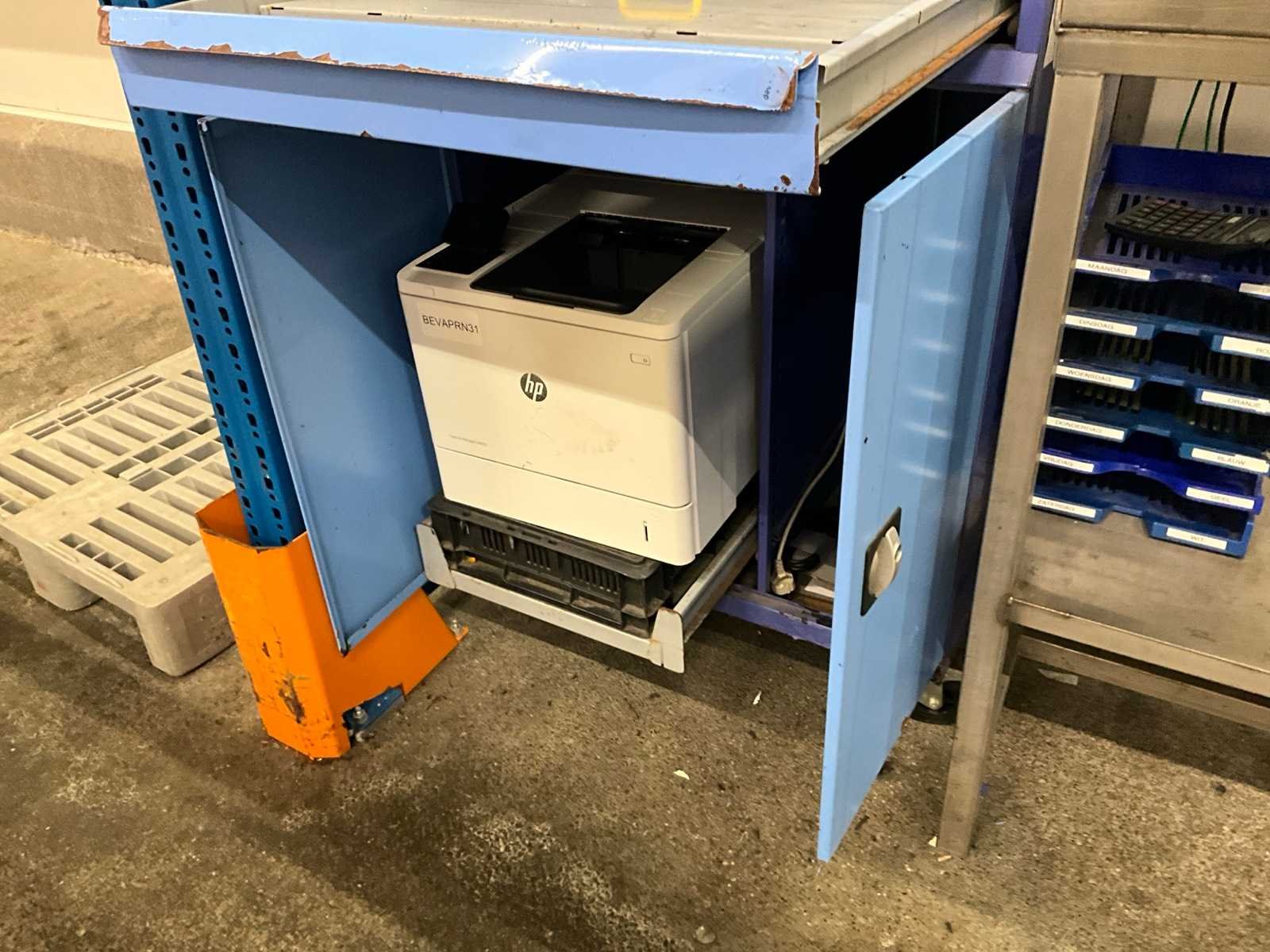 Bestaande uit: rvs werktafel met afmeting: 100x60x150cm en verrijdbare metalen werkkast voorzien van 1 lade en 3 diverse deuren, afmeting: 80x70x175cm, compleet met laserprinter HP Laserjet Managed E60055 Nee