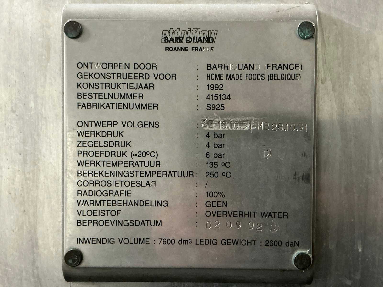 Compleet met rvs sturingskast, incompleet, Door klant vakkundig te demonteren tot aan afvoer, Afgifte volgens aanwijzing Nee Merk: Barriquand Type: Steriflow Bouwjaar: 1992 Serienummer: S925 Inhoud: 7600l Aansluiting: 400V Totale afmeting L: 8000mm Totale afmeting Breedte: 1720mm Totale afmeting Hoogte: 1580mm