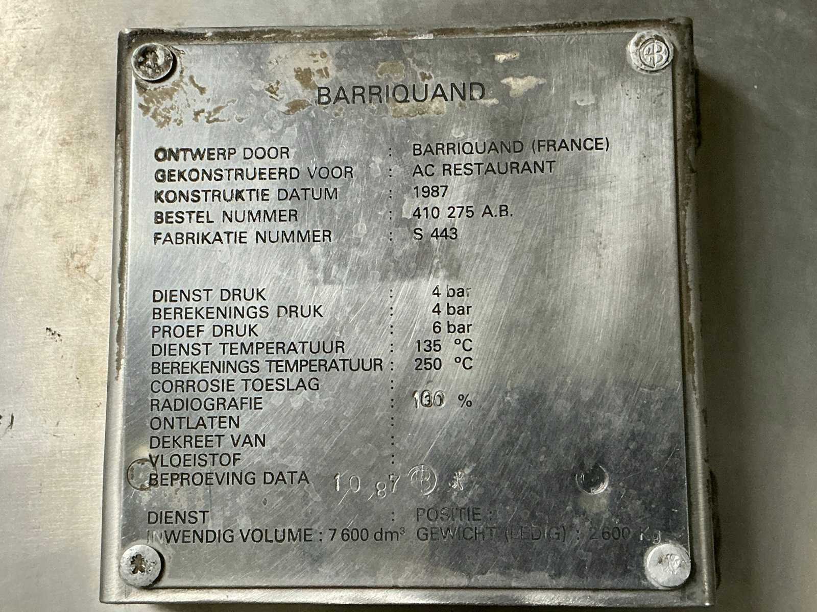Compleet met rvs sturingskast, incompleet, Door klant vakkundig te demonteren tot aan afvoer, Afgifte volgens aanwijzing Nee Merk: Barriquand Type: Steriflow Bouwjaar: 1987 Serienummer: S443 Inhoud: 7600l Aansluiting: 400V Totale afmeting L: 7300mm Totale afmeting Breedte: 2030mm Totale afmeting Hoogte: 2100mm