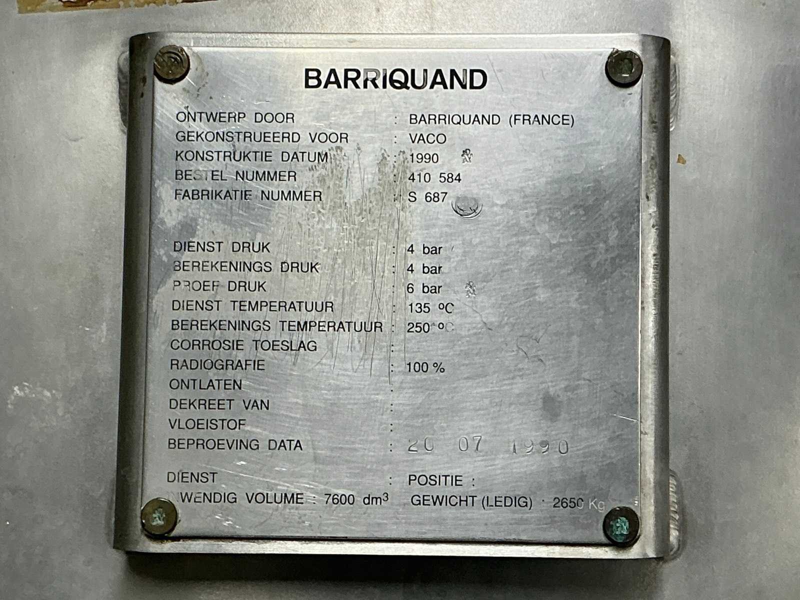 Compleet met rvs sturingskast en heat exchanger Bj1990, Door klant vakkundig te demonteren tot aan afvoer, Afgifte volgens aanwijzing Nee Merk: Barriquand Type: Steriflow Bouwjaar: 1990 Serienummer: S687 Inhoud: 7600l Aansluiting: 400V Totale afmeting L: 7300mm Totale afmeting Breedte: 2030mm Totale afmeting Hoogte: 2100mm