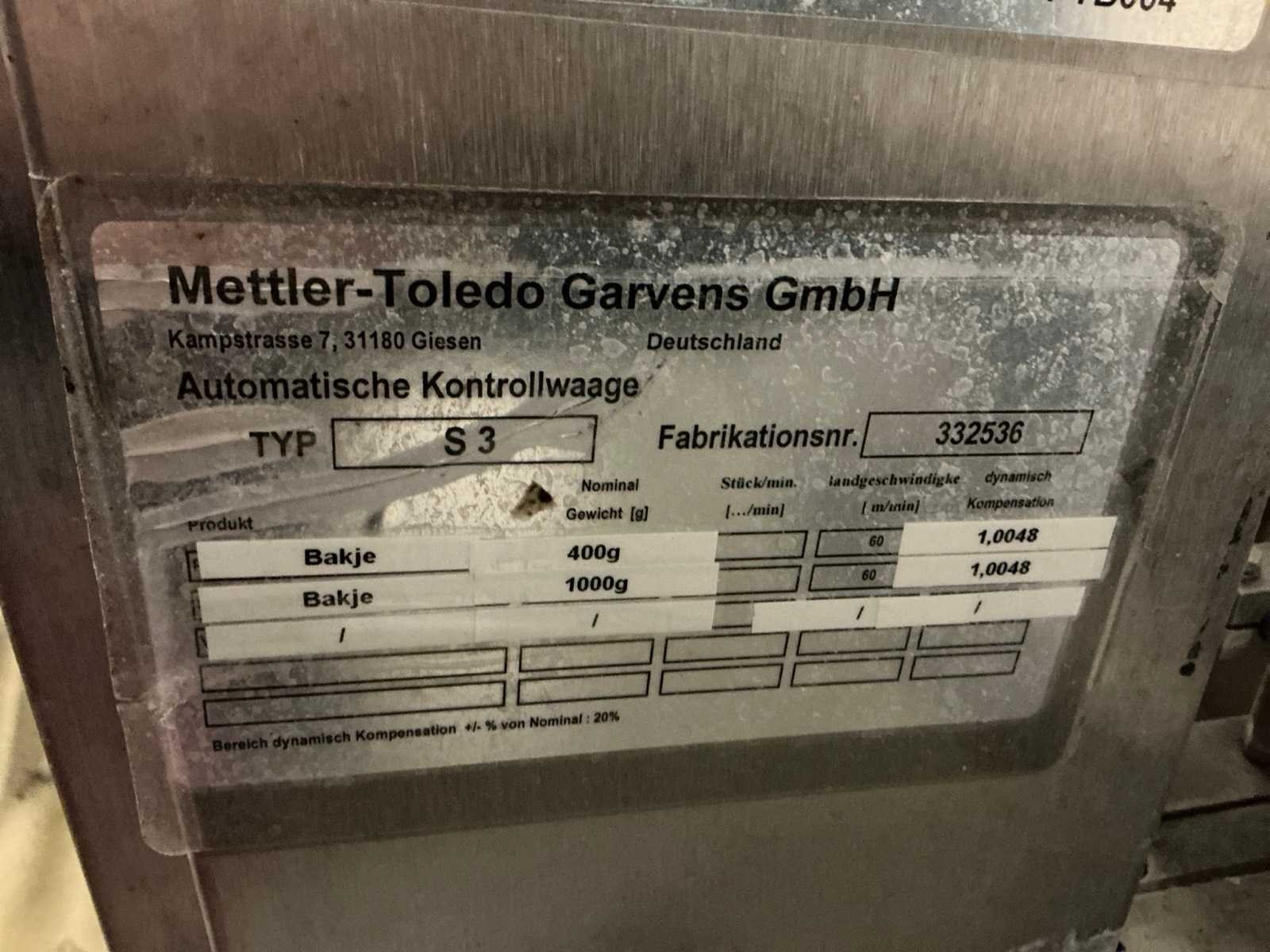 Voorzien van transportband. Nee Merk: Mettler-Toledo Type: Garvens S3 Bouwjaar: 2003 Weegbereik min.: 20g Weegbereik max: 3000g Digitale uitlezing: true Aansluiting: 230V Totale afmeting L: 1350mm Totale afmeting Breedte: 750mm Totale afmeting Hoogte: 1480mm