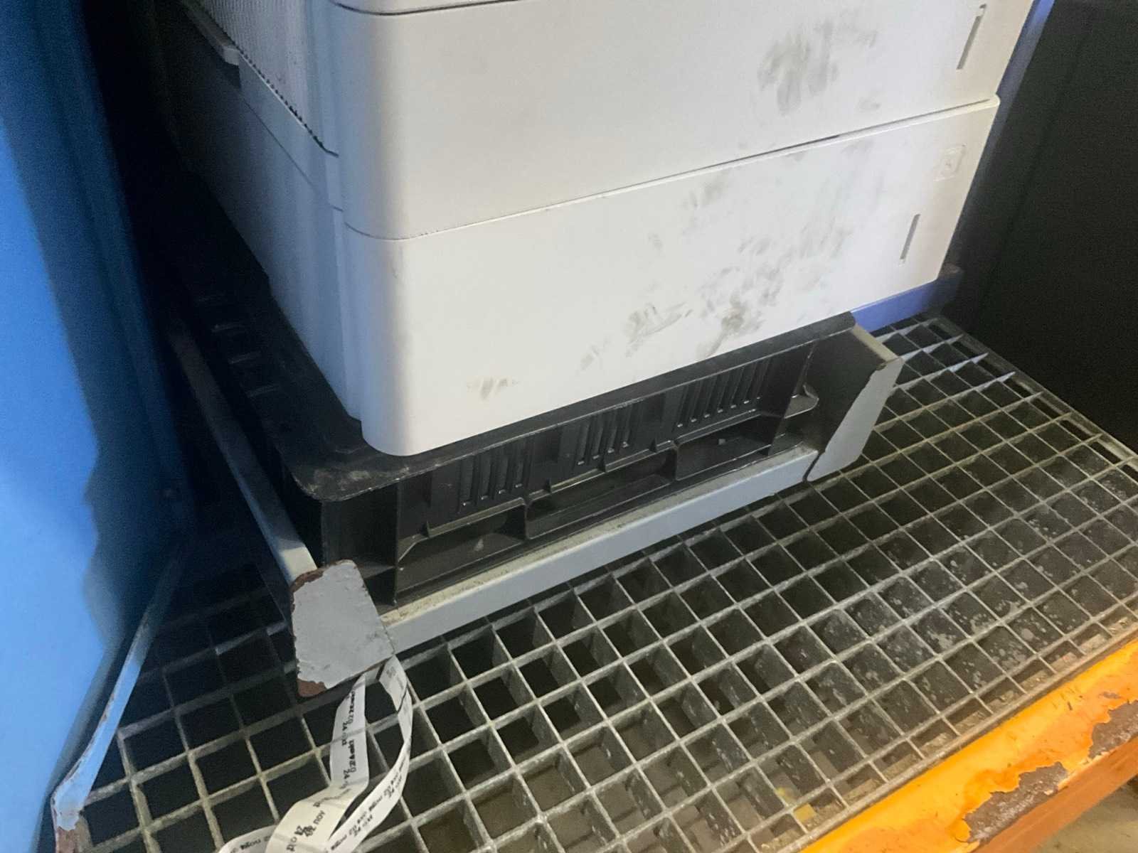 Printer HP type LaserJet Enterprise M604, compleet met werkmeubel/kast van circa 80x70x156 cm hoog voorzien van 1 deur en uittrekbaar schuifpaneel en uitschuifbaar paneel onderaan. Nee