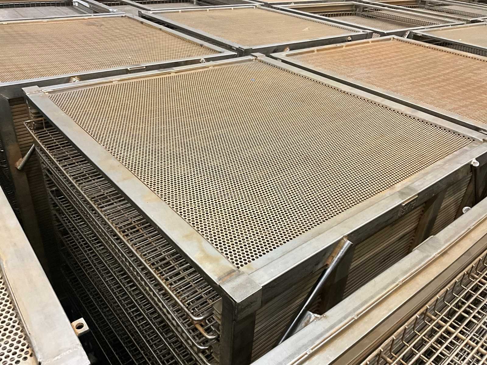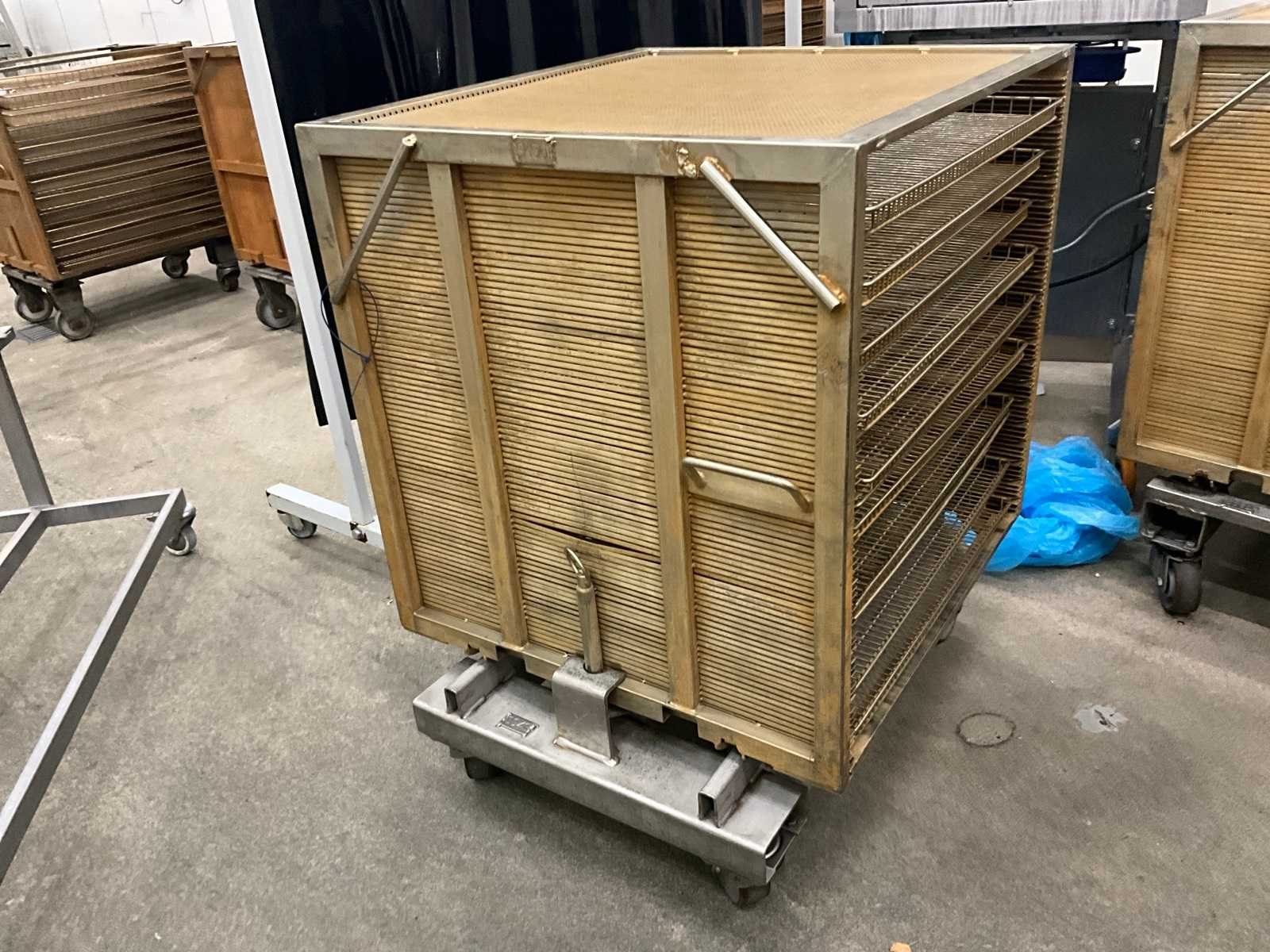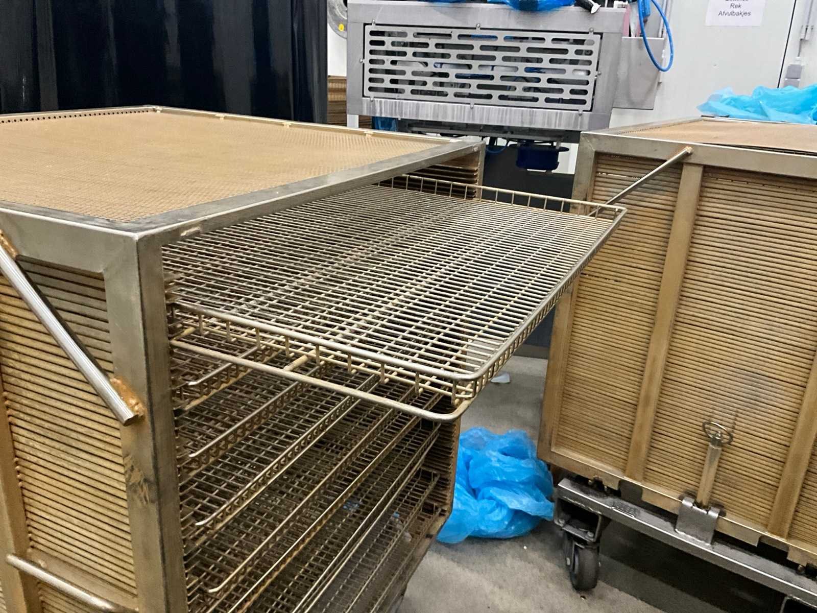 Metalen plateaukar inhoudende minimum 10 diverse roosterschalen, elk van circa 82 x 80 x 3,5 cm hoog, in diverse motieven. Deze kar is voorzien van vaste geroosterde bovenkant ! Afmeting elke kar : 86 x 82 x 115 cm. hoog. Voorzien van 2 zwenkwielen en 2 vaste wielen. Nee