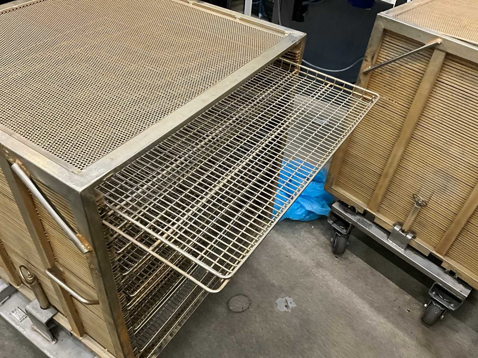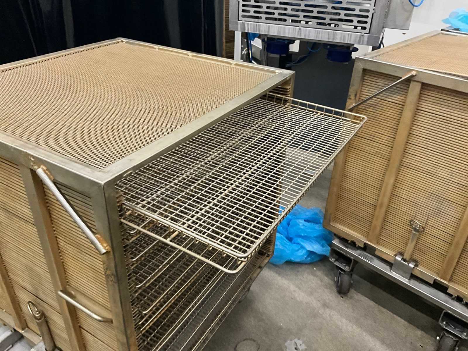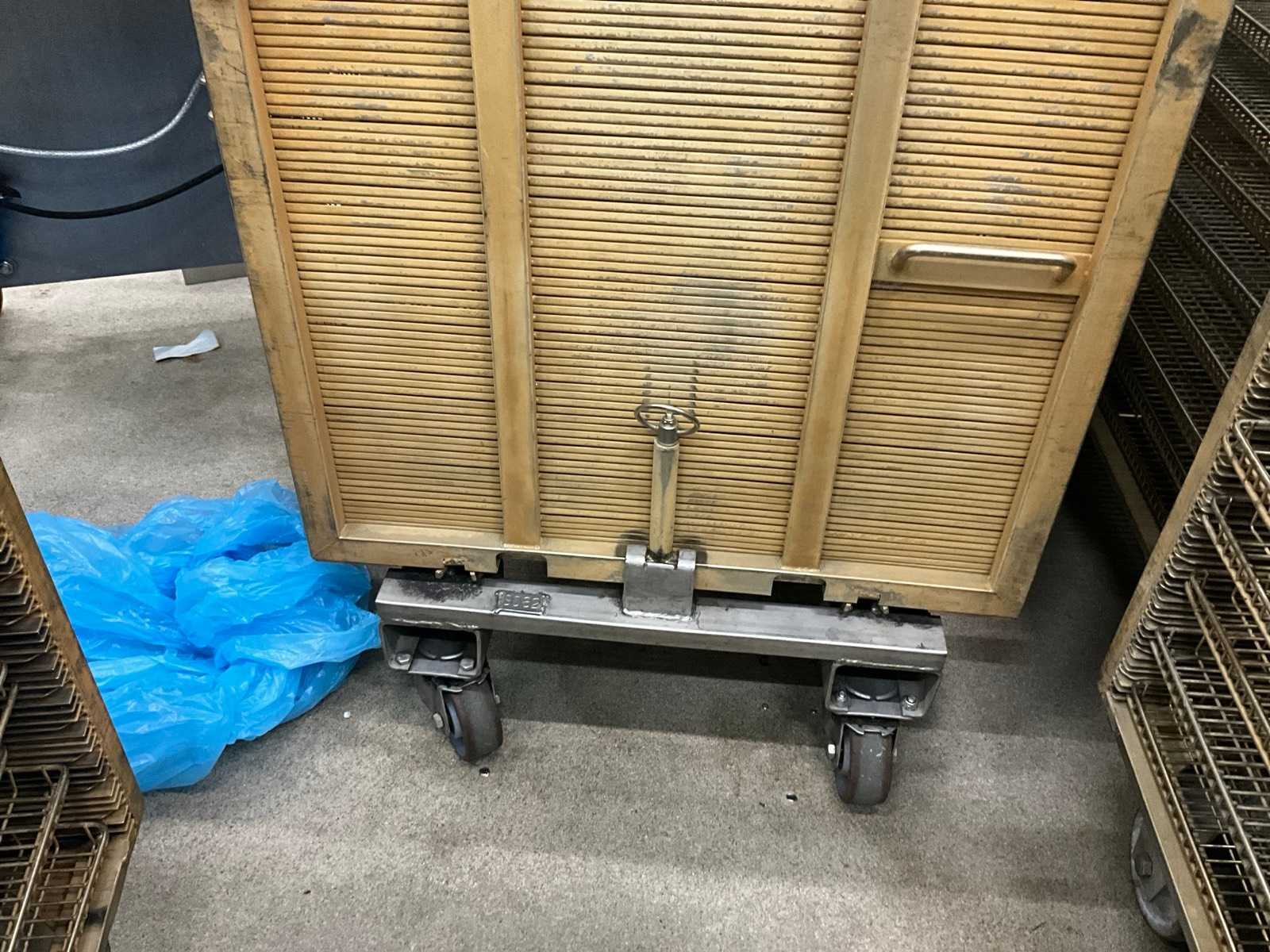 Metalen plateaukar inhoudende minimum 10 diverse roosterschalen, elk van circa 82 x 80 x 3,5 cm hoog, in diverse motieven. Deze kar is voorzien van vaste geroosterde bovenkant ! Afmeting elke kar : 86 x 82 x 115 cm. hoog. Voorzien van 2 zwenkwielen en 2 vaste wielen. Nee