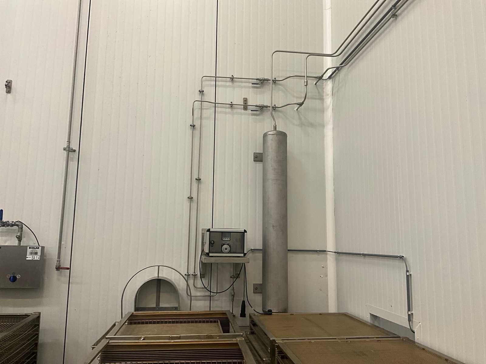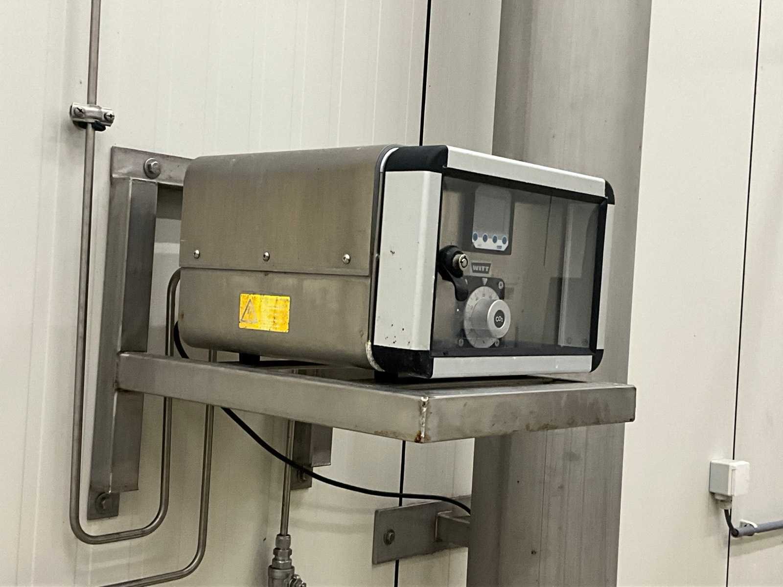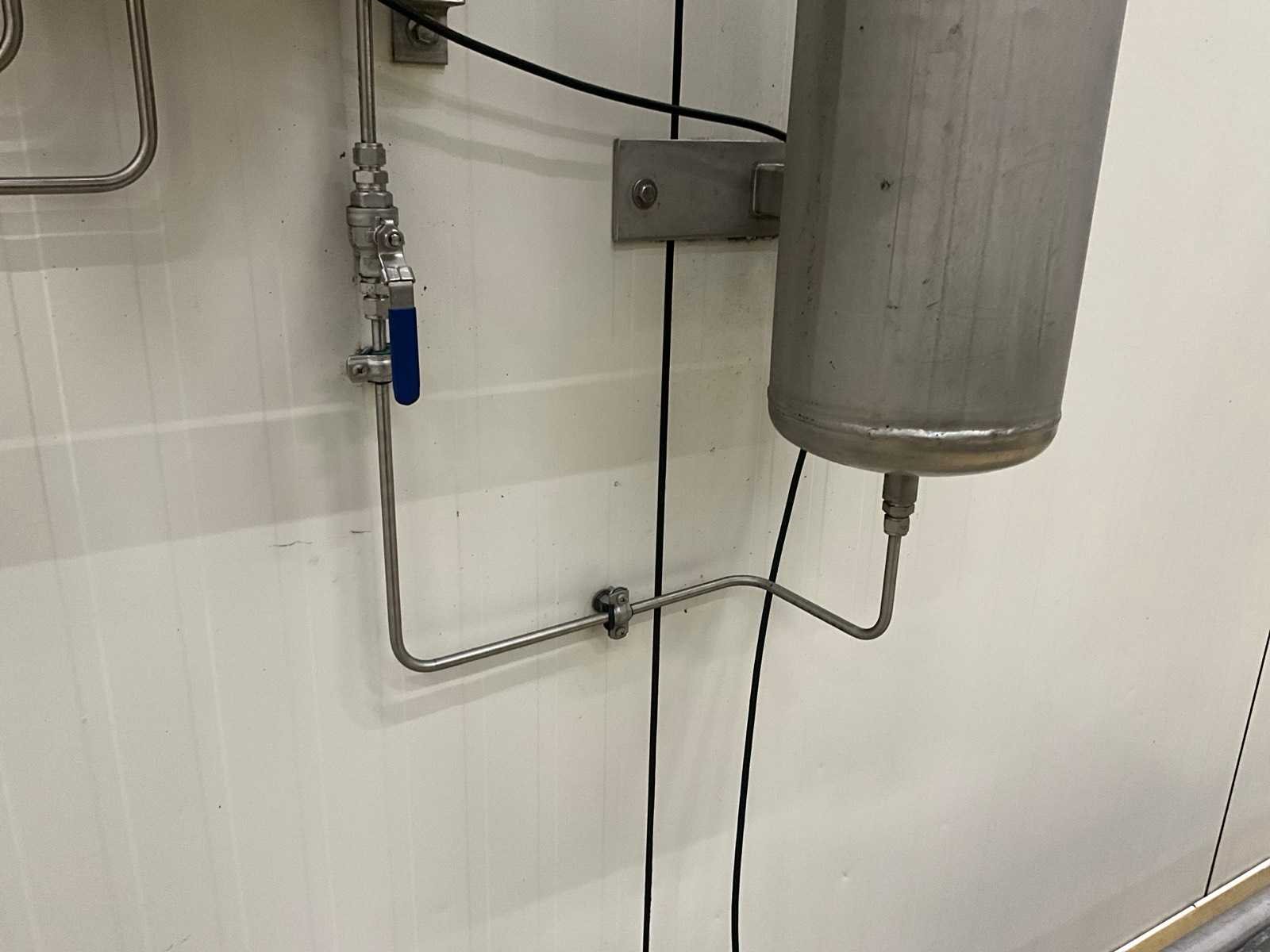 Elektronische menger voor 2 gassen met motorgestuurde mengventieltechniek, op rvs wandhouder (dmv bouten in muur), compleet met drukvat van circa 155 cm hoog met 22 cm diameter, aan muur bevestigd. Nee Merk: WITT Type: KME100-2MEM+ Bouwjaar: 2020
