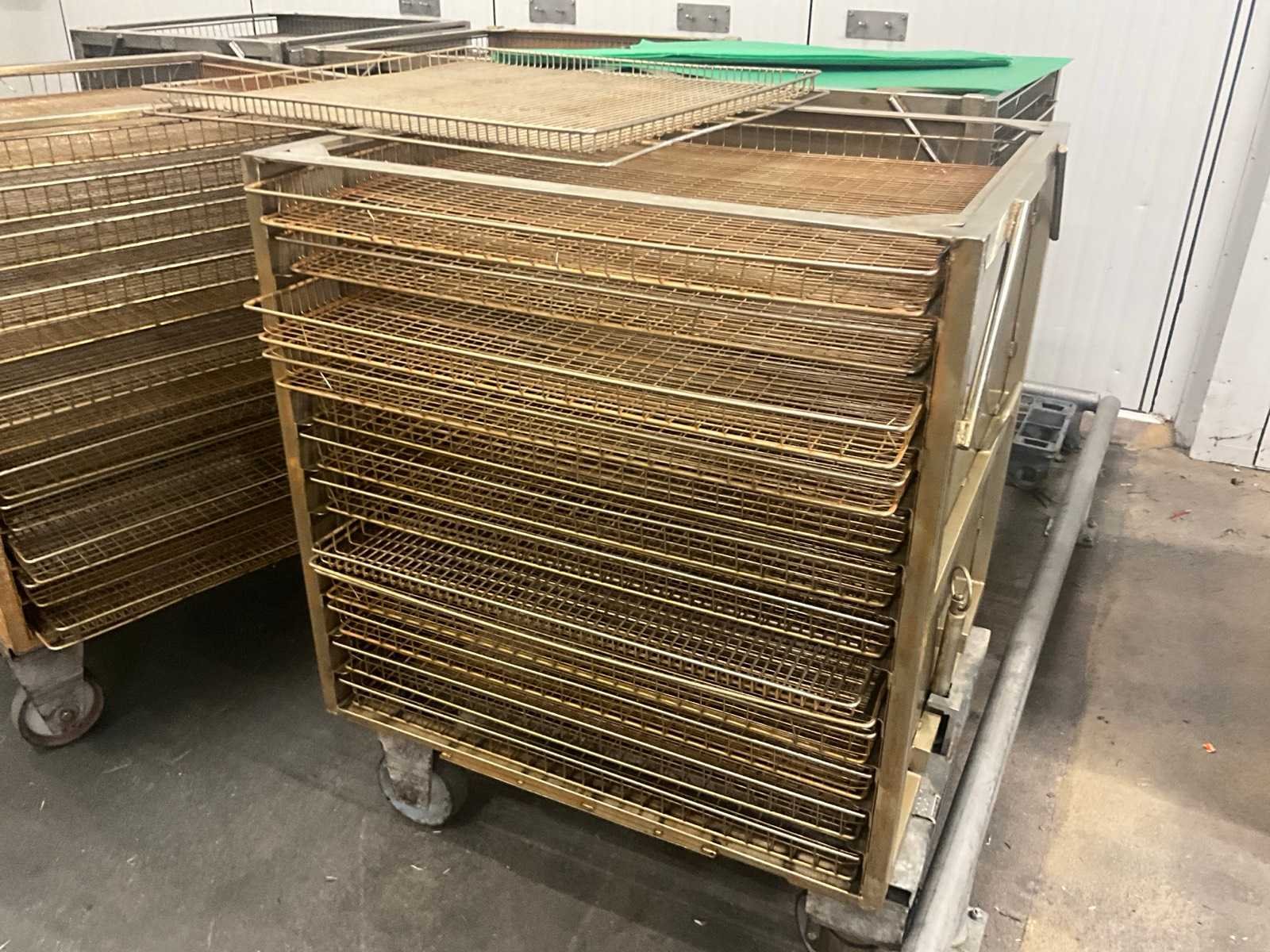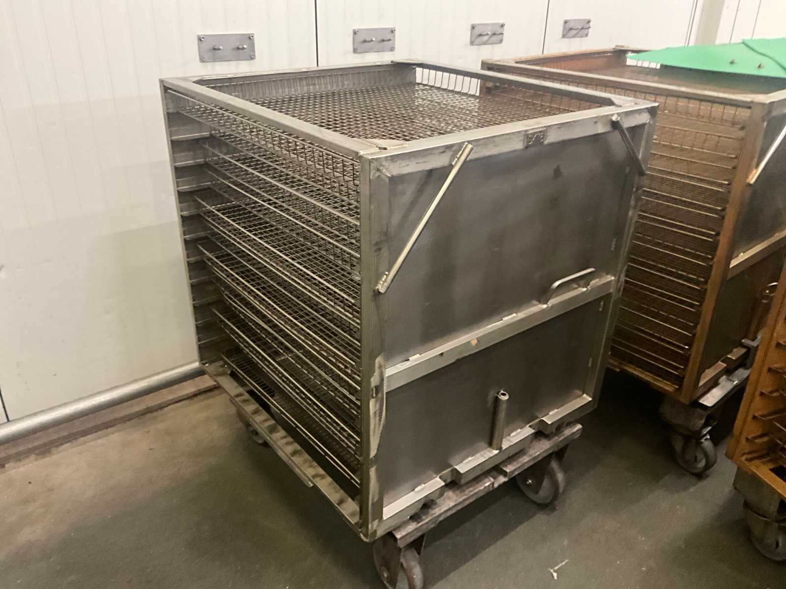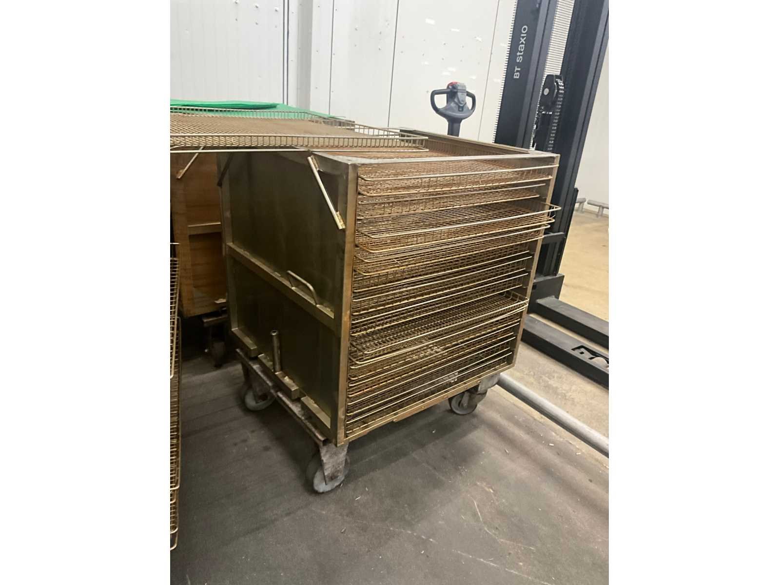 Metalen plateaukar inhoudende minimum 10 diverse roosterschalen, elk van circa 82 x 80 x 3,5 cm hoog, in diverse motieven. Deze karren in diverse uitvoeringen. Afmeting elke kar : 86 x 82 x 115 cm. hoog. Voorzien van 2 zwenkwielen en 2 vaste wielen. Nee