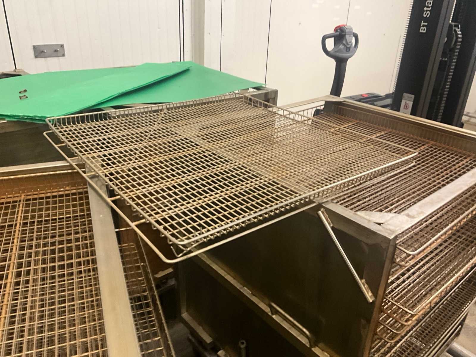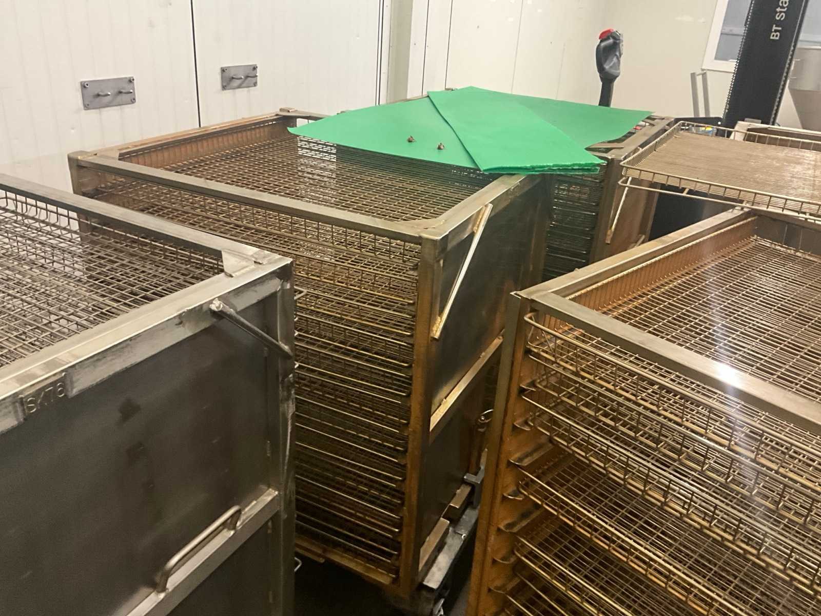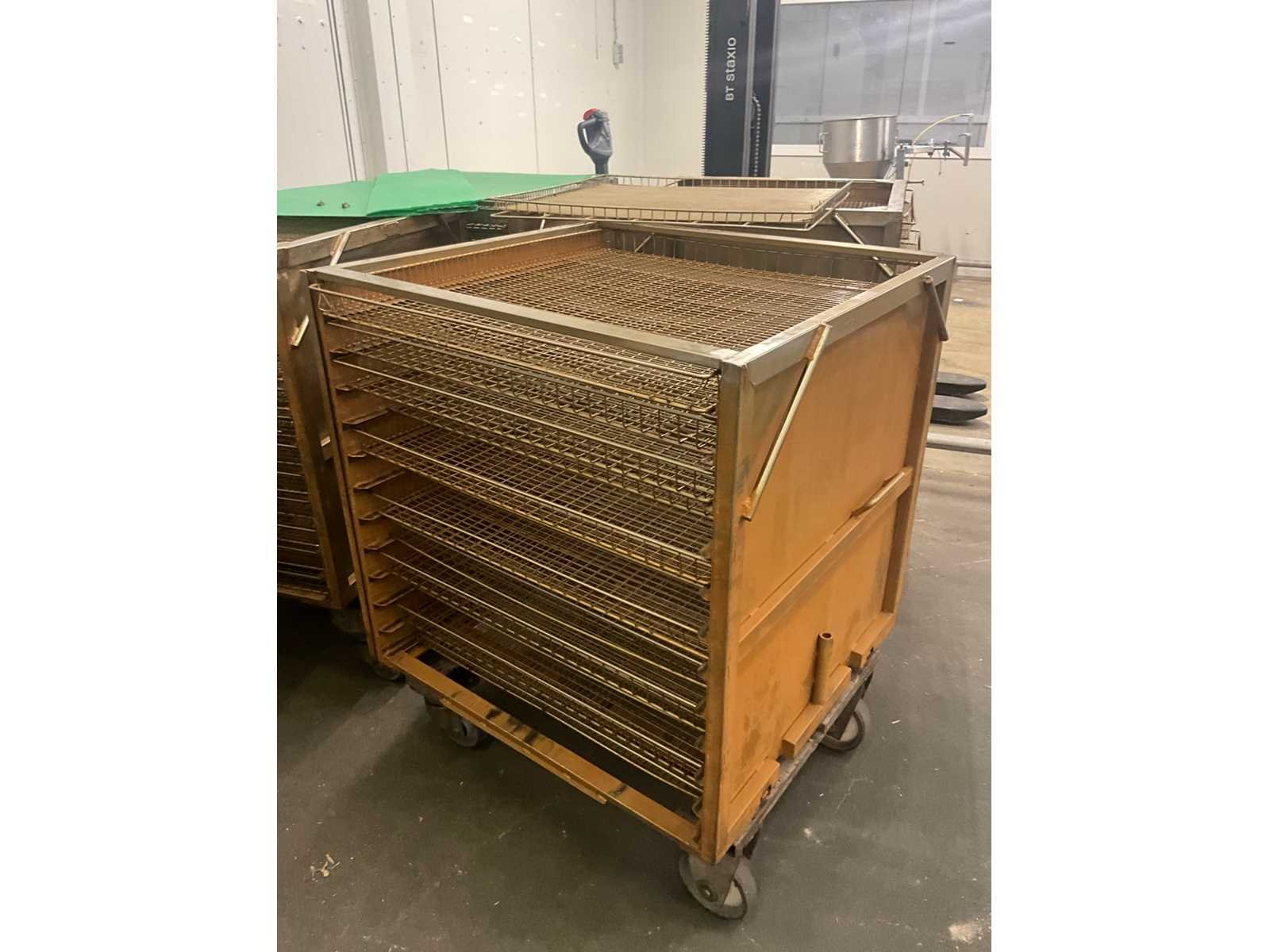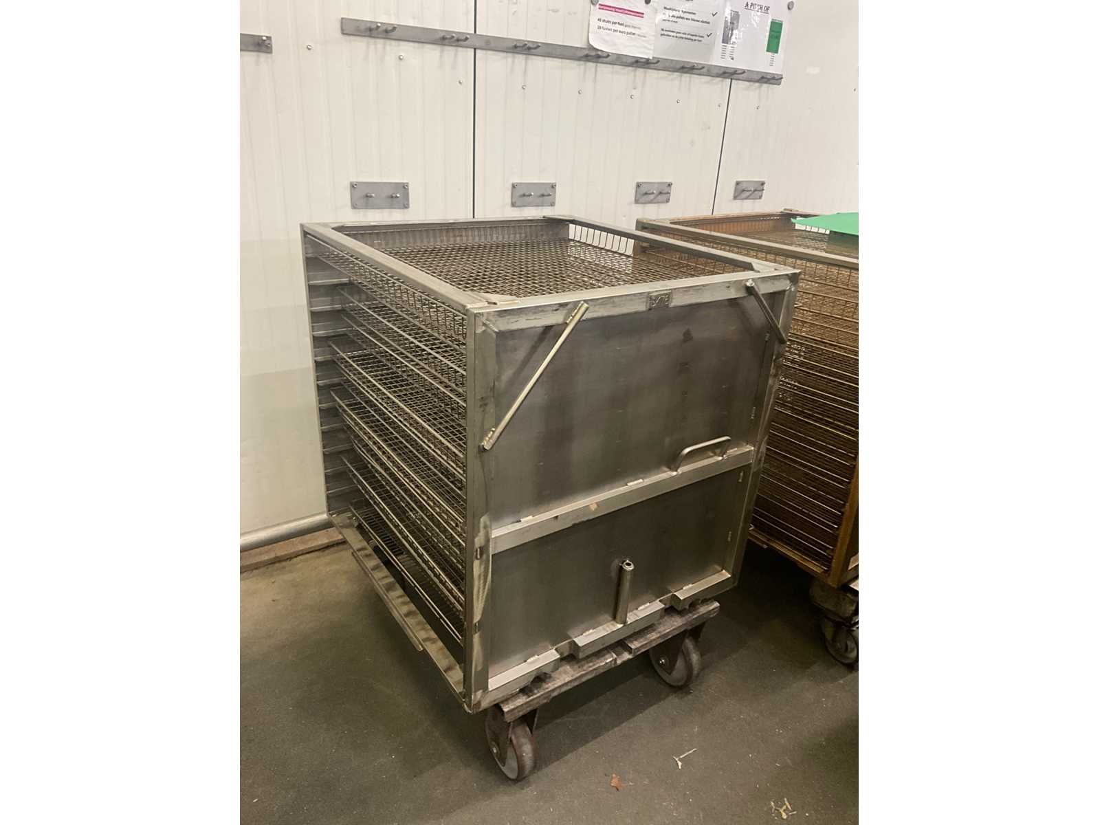 Metalen plateaukar inhoudende minimum 10 diverse roosterschalen, elk van circa 82 x 80 x 3,5 cm hoog, in diverse motieven. Deze karren in diverse uitvoeringen. Afmeting elke kar : 86 x 82 x 115 cm. hoog. Voorzien van 2 zwenkwielen en 2 vaste wielen. Nee