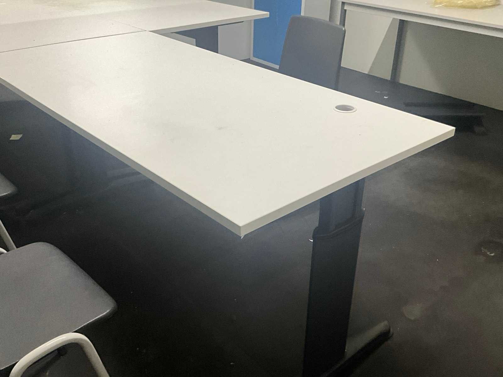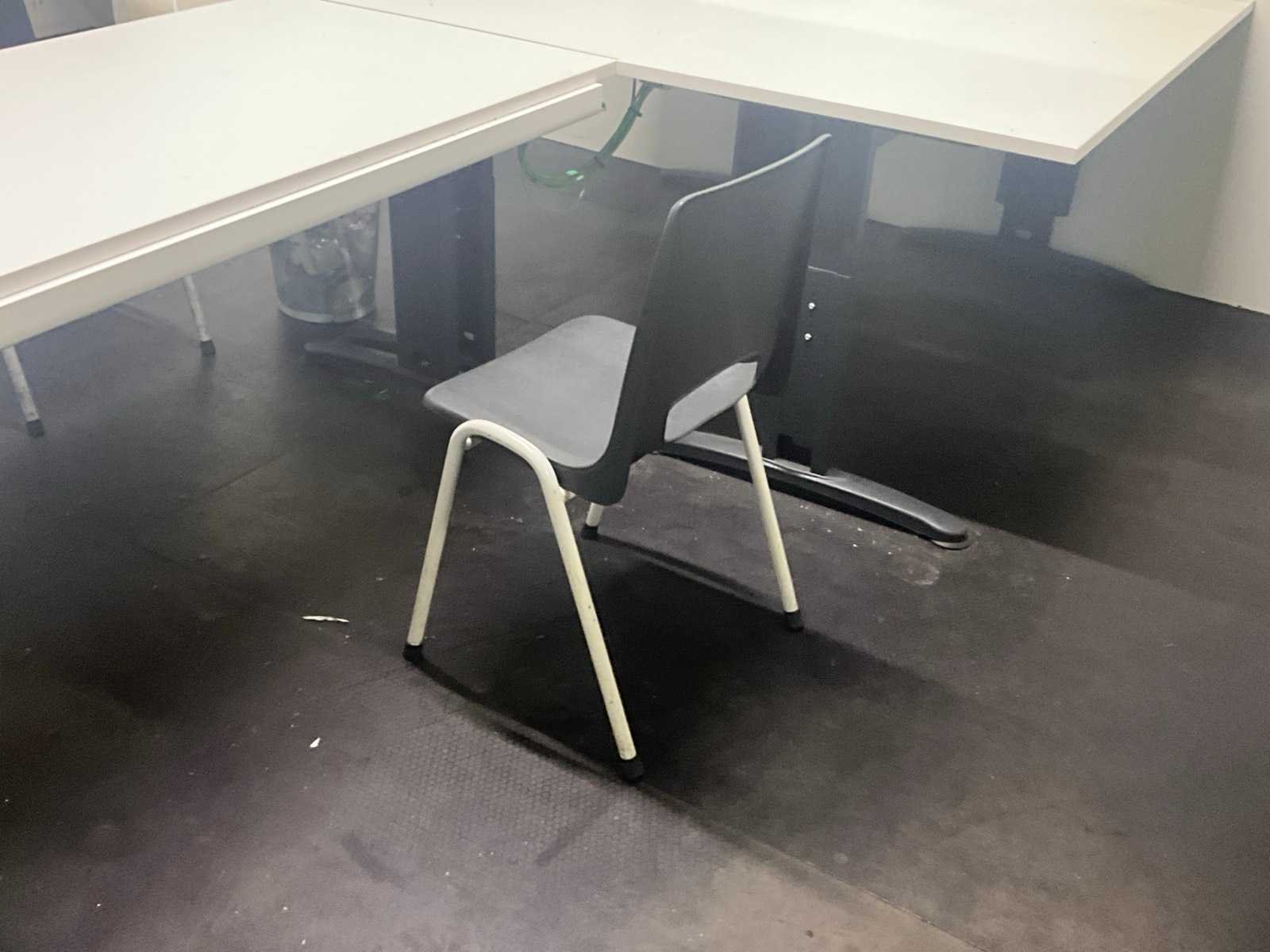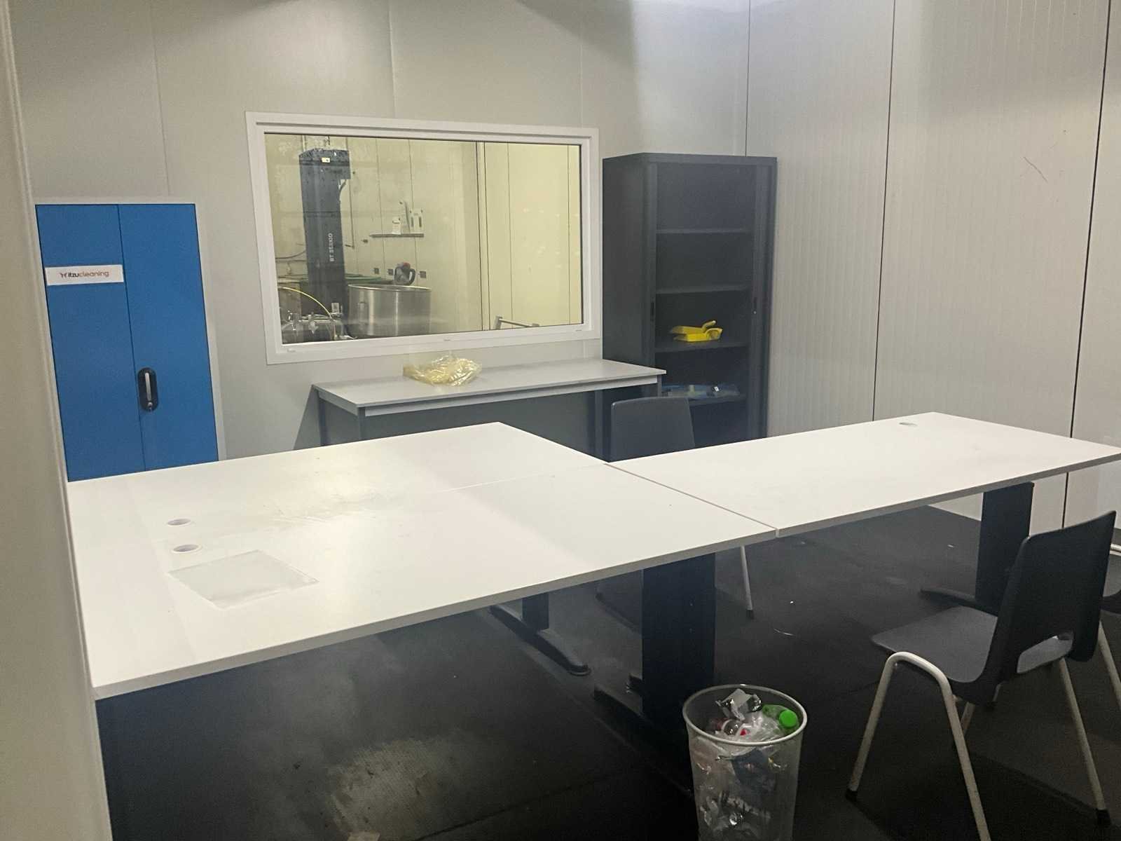Waaronder 3 bureeltafels 160 x 80 cm, 2x bijzettafel 180 x 80 cm, dossierkast met rolluikdeuren, 3 bijzetstoelen, 6 design verlichtingspanelen 1x1 m, door koper te demonteren van plafond. UITGEZONDERD blauwe opbergkast in de hoek ! No