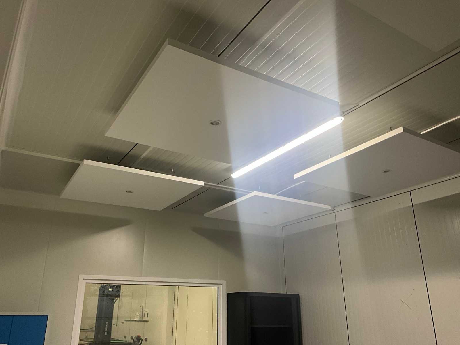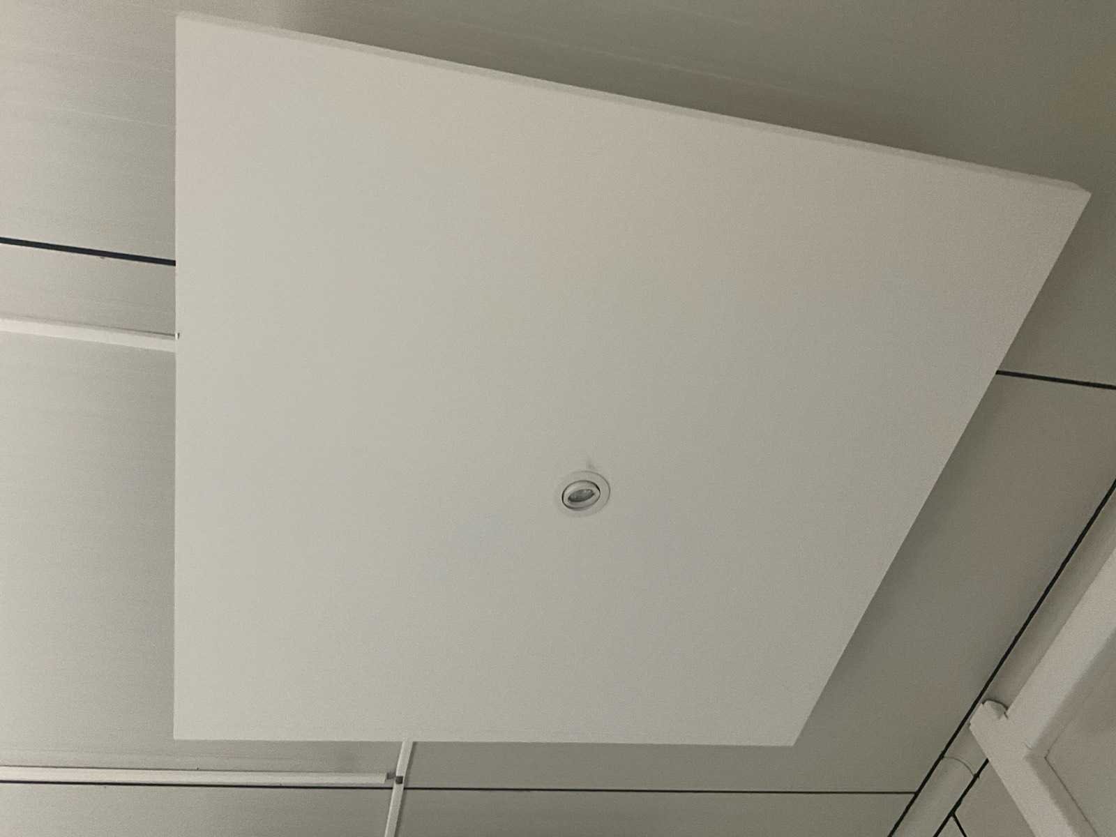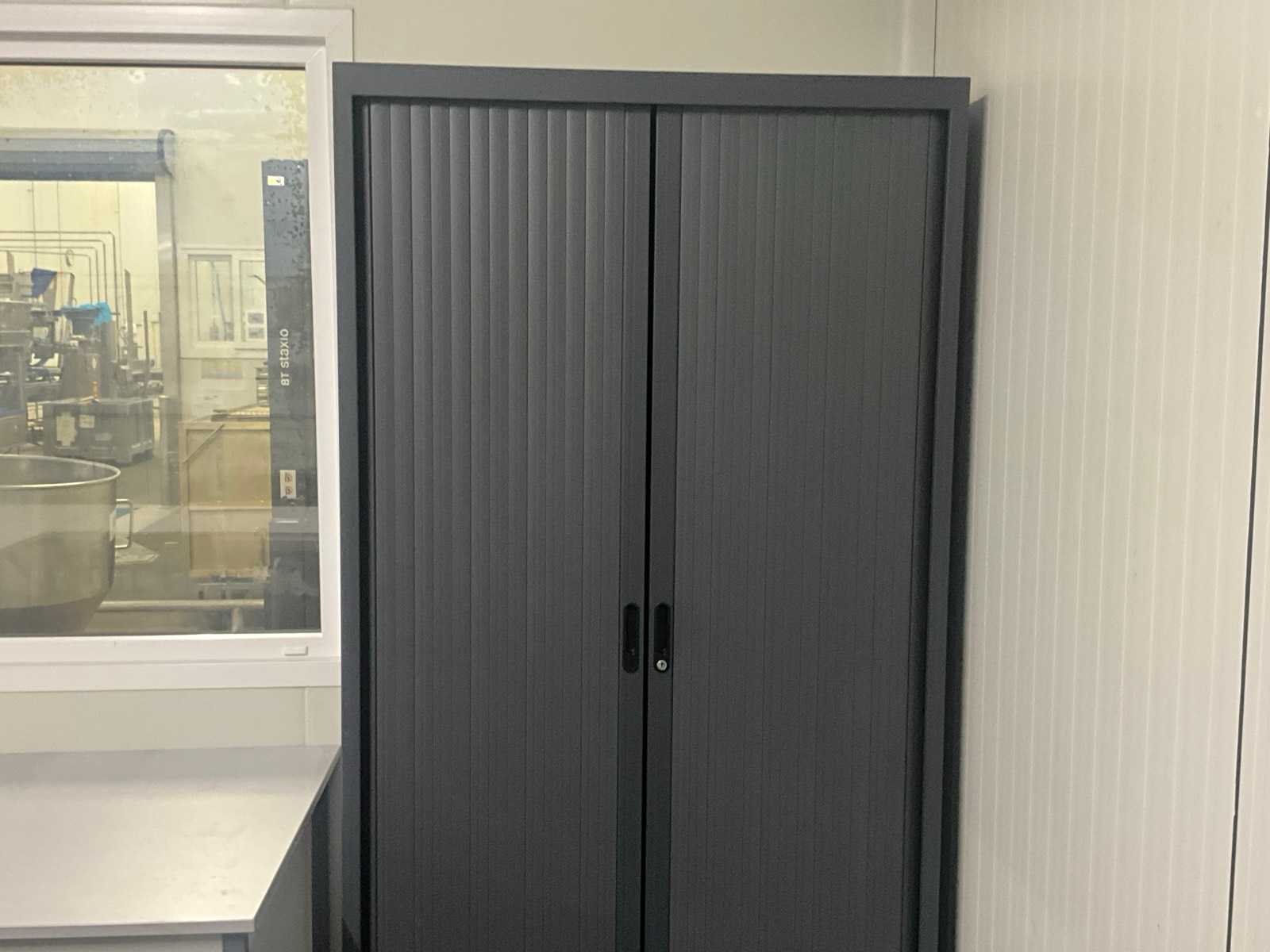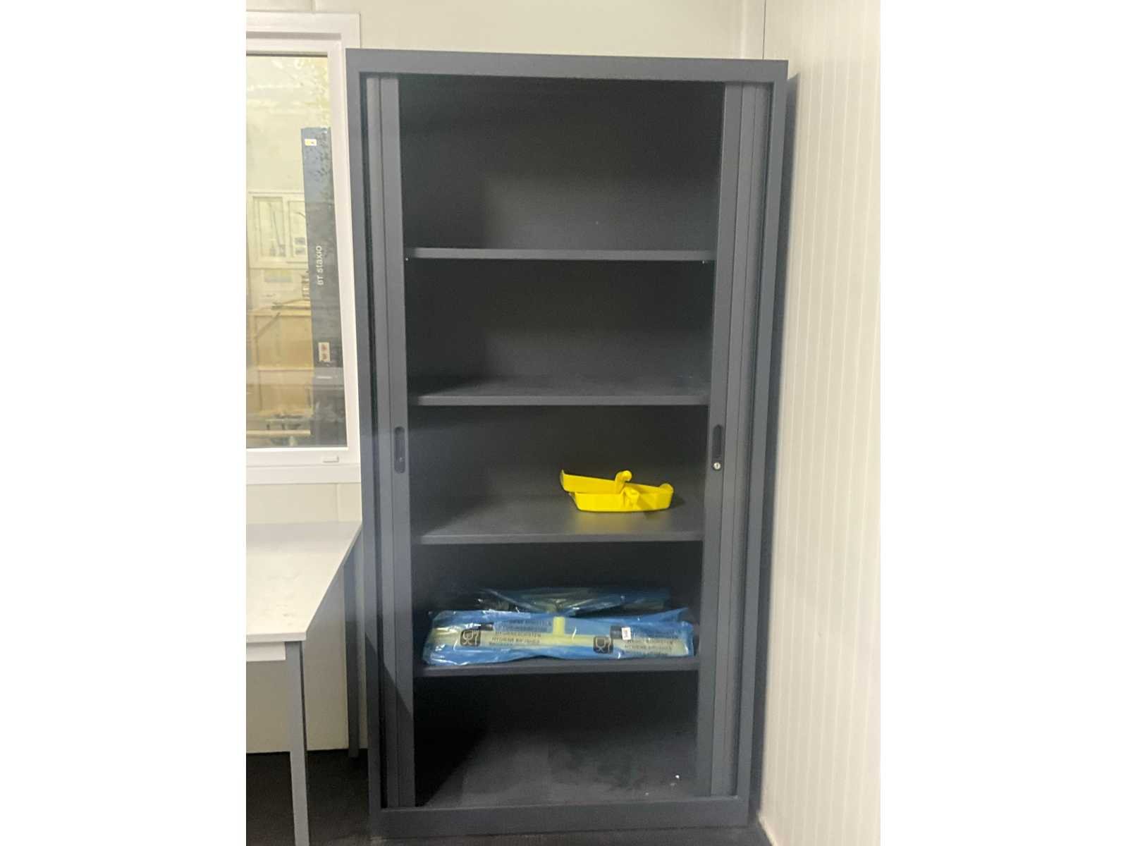 Waaronder 3 bureeltafels 160 x 80 cm, 2x bijzettafel 180 x 80 cm, dossierkast met rolluikdeuren, 3 bijzetstoelen, 6 design verlichtingspanelen 1x1 m, door koper te demonteren van plafond. UITGEZONDERD blauwe opbergkast in de hoek ! No
