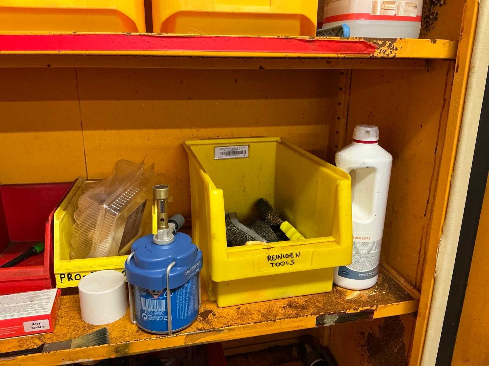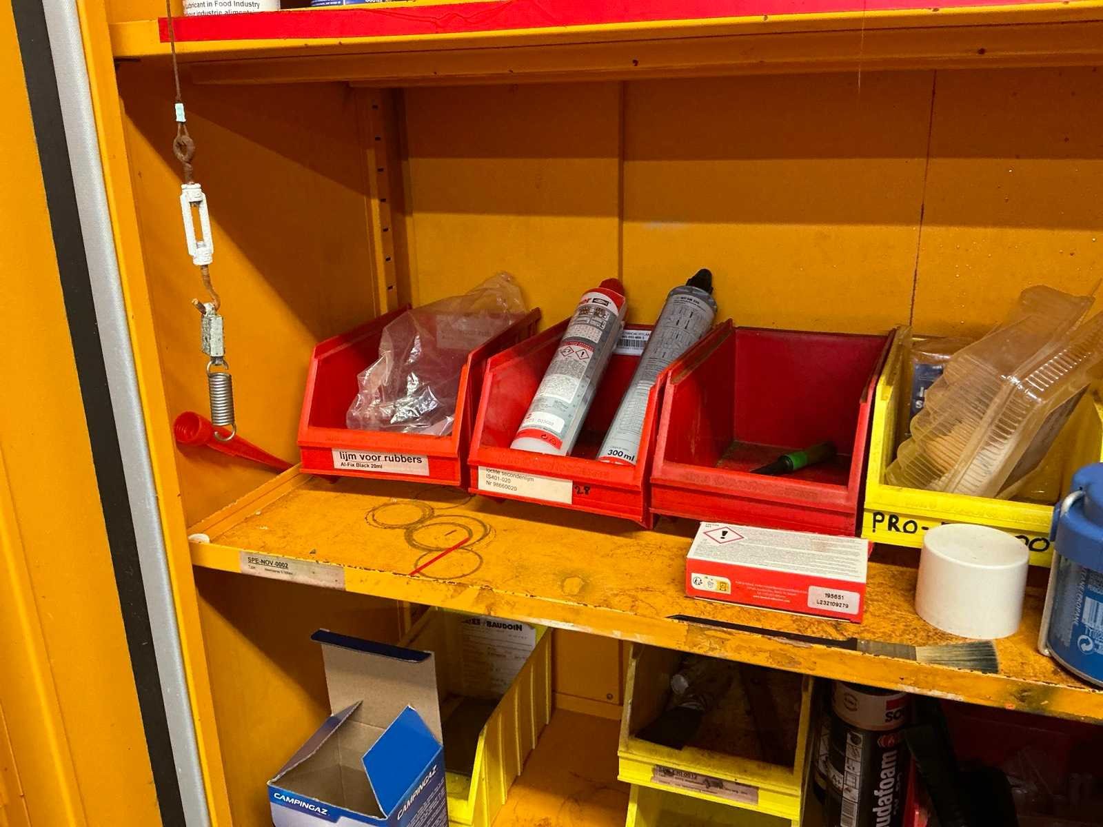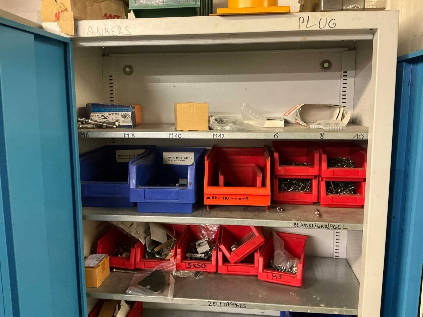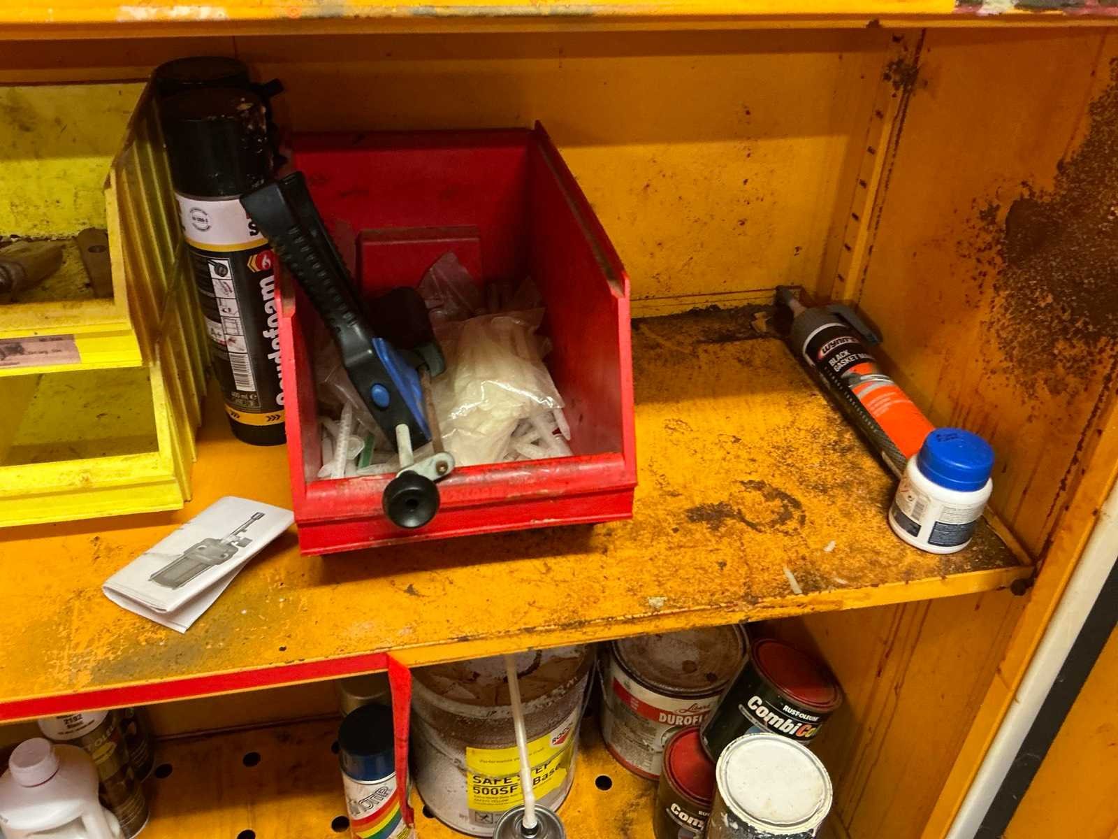 Compleet met metalen opbergkast met afmetingen ca. 70 x 30 x 200cm. Allen met inhoud waaronder diverse verfproducten en bevestigingsmaterialen. Nee Lengte: 62cm Breedte: 117cm Hoogte: 196cm