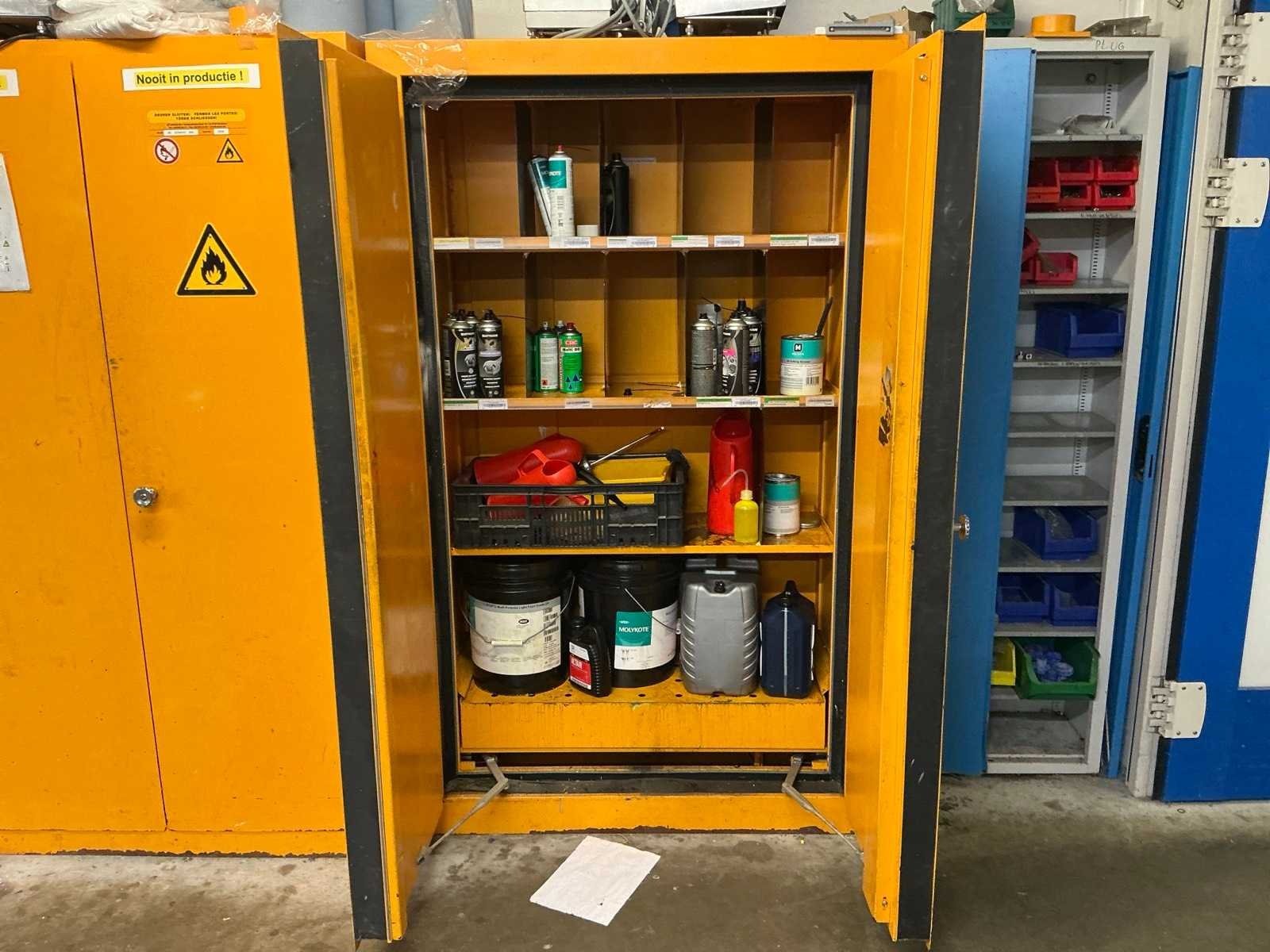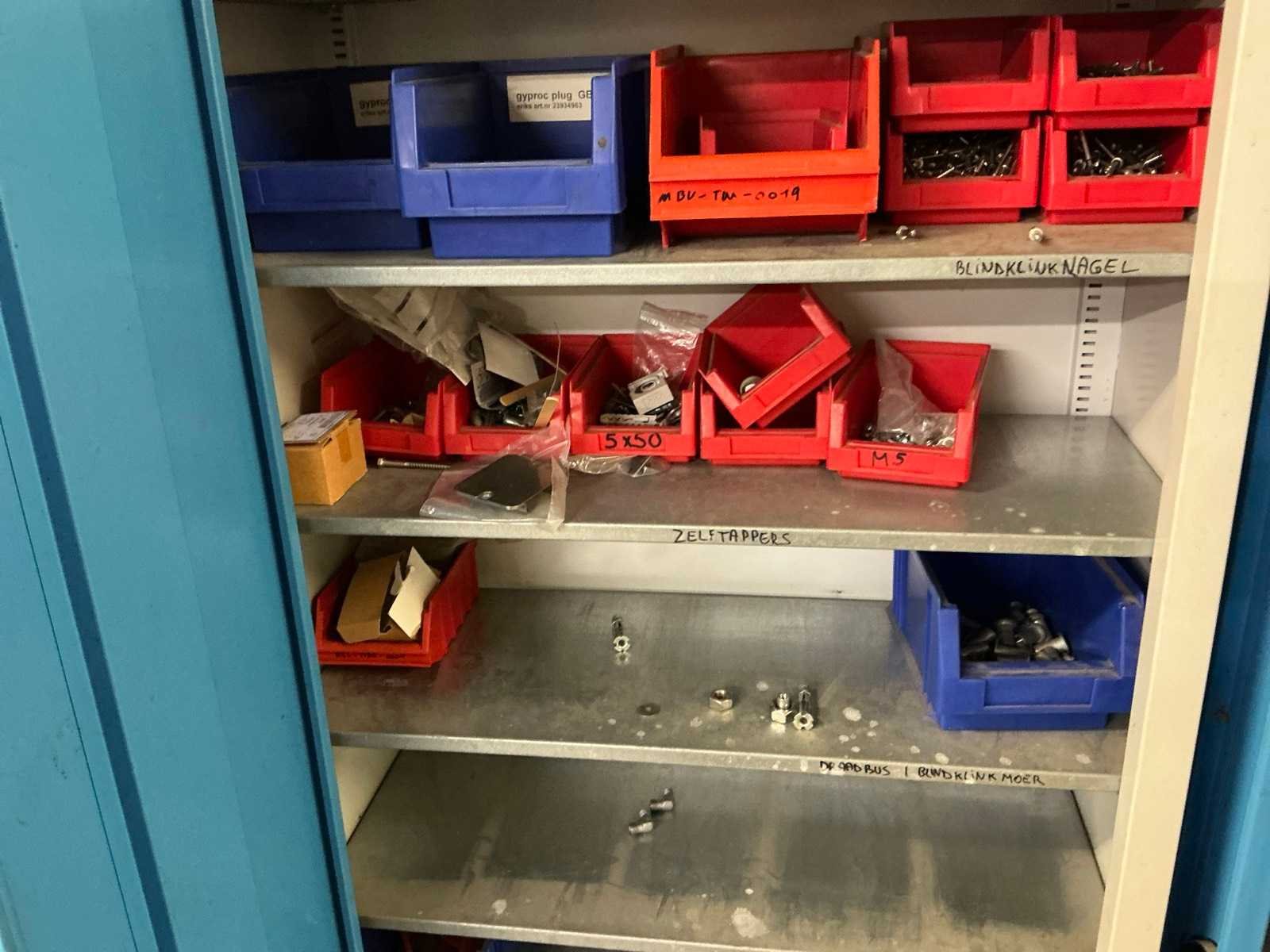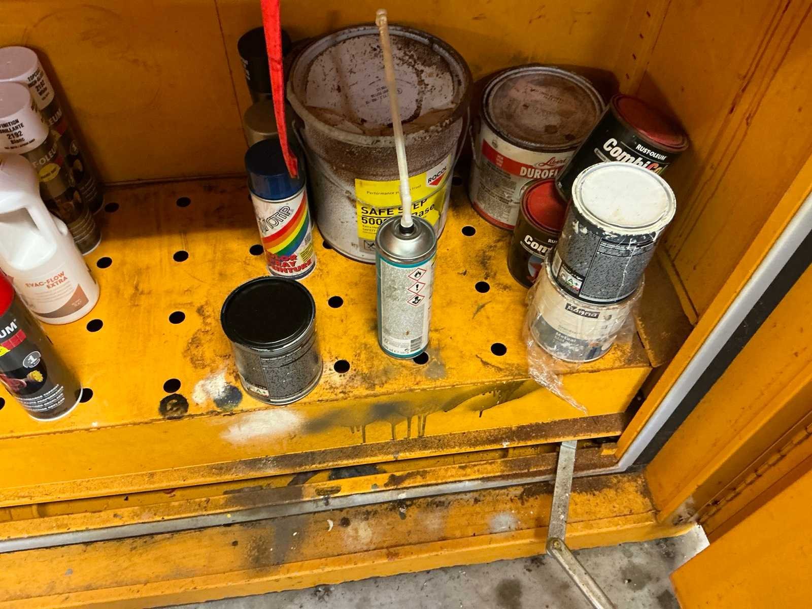 Compleet met metalen opbergkast met afmetingen ca. 70 x 30 x 200cm. Allen met inhoud waaronder diverse verfproducten en bevestigingsmaterialen. Nee Lengte: 62cm Breedte: 117cm Hoogte: 196cm