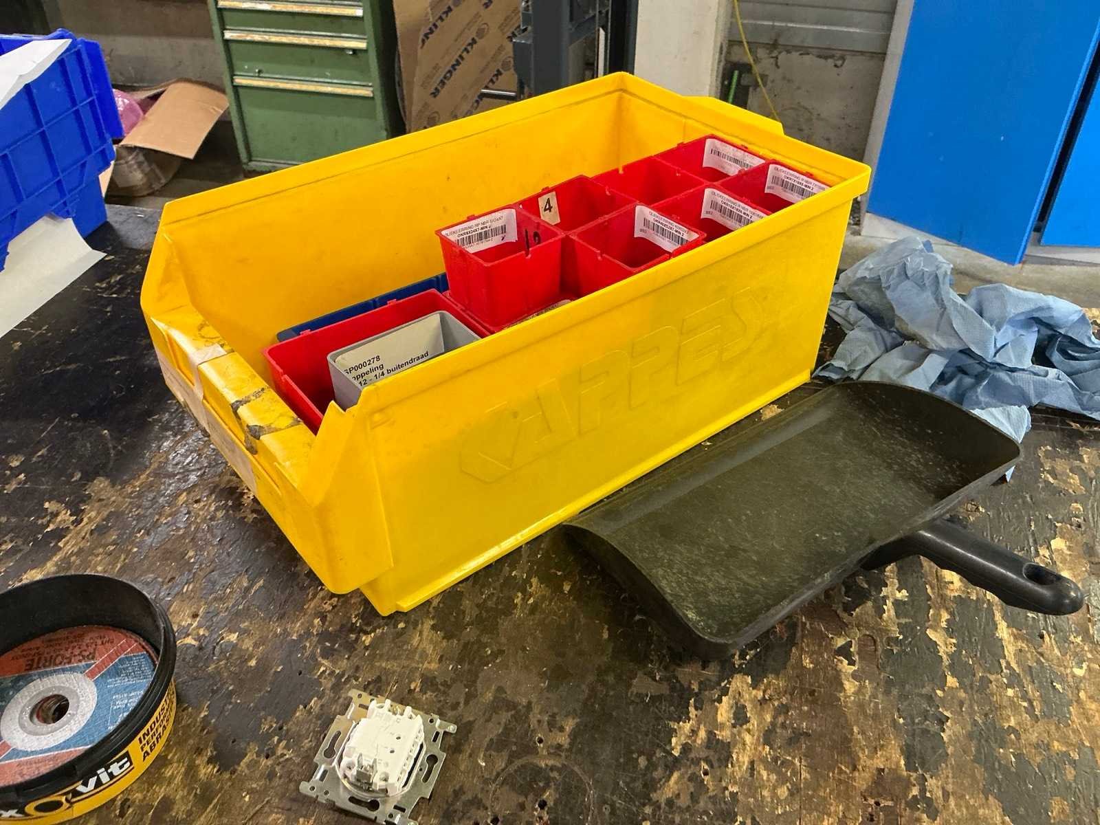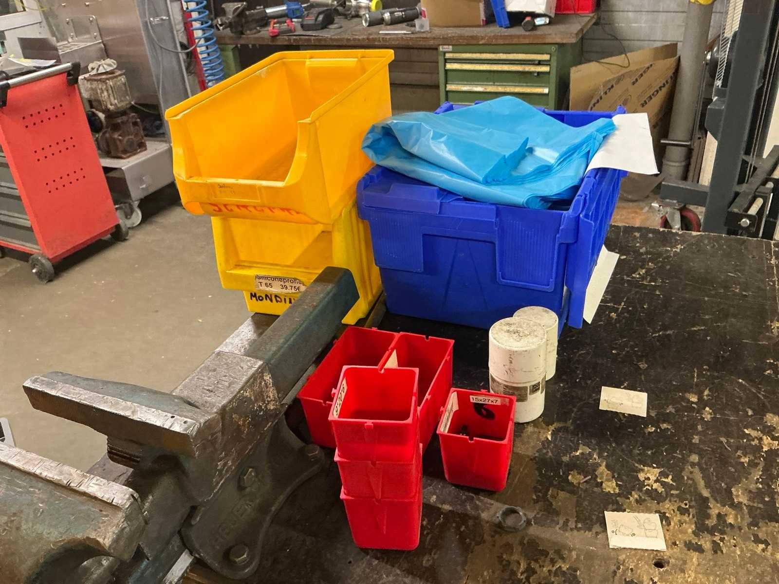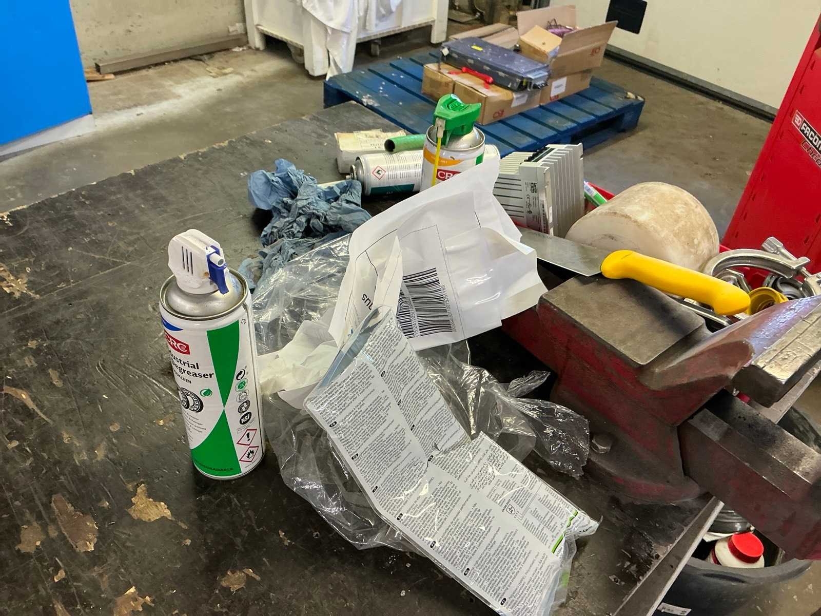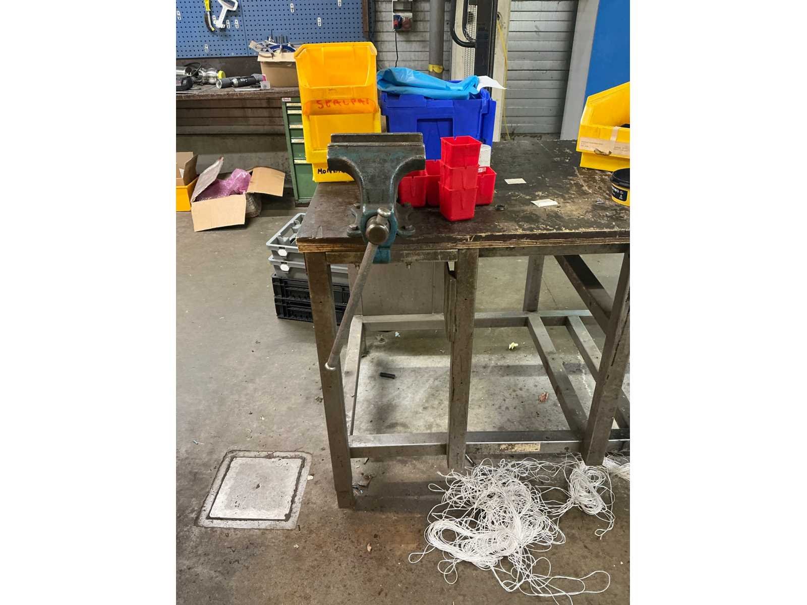 Voorzien van rvs metalen onderstel en houten bovenblad. Voorzien van 2x bankschroef. Compleet met enige pvc opbergbakken. Afgifte volgens aanwijzing. Door koper zelf te verwijderen uit het pand. Nee Lengte: 85cm Breedte: 240cm Hoogte: 93cm