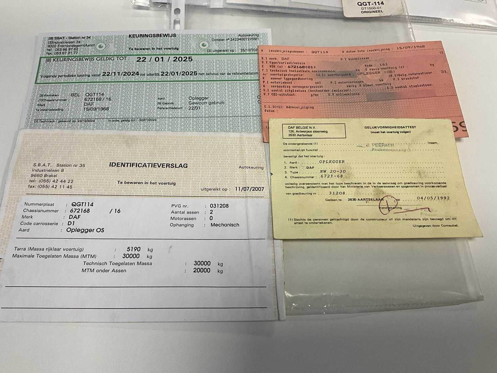 Voorzien van laadvloer 1400 mm, bladgeveerd, Belgische boord documenten compleet, ZONDER LADING!! Nee Merk: Daf Type: NW20-30 Type aanhangwagencarrosserie: Open Aanhangwagen Bouwjaar: 1968 Chassisnummer VIN: 6721-68 Datum eerste toelating: 15-09-1968 Aantal assen: 2 Laadvermogen: 30000kg Eigen gewicht: 5190kg Totale afmeting Breedte: 2550mm Totale afmeting Hoogte: 1500mm