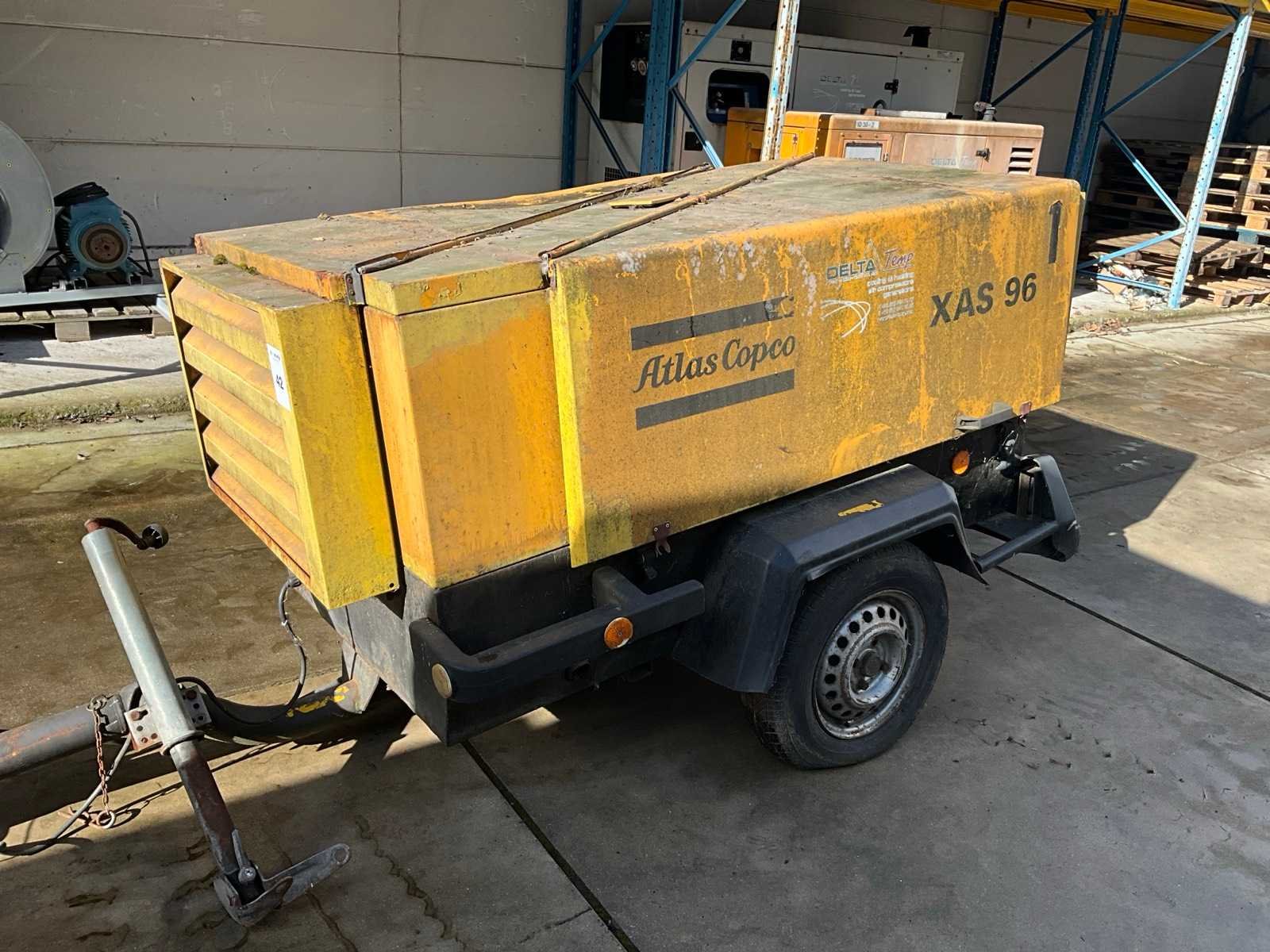 Werking niet gekend, Voorzien van 3-cilinder Deutz dieselmotor, enkele as met oplooprem, boltrekhaak, werkuren niet leesbaar Nee Merk: Atlas Copco Type: XAS96 Totale afmeting L: 3600mm Totale afmeting Breedte: 1400mm Totale afmeting Hoogte: 1300mm