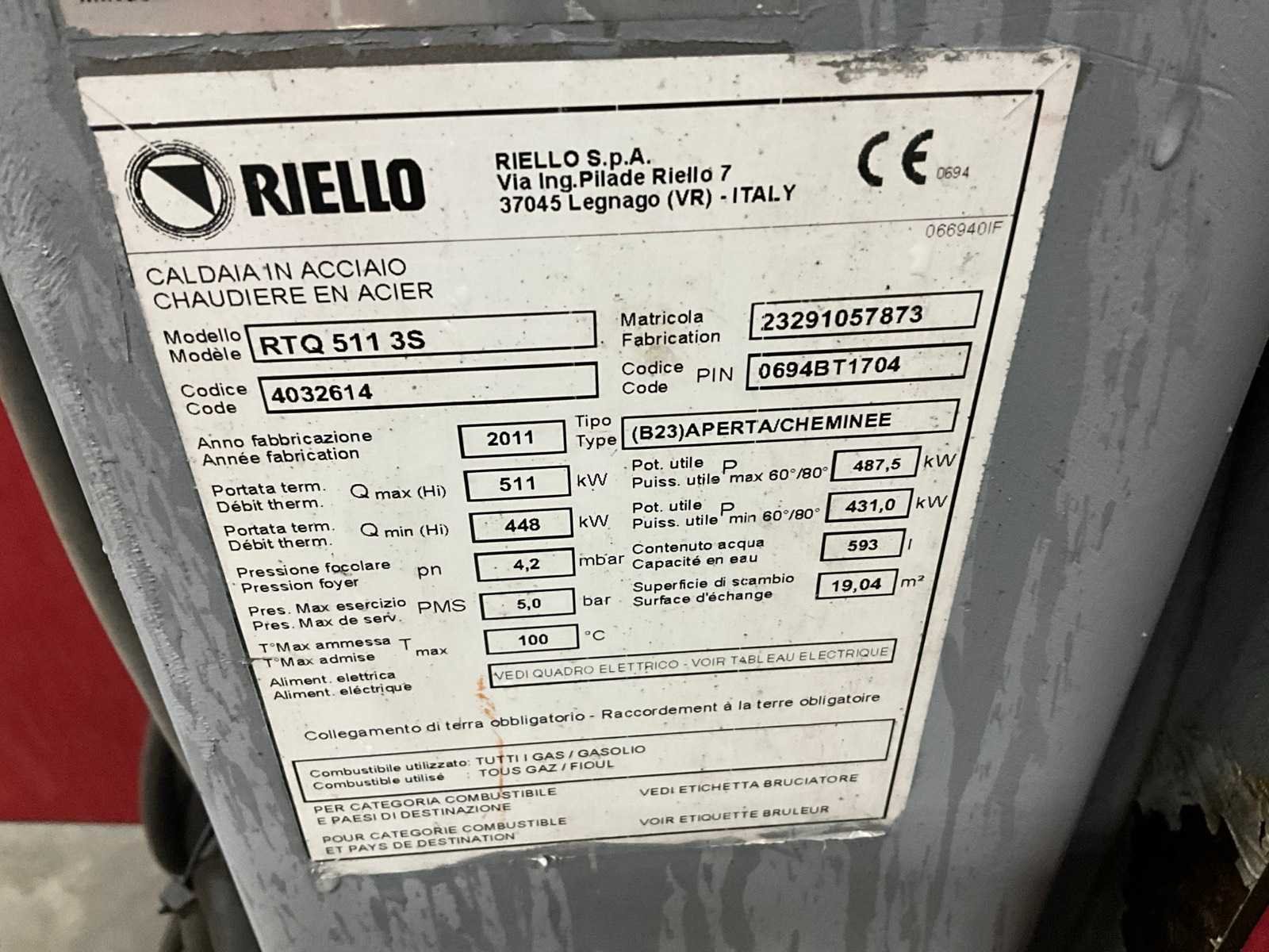 Voorzien van aanzuigslang brandstof Nee Merk: Riello Type: B450-03 Bouwjaar: 2011 Serienummer: 23291057873 Oliegestookt: true Capaciteit.: 448kW Maximale werkdruk: 4bar Brander merk + type: Riello RS30elu Schakelkast opgebouwd: true Aansluiting: 400V Totale afmeting L: 2600mm Totale afmeting Breedte: 1200mm Totale afmeting Hoogte: 1700mm