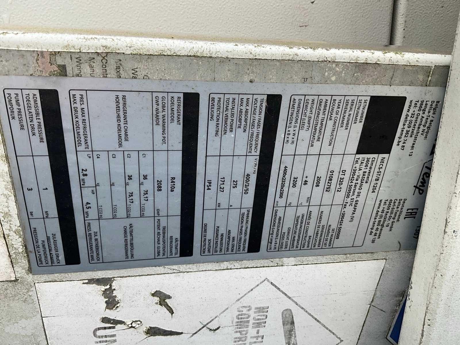 171,27 kw, voorzien van 6x ventilator, bouwer koppeling in en out 4’’, transport frame Nee Merk: Climaveneta Type: DT320-12 Bouwjaar: 2008 Serienummer: 1082752 Eigen gewicht: 3600kg Totale afmeting L: 4200mm Totale afmeting Breedte: 2250mm Totale afmeting Hoogte: 2000mm
