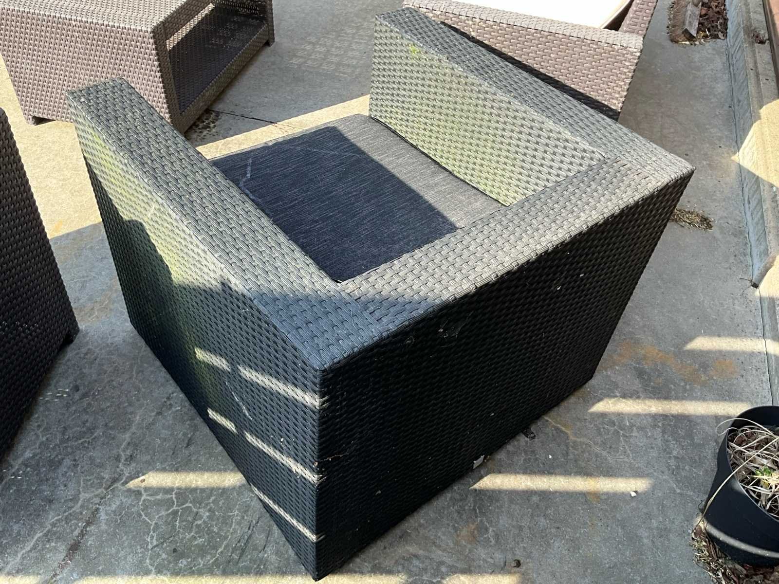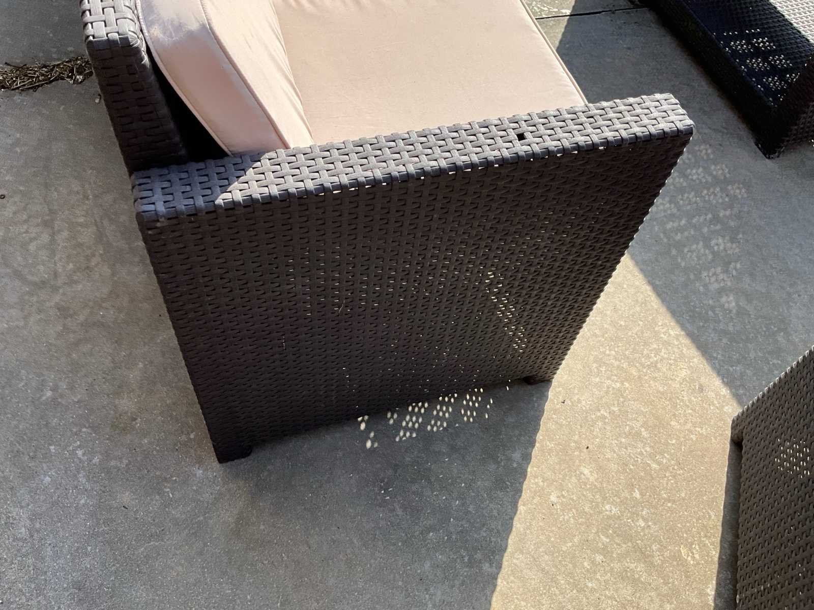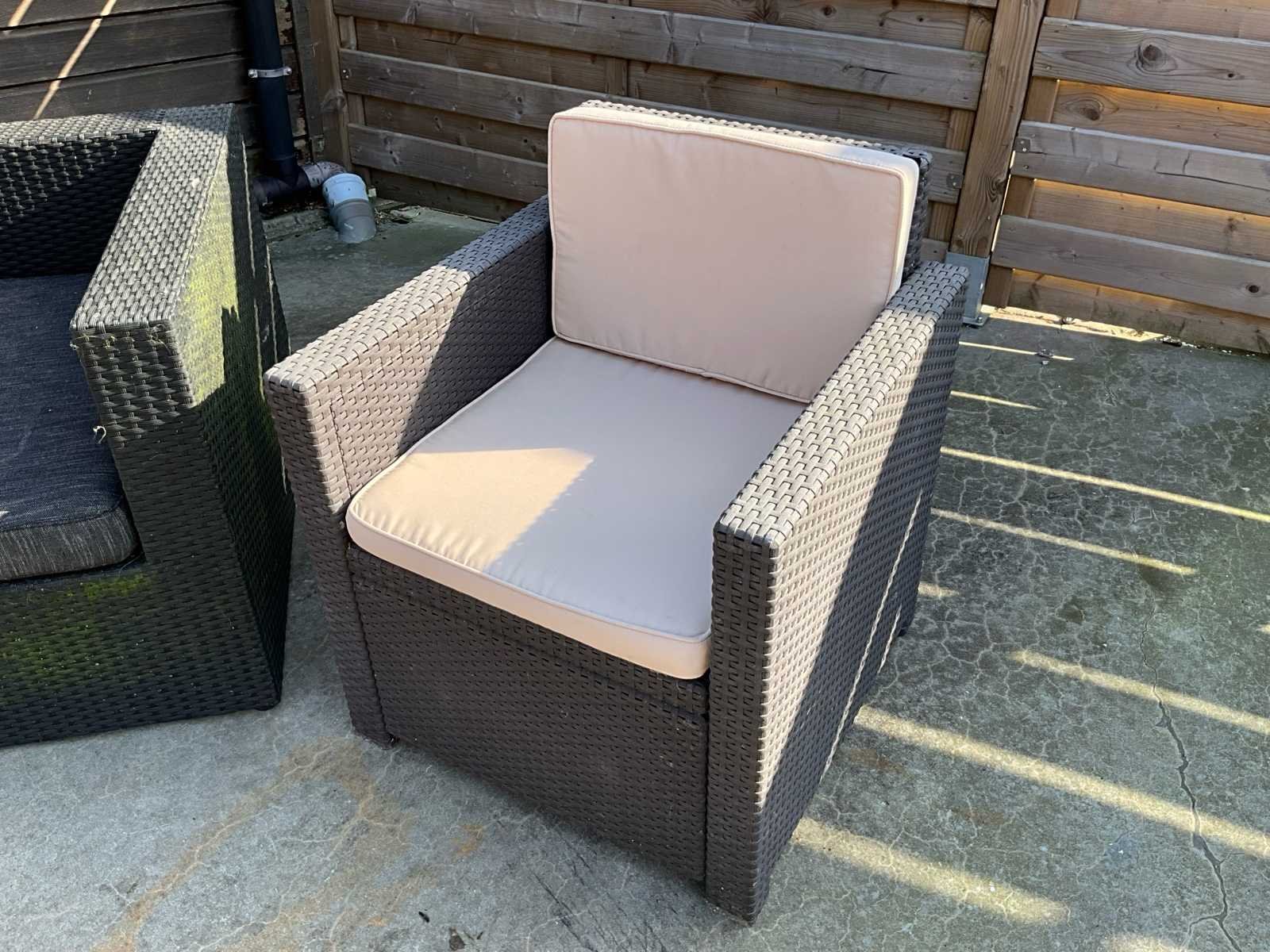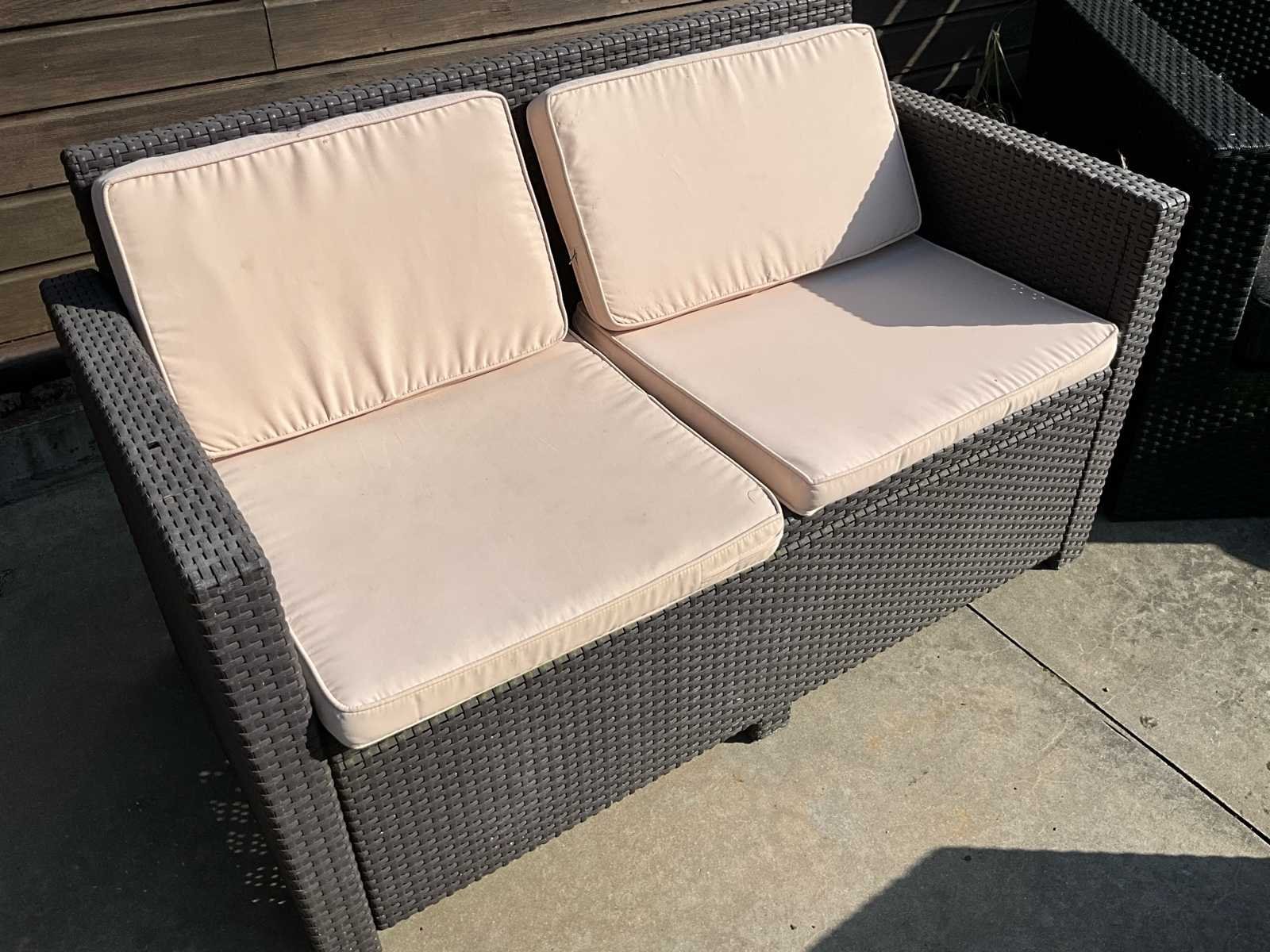 Stijlvolle en comfortabele wicker loungeset, ideaal voor tuin, terras of veranda. Bestaat uit een 2-zitsbank, 2 fauteuils, 1 extra zitmodule en een bijpassende salontafel met opbergruimte. Voorzien van dikke, lichtgekleurde zit- en rugkussens. Perfect voor gezellige momenten buiten! 🌿☀️ Gebruiksporen aanwezig Nee Kussens: true