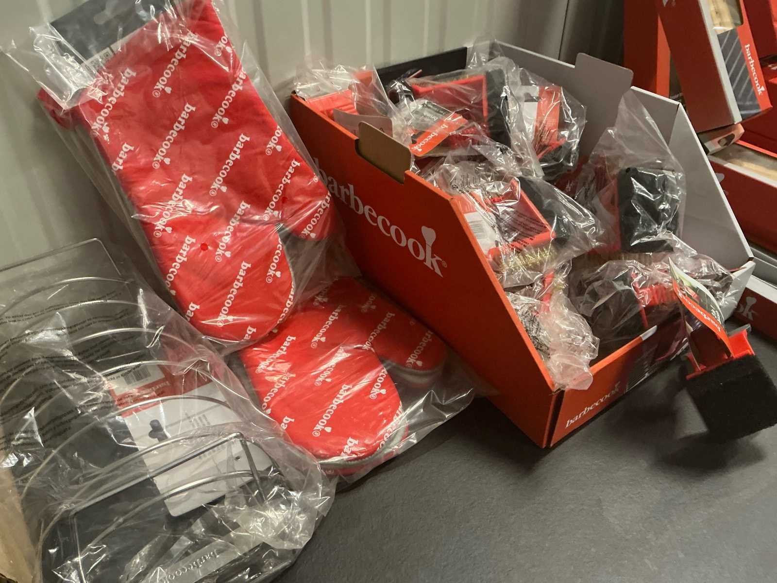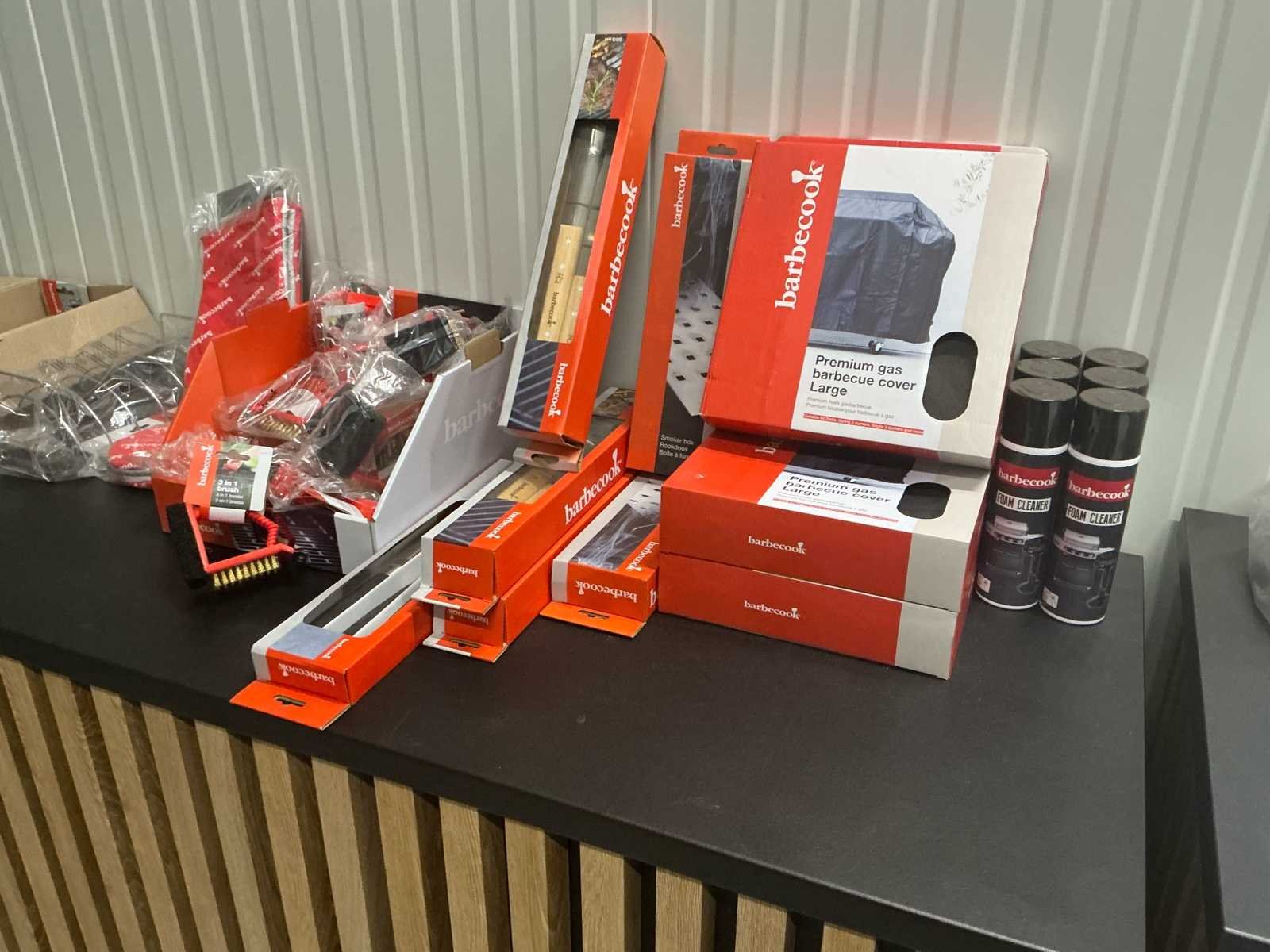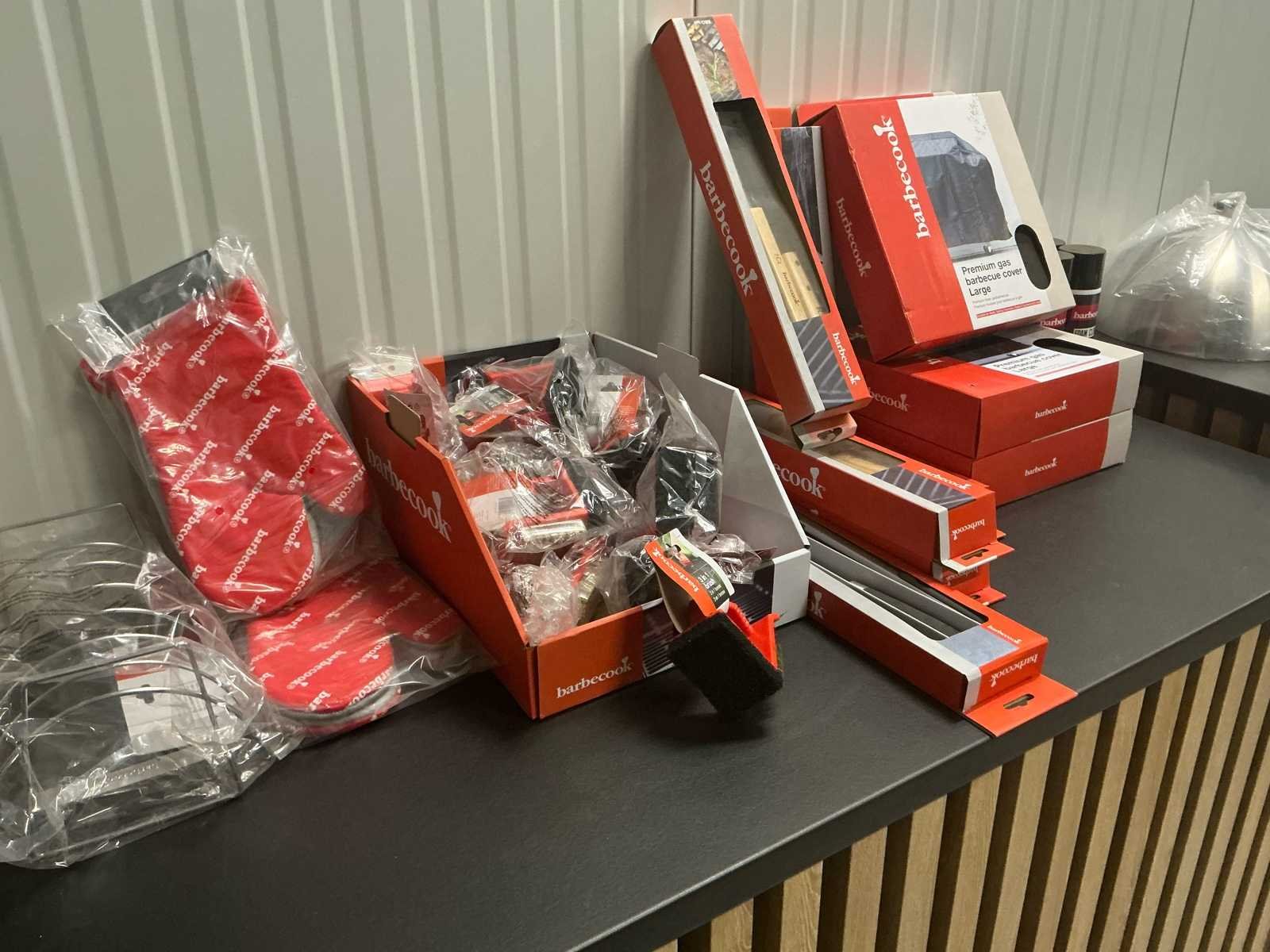 Dit lot bestaat uit: - handschoenen 2x 2 paar -tangenset 3x -tangenset 1x -smokebox 2x -hoes large 3x -rib rek 1x -foam cleaner 6x -3in1 borstel 15x -sate stokjes 11x No Merk: Lot barbecook accessoires