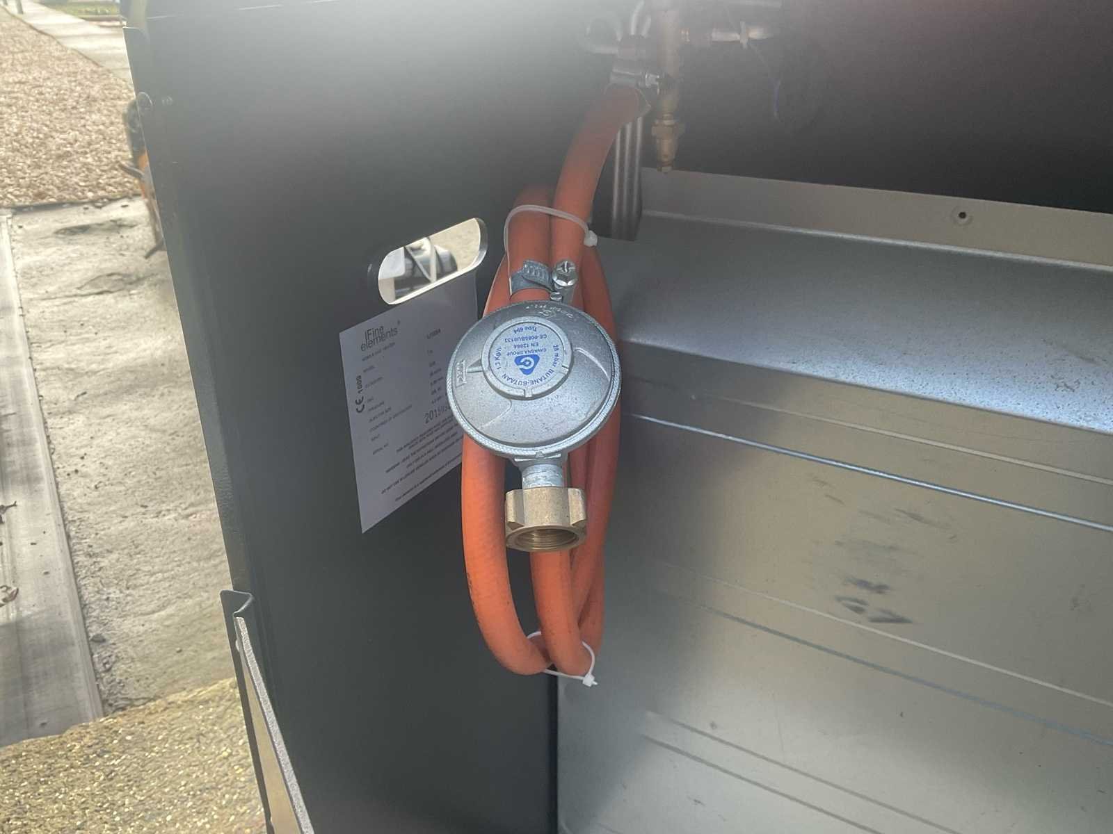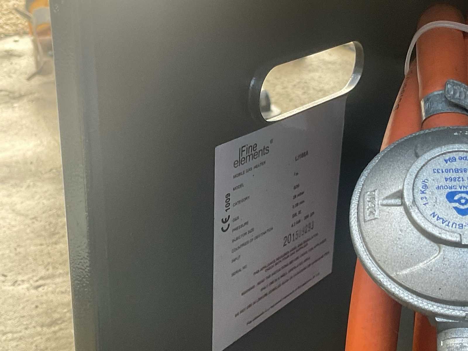 Fine Elements LH188A mobiele gasverwarming – 4,2 kW – 2015 Fine Elements mobiele gasverwarming, model LH188A, jaar 2015. Maximaal vermogen: 4,2 kW (4200 W). Draait op butaan/propaangas (categorie I3+). Druk: 28–30 mbar / 37 mbar. Uitgerust met piezo-ontsteking (rode knop), voorste beschermgrille en achterste compartiment voor gasflessen. Geleverd met regelaar en gasslang. No Merk: Fine Elements Type: LH188A Mobile Gas Heater Bouwjaar: 2015 Vermogen: 4200W