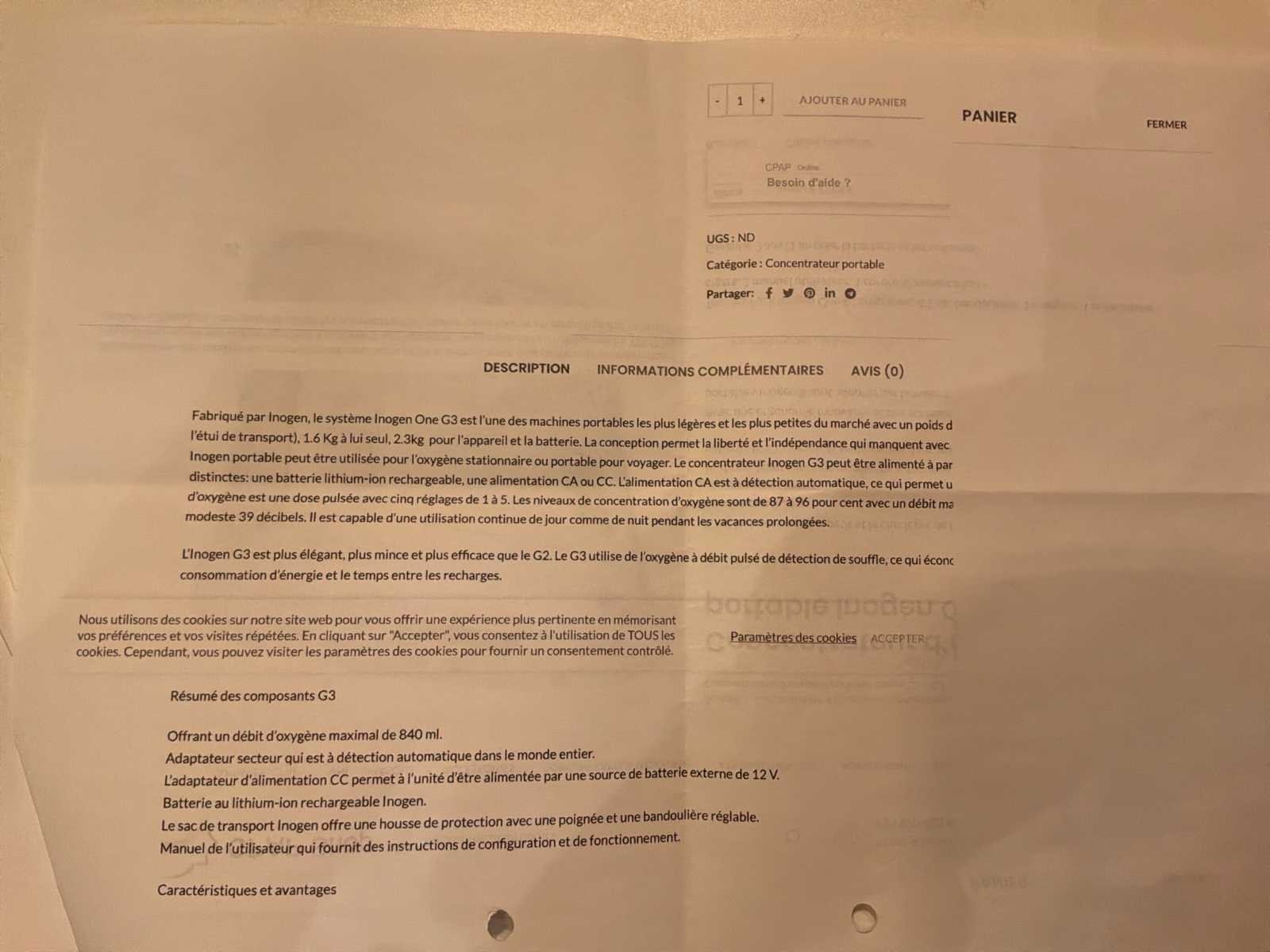 2 nieuwe zuurstofcartridges (waarde 250€) Het apparaat was 3 jaar oud en heel weinig gedraaid vanwege gebruik bij probleemoplossing en privégebruik. (vervangingswaarde 3000€) No Merk: Inogen Model: One g3 Kleur: Wit