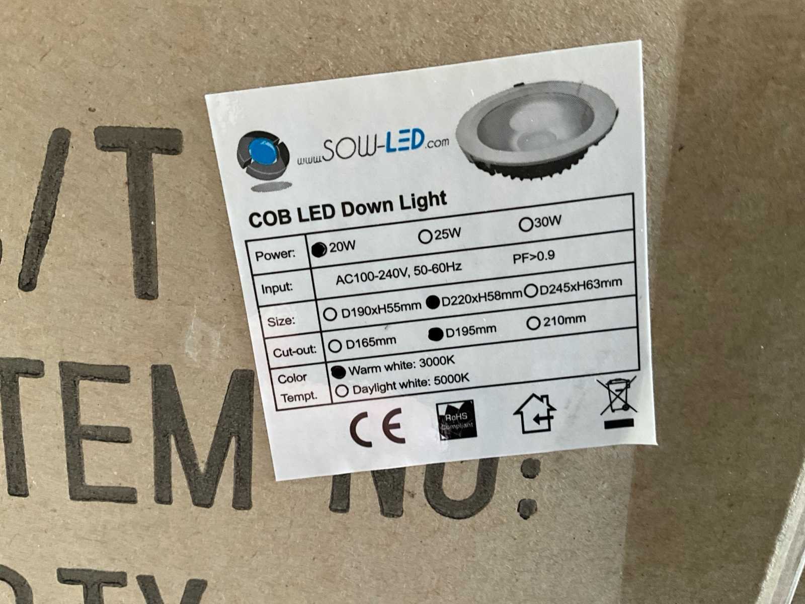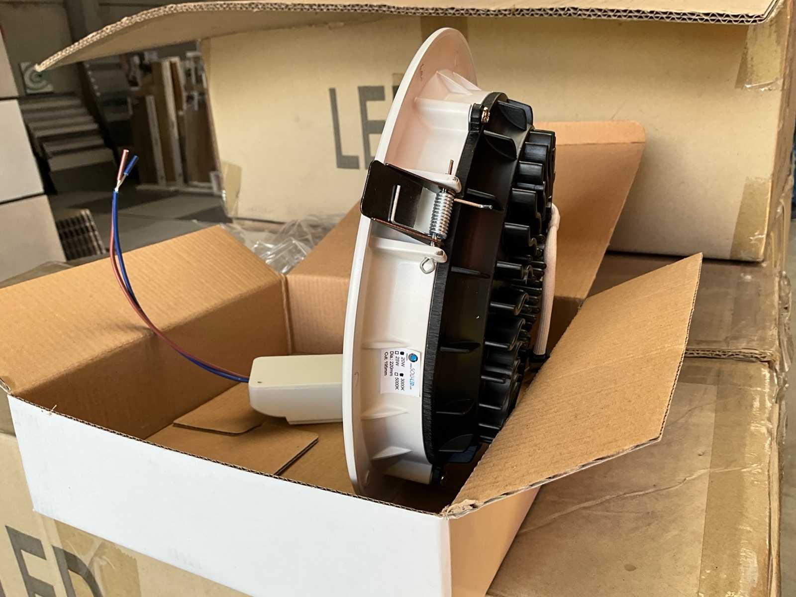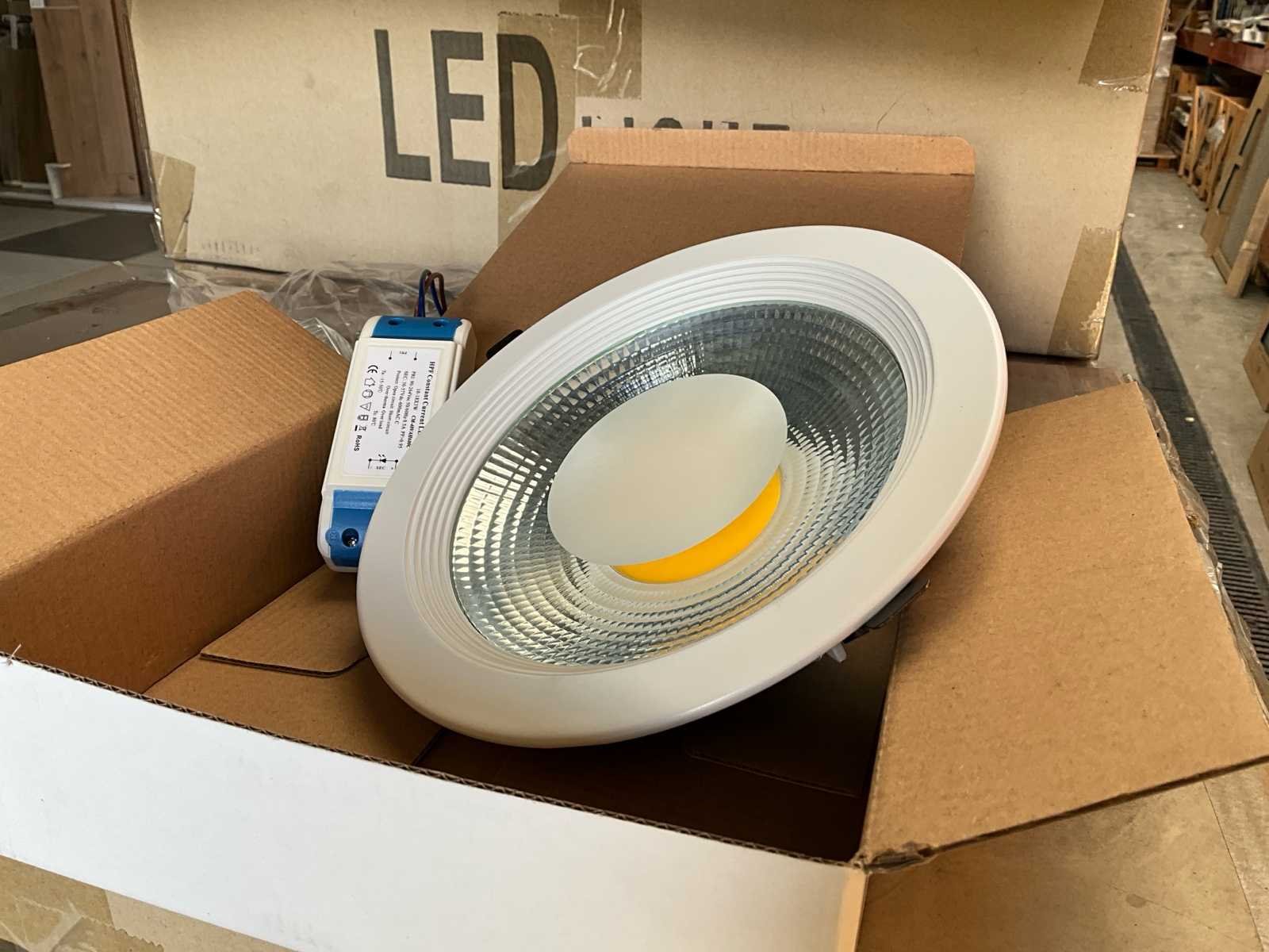 Set van 90 nieuwe stukken No Merk: SowLed Model: 220mm 20W 3000K COB Spanning: 220V Kleurtemperatuur: 3000K Diameter circa: 220 Wattage: 20W