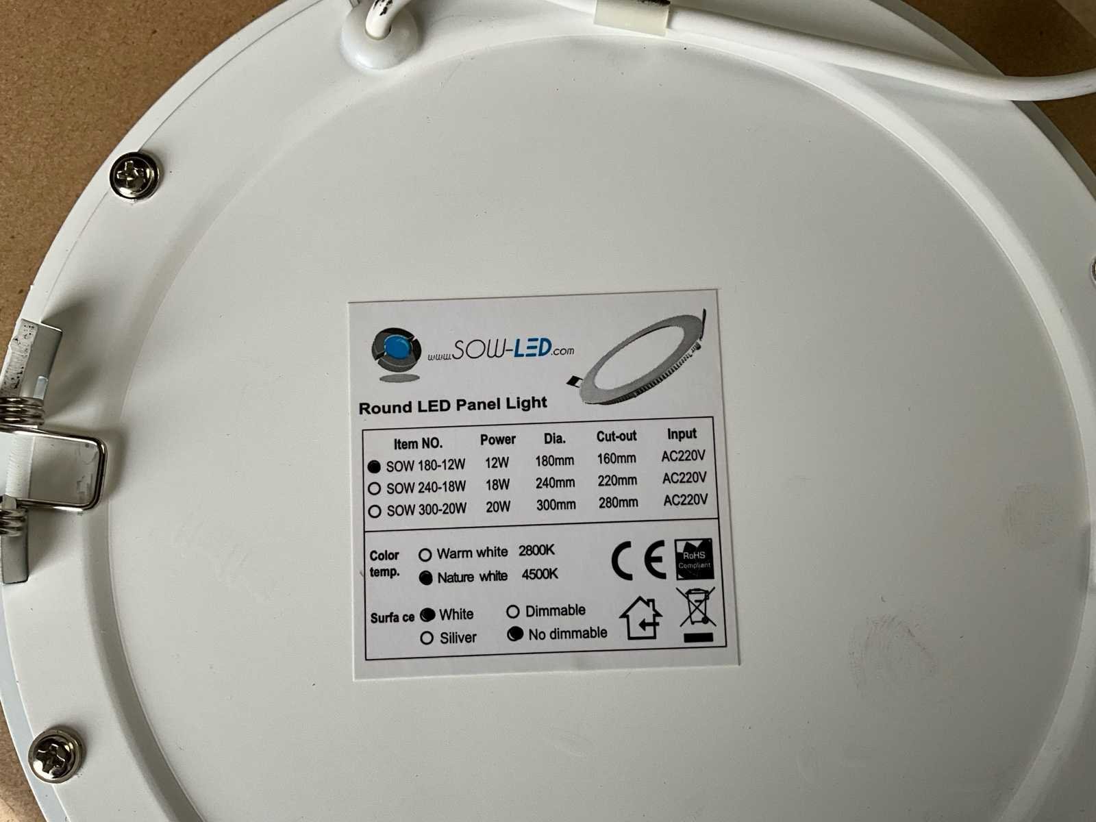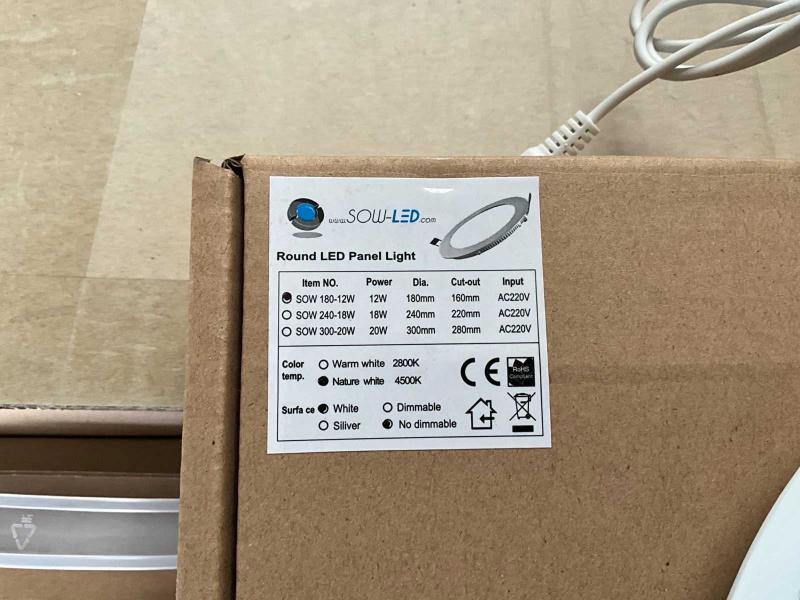 Set van 91 nieuwe stukken No Merk: SowLed Model: 180 mm 12 W 4500K Spanning: 220V Kleurtemperatuur: 4500K Lichtbron: SMD Diameter circa: 180 Wattage: 12W