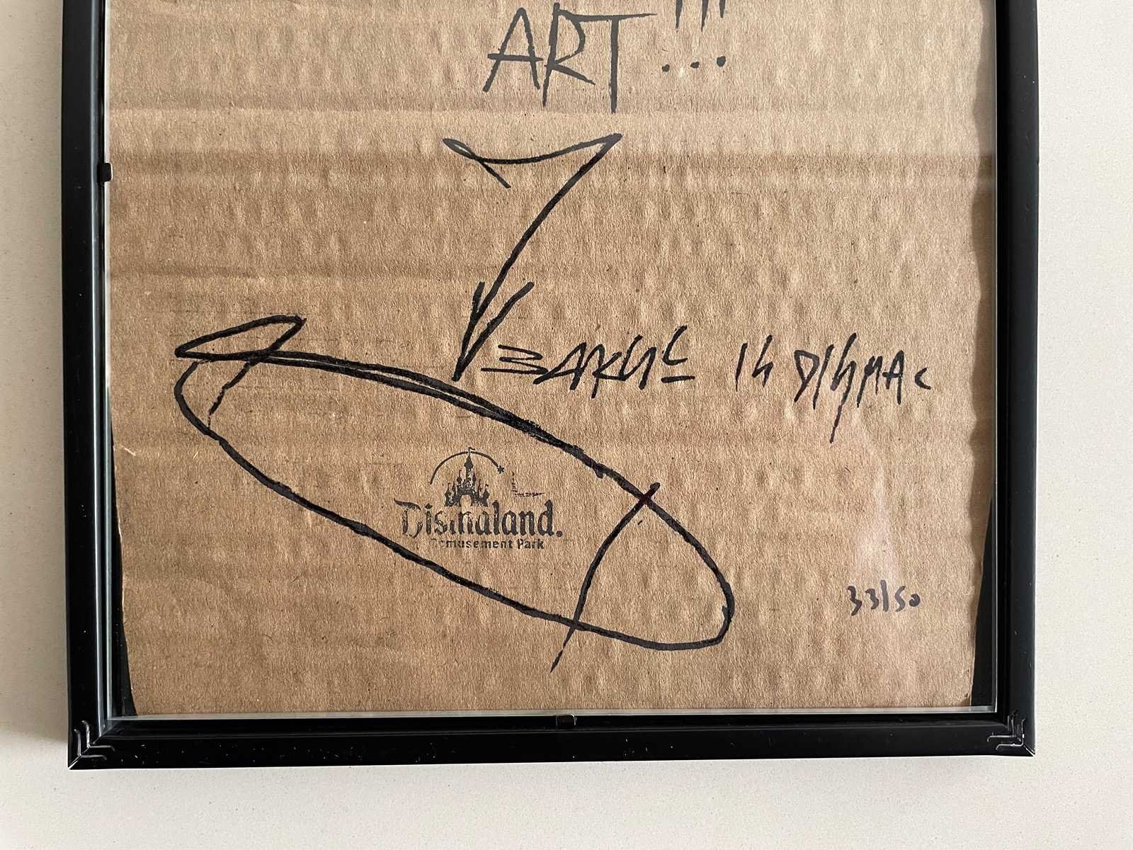 (After) Ingekaderd karton dat waarschijnlijk uit het park komt van Dismaland (in 2015) Afmeting werk : 20x30cm Limited édition : 50 stuks Genummerd : 33/50 Ingekaderd dubbelzijdig Goede staat Zonder Certificaat Het is waarschijnlijk ondertekend door de organisatoren van het park. Ter info : Voor de werken van Dismaland of het Walled Off Hotel zijn er geen echtheidscertificaten uitgeschreven. En pest control levert geen documenten af. Nee Kunstenaar: Banksy