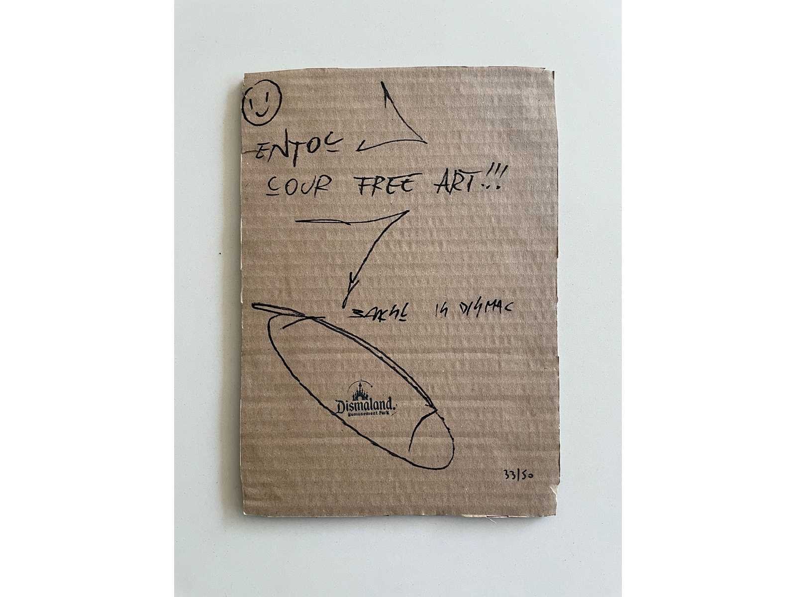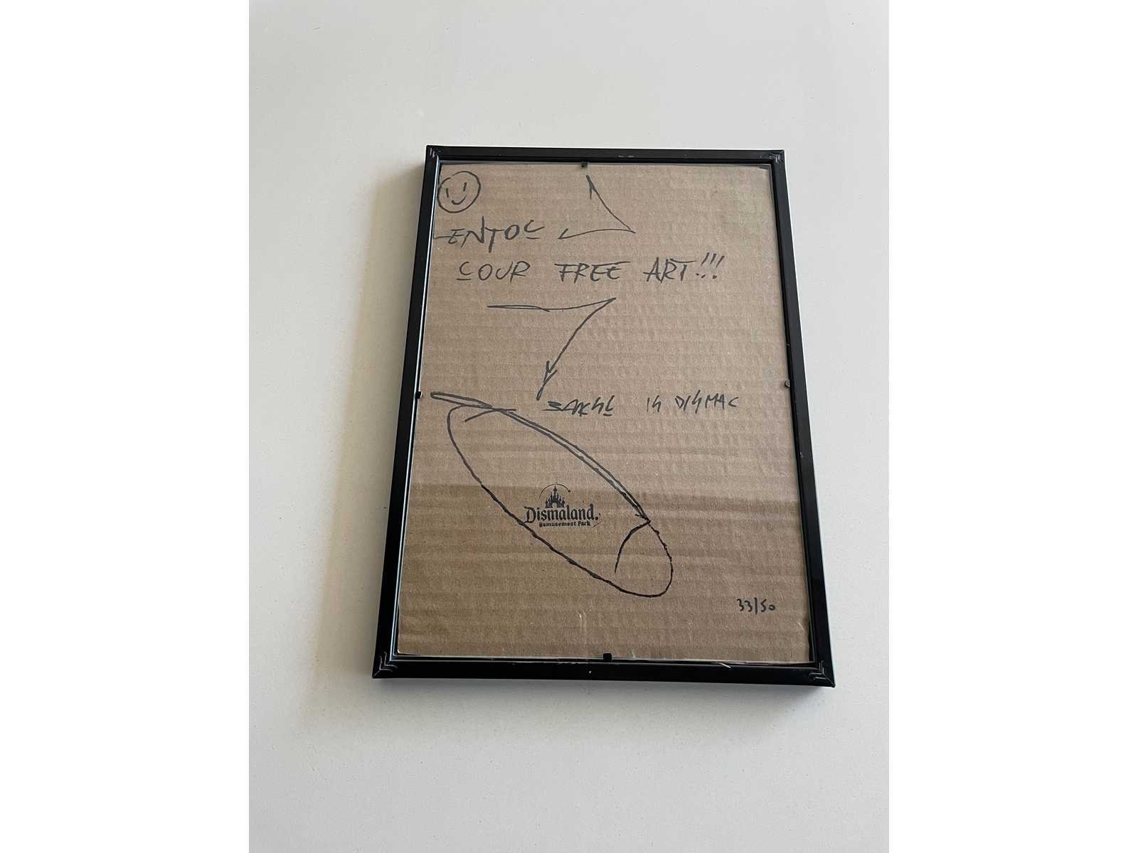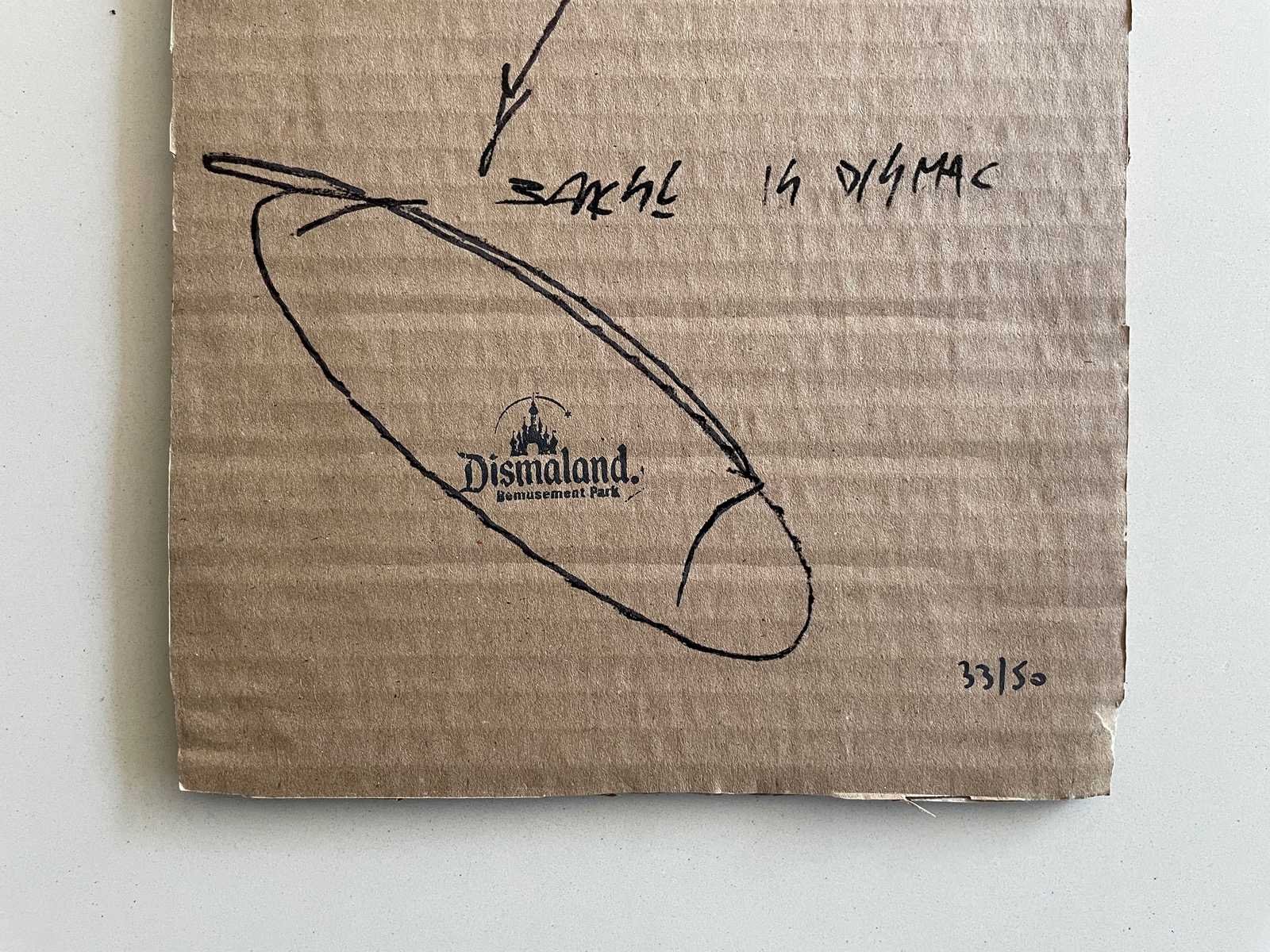 (After) Ingekaderd karton dat waarschijnlijk uit het park komt van Dismaland (in 2015) Afmeting werk : 20x30cm Limited édition : 50 stuks Genummerd : 33/50 Ingekaderd dubbelzijdig Perfecte staat Zonder Certificaat Het is waarschijnlijk ondertekend door de organisatoren van het park. Ter info : Voor de werken van Dismaland of het Walled Off Hotel zijn er geen echtheidscertificaten uitgeschreven. En pest control levert geen documenten af. Nee Kunstenaar: Banksy