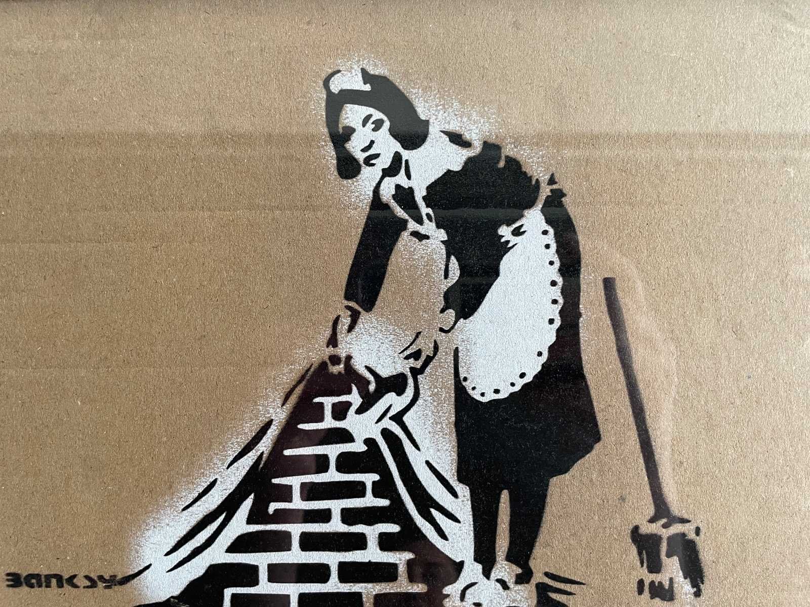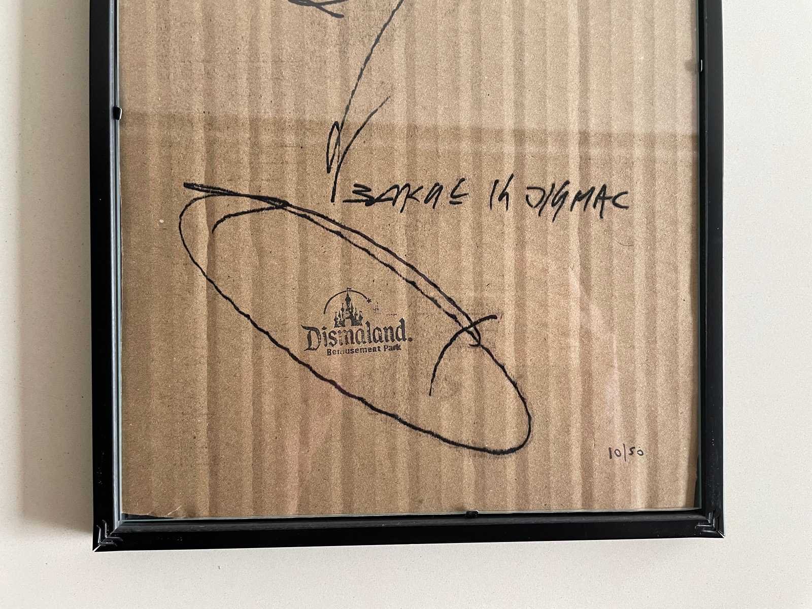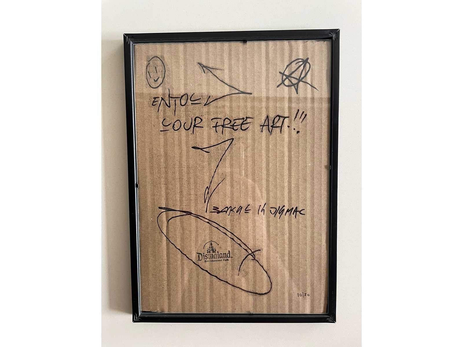 (After) Ingekaderd karton dat waarschijnlijk uit het park komt van Dismaland (in 2015) Afmeting werk : 20x30cm Limited édition : 50 stuks Genummerd : 10/50 Ingekaderd dubbelzijdig Perfecte staat Zonder Certificaat Het is waarschijnlijk ondertekend door de organisatoren van het park. Ter info : Voor de werken van Dismaland of het Walled Off Hotel zijn er geen echtheidscertificaten uitgeschreven. En pest control levert geen documenten af. Nee Kunstenaar: Banksy
