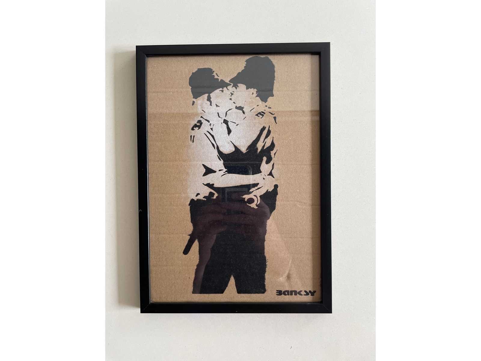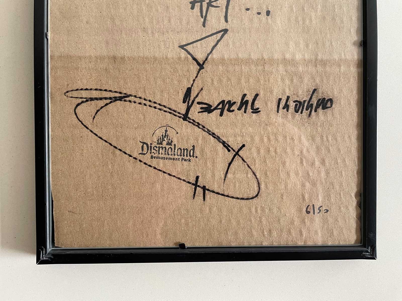 (After) Ingekaderd karton dat waarschijnlijk uit het park komt van Dismaland (in 2015). Afmeting werk : 20x30cm Limited édition : 50 stuks Genummerd : 6/50 Ingekaderd dubbelzijdig Perfecte staat Zonder Certificaat Het is waarschijnlijk ondertekend door de organisatoren van het park. Ter info : Voor de werken van Dismaland of het Walled Off Hotel zijn er geen echtheidscertificaten uitgeschreven. En pest control levert geen documenten af. Nee Kunstenaar: Banksy