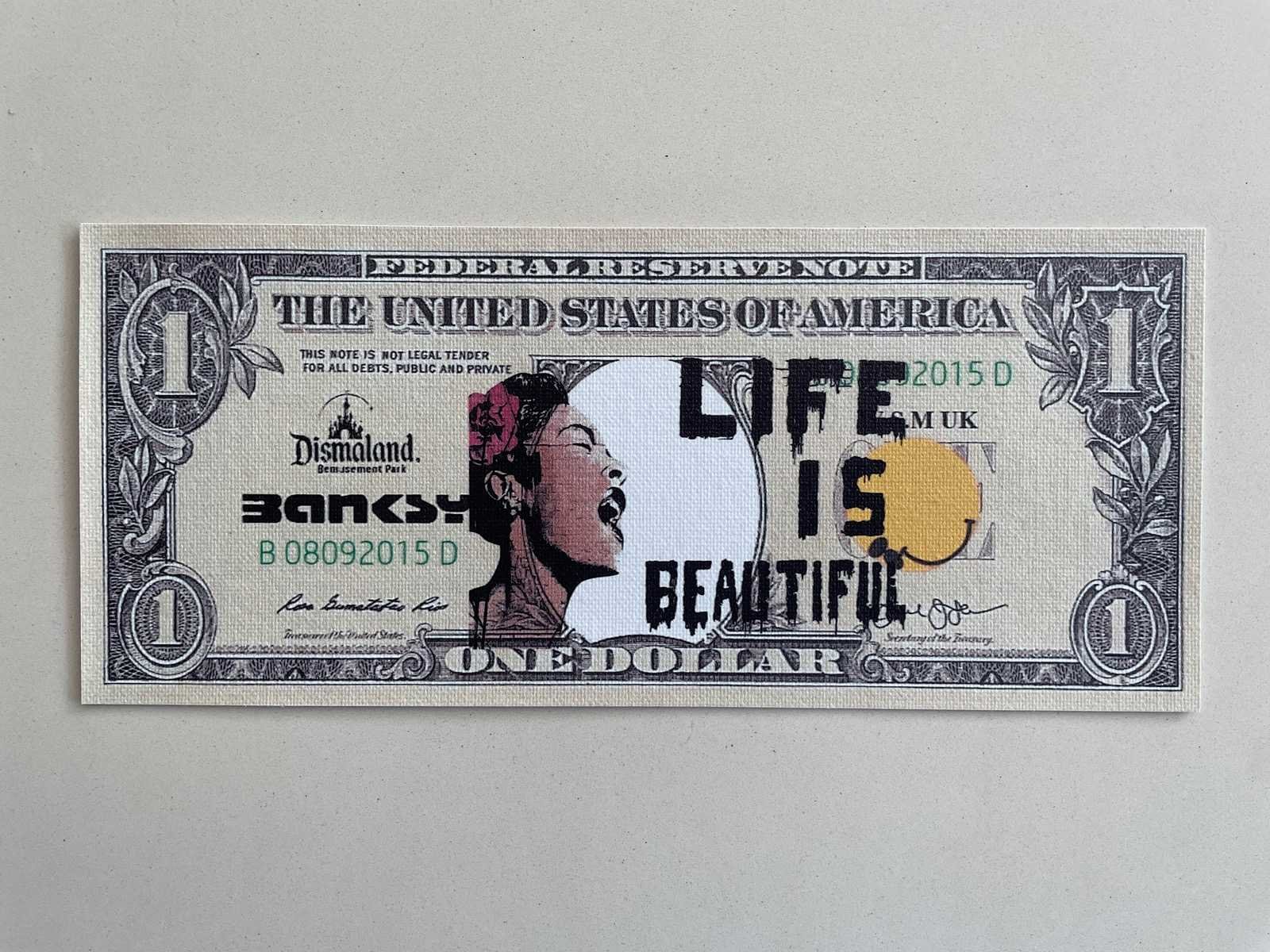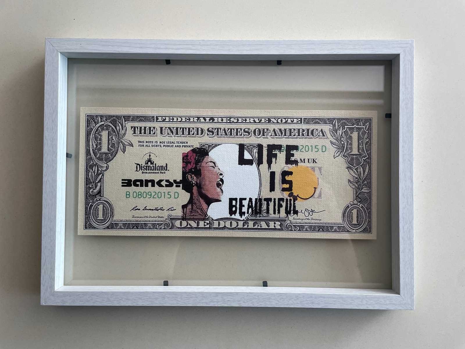(After) Bankbiljet Afmeting kader : 23,5x 32cm Ingekaderd (dubbelzijdig) Nieuwstaat Zonder Certificaat Ter info : Voor de werken van Dismaland of het Walled Off Hotel zijn er geen echtheidscertificaten uitgeschreven. En pest control levert geen documenten af. Nee Kunstenaar: Banksy