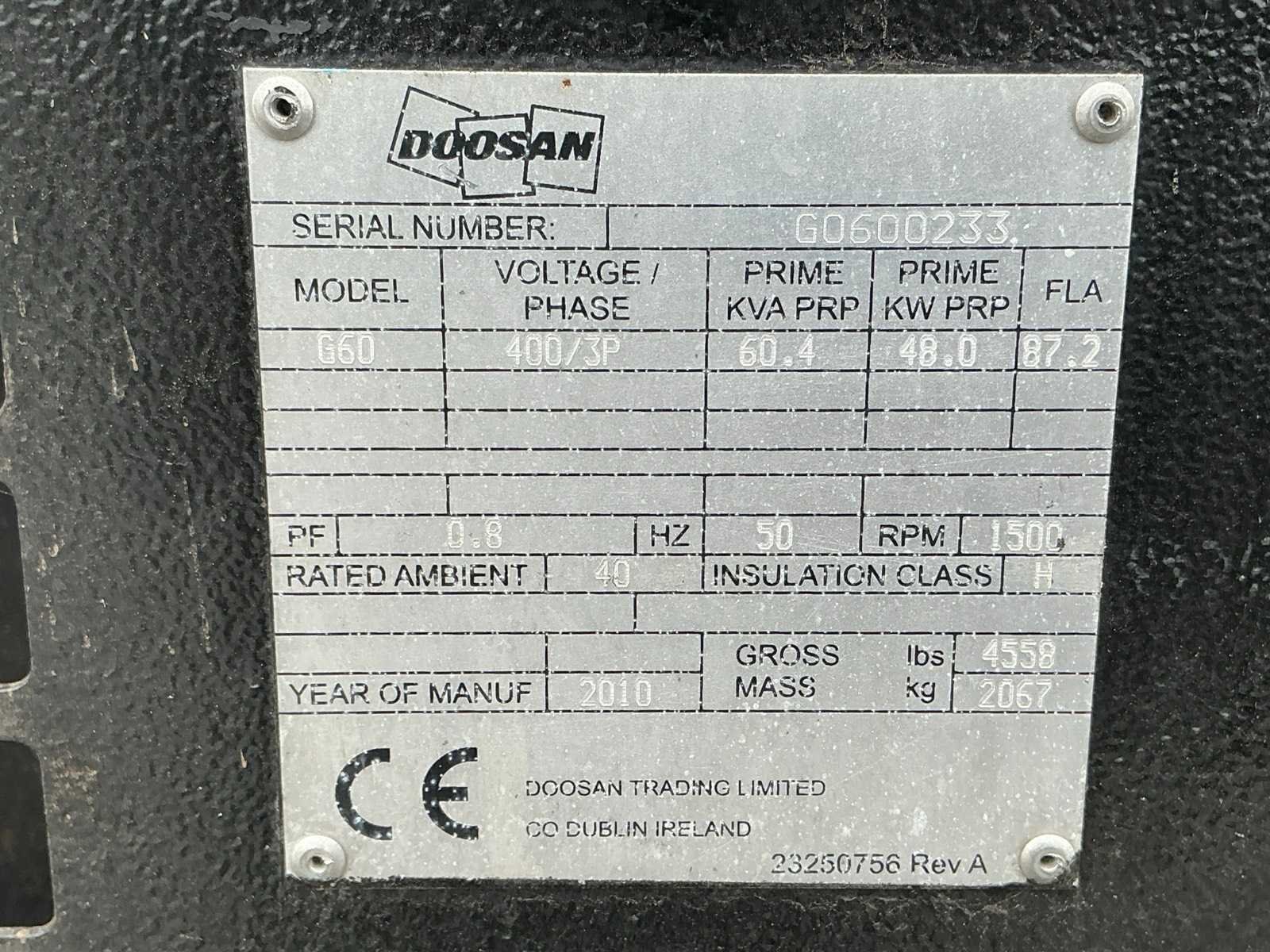 Nee Merk: Doosan Type: G60 Bouwjaar: 2020 Serienummer: G0600233 Capaciteit.: 60.4kVA Aansluiting: 400V Motor merk: Ingersoll Rand Motorcapaciteit: 48kW Afgelezen urenstand: 8471