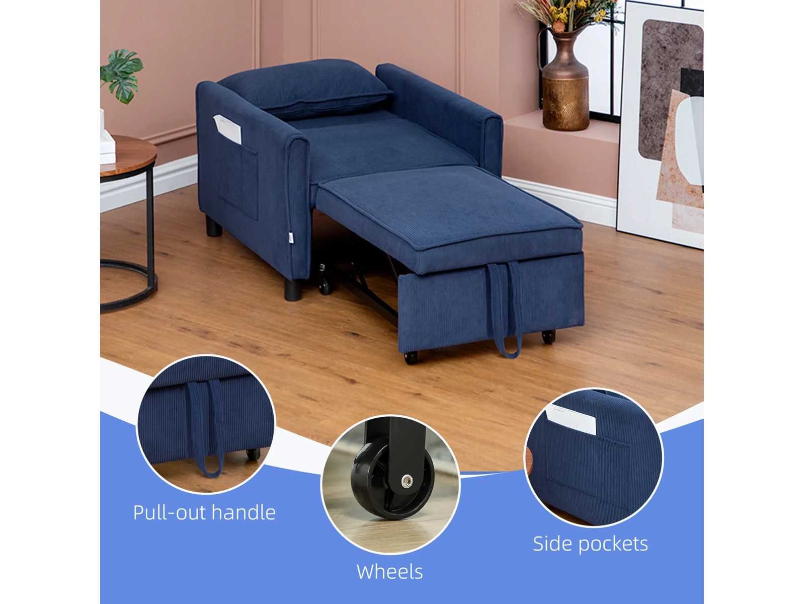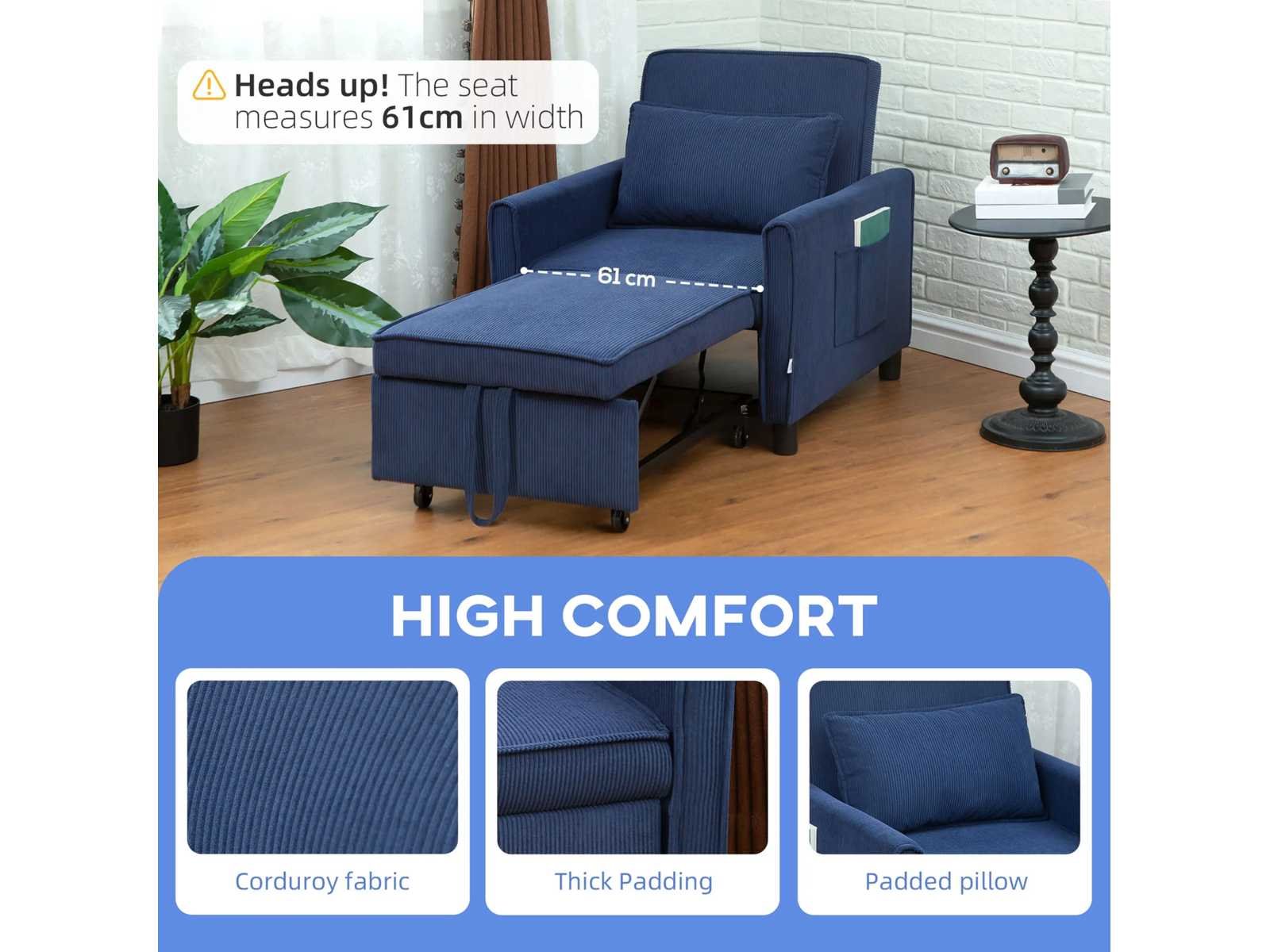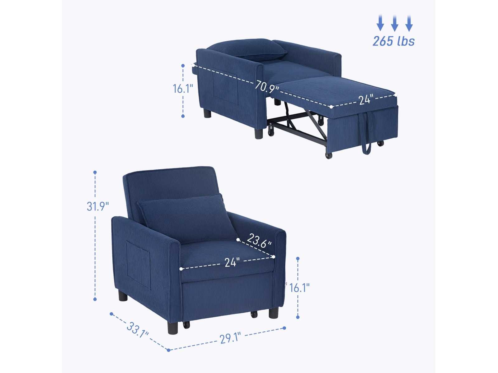 Specificatie: - Kleur: Blauw - Materialen: Corduroy (100% polyester), schuim (100% polyurethaan), eucalyptushout, kunststof Bankafmetingen: 74 cm (W) x 84 cm (D) x 81 cm (H) Bedafmetingen: 61 cm (W) x 180 cm (D) x 41 cm (H) - Zitafmetingen: 61 cm (B) x 60 cm (D) - Zithoogte: 16,1 inch - Achterafmetingen: 61 cm (B) x 46 cm (H) - Hoogte tussen armleuning en zitting: 15 cm - Kussenafmetingen: 56 cm (W) x 35 cm (W) x 15 cm (D) - Dempingsdikte: (zit) 4,3 inch, (rugleuning) 3,5 inch - Laadcapaciteit: 264 lbs. Non