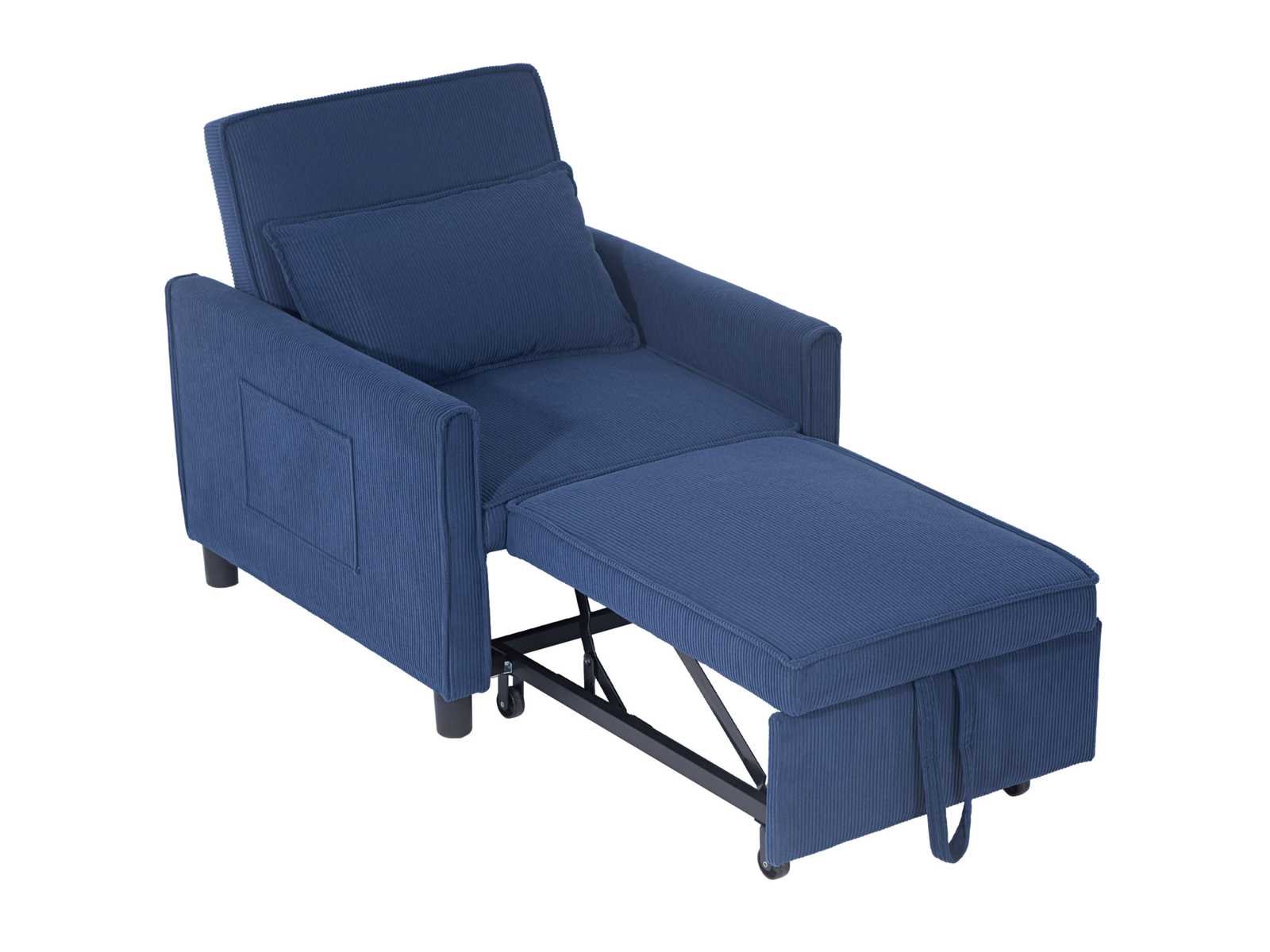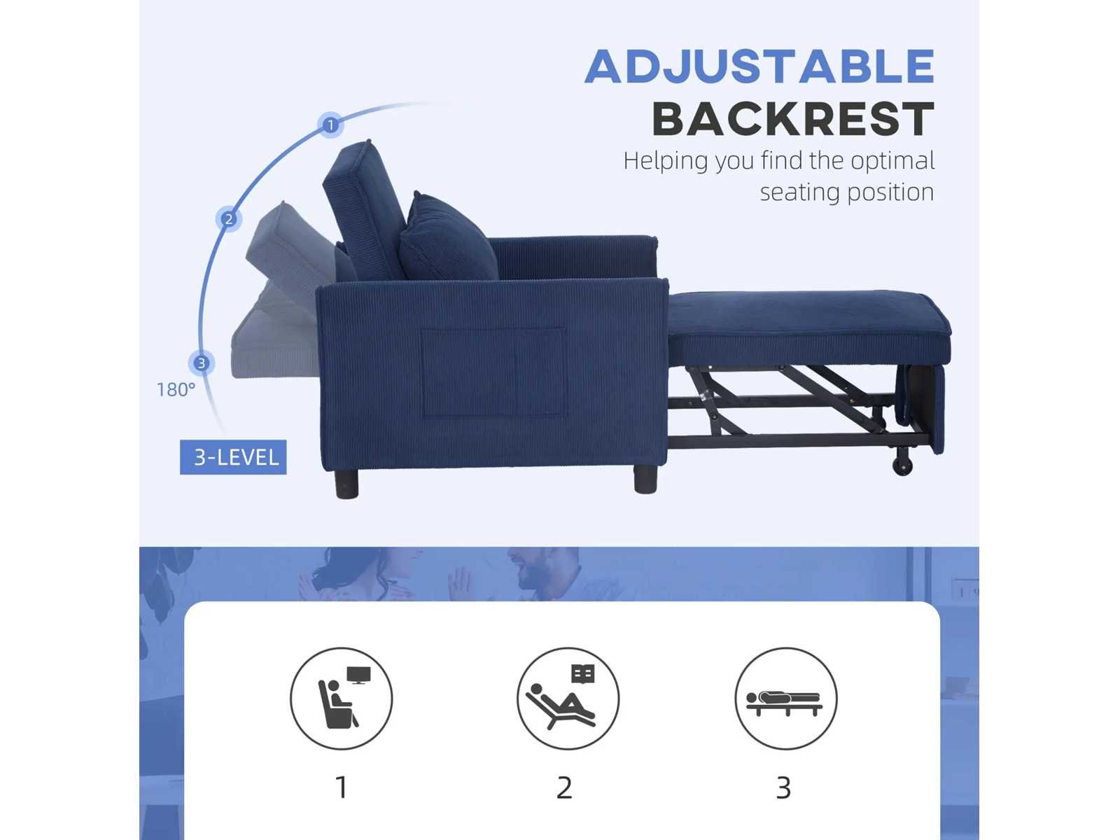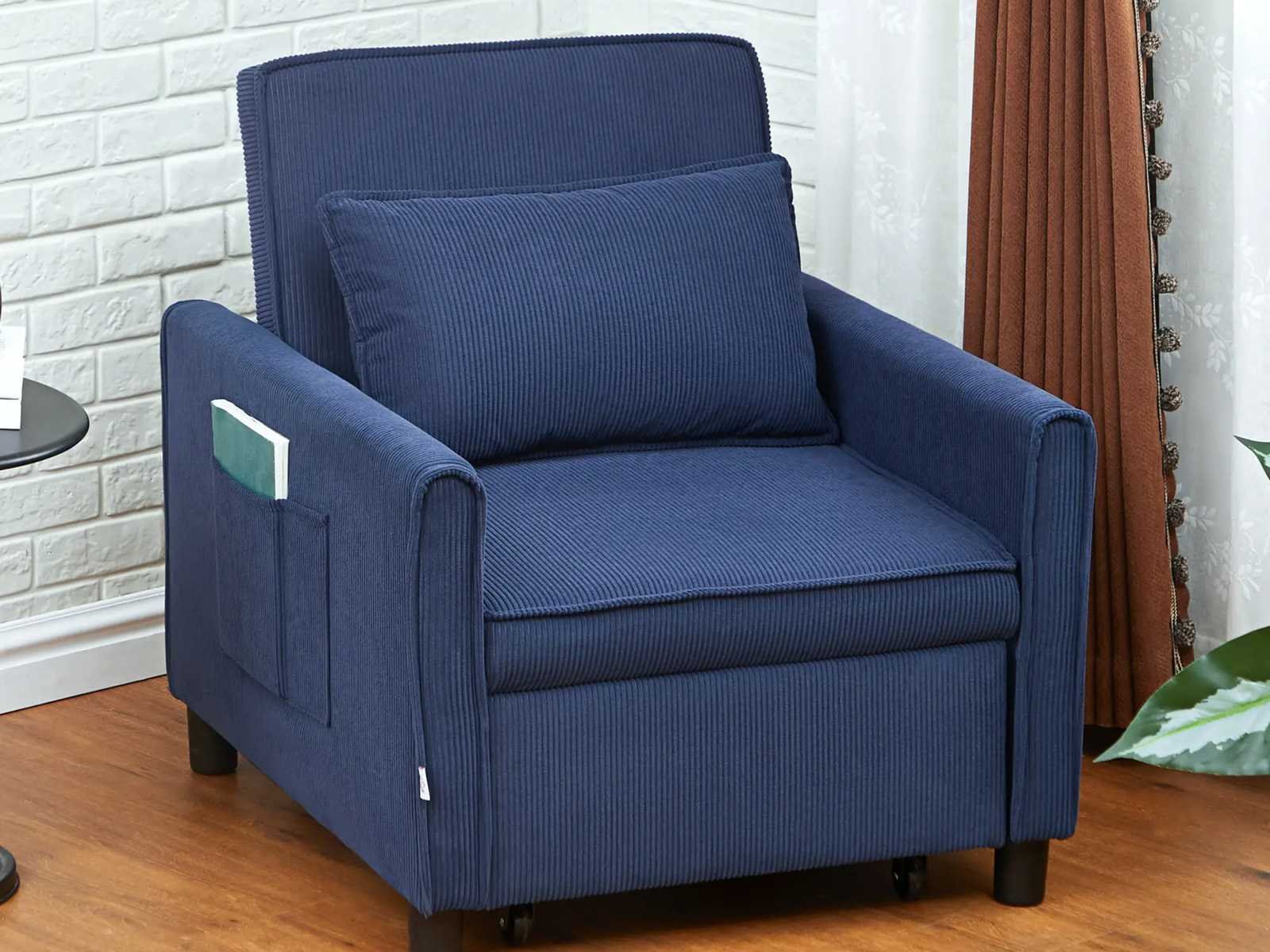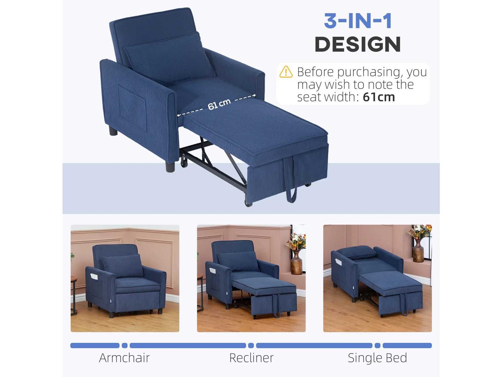 Specificatie: - Kleur: Blauw - Materialen: Corduroy (100% polyester), schuim (100% polyurethaan), eucalyptushout, kunststof Bankafmetingen: 74 cm (W) x 84 cm (D) x 81 cm (H) Bedafmetingen: 61 cm (W) x 180 cm (D) x 41 cm (H) - Zitafmetingen: 61 cm (B) x 60 cm (D) - Zithoogte: 16,1 inch - Achterafmetingen: 61 cm (B) x 46 cm (H) - Hoogte tussen armleuning en zitting: 15 cm - Kussenafmetingen: 56 cm (W) x 35 cm (W) x 15 cm (D) - Dempingsdikte: (zit) 4,3 inch, (rugleuning) 3,5 inch - Laadcapaciteit: 264 lbs. Non