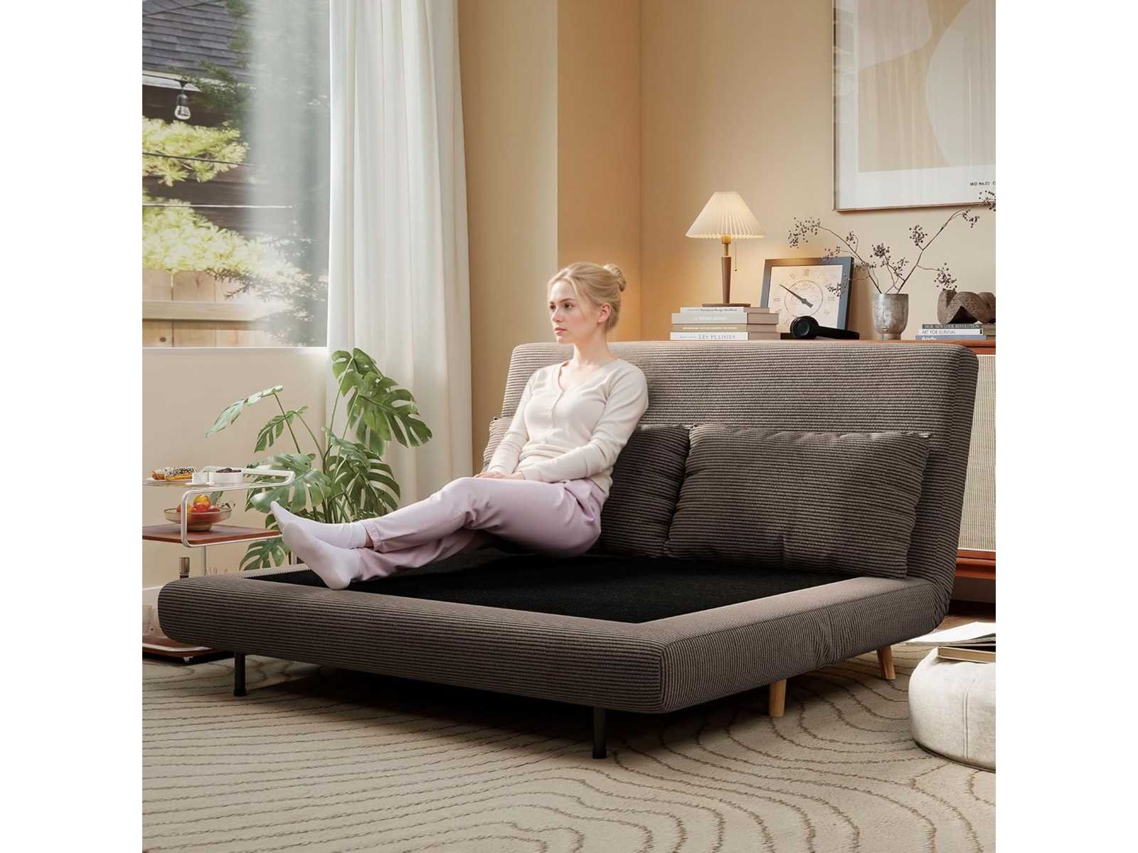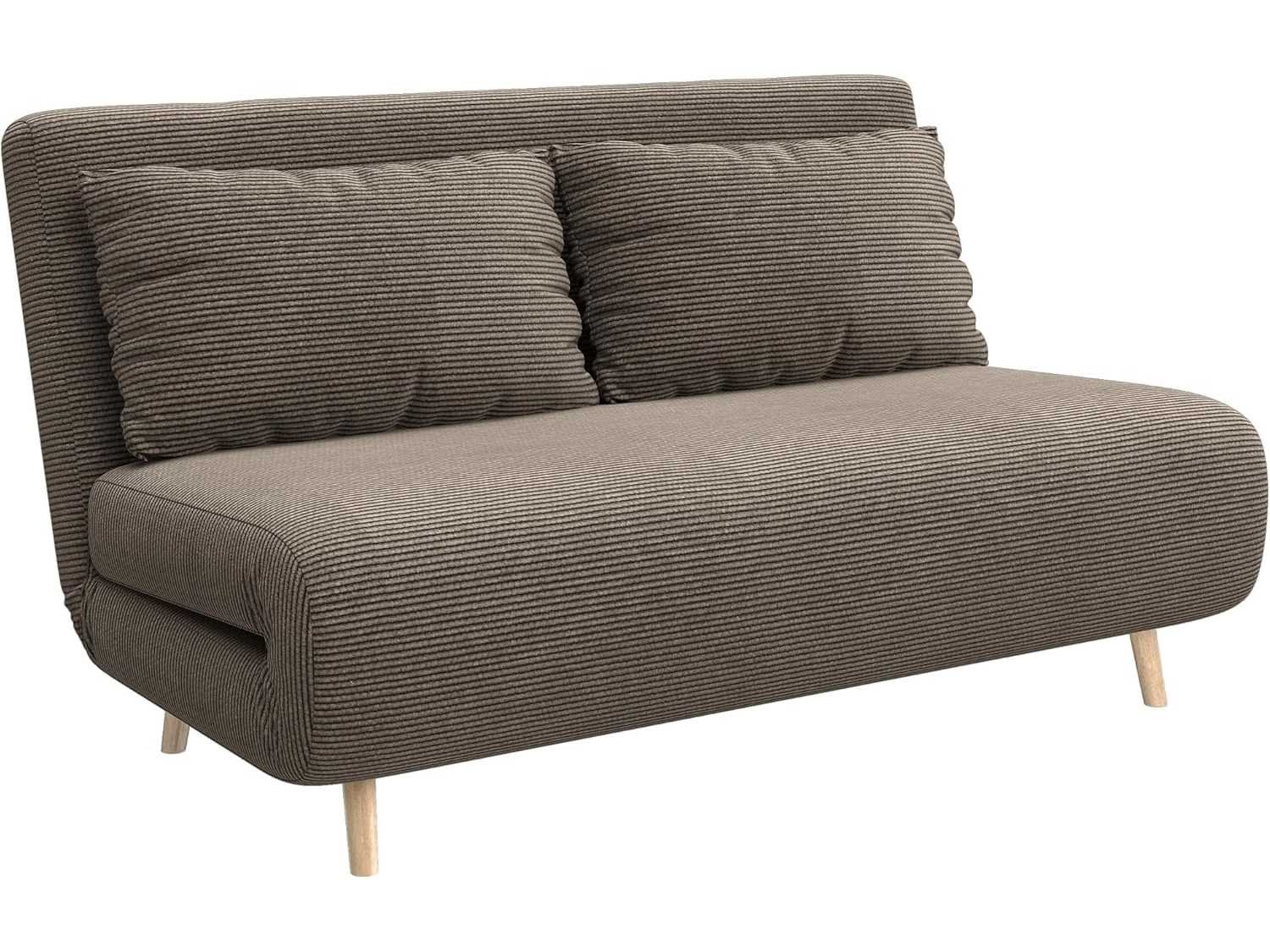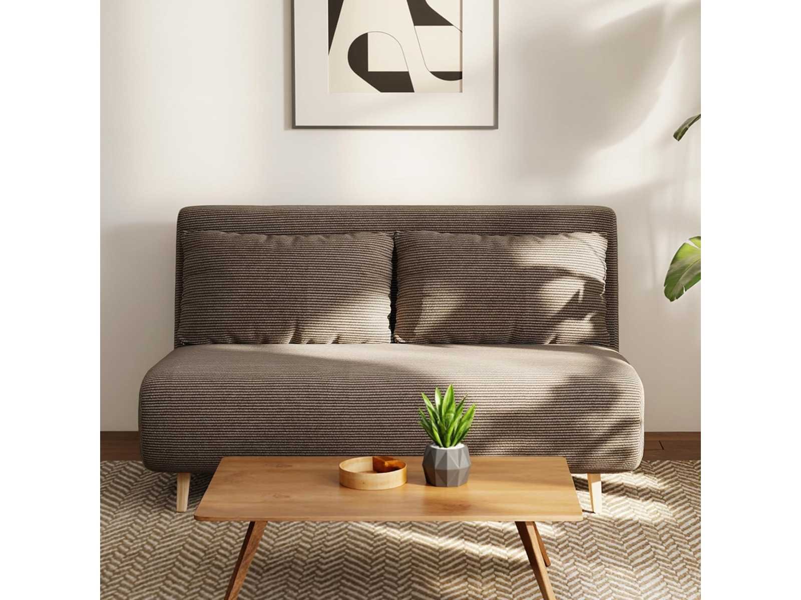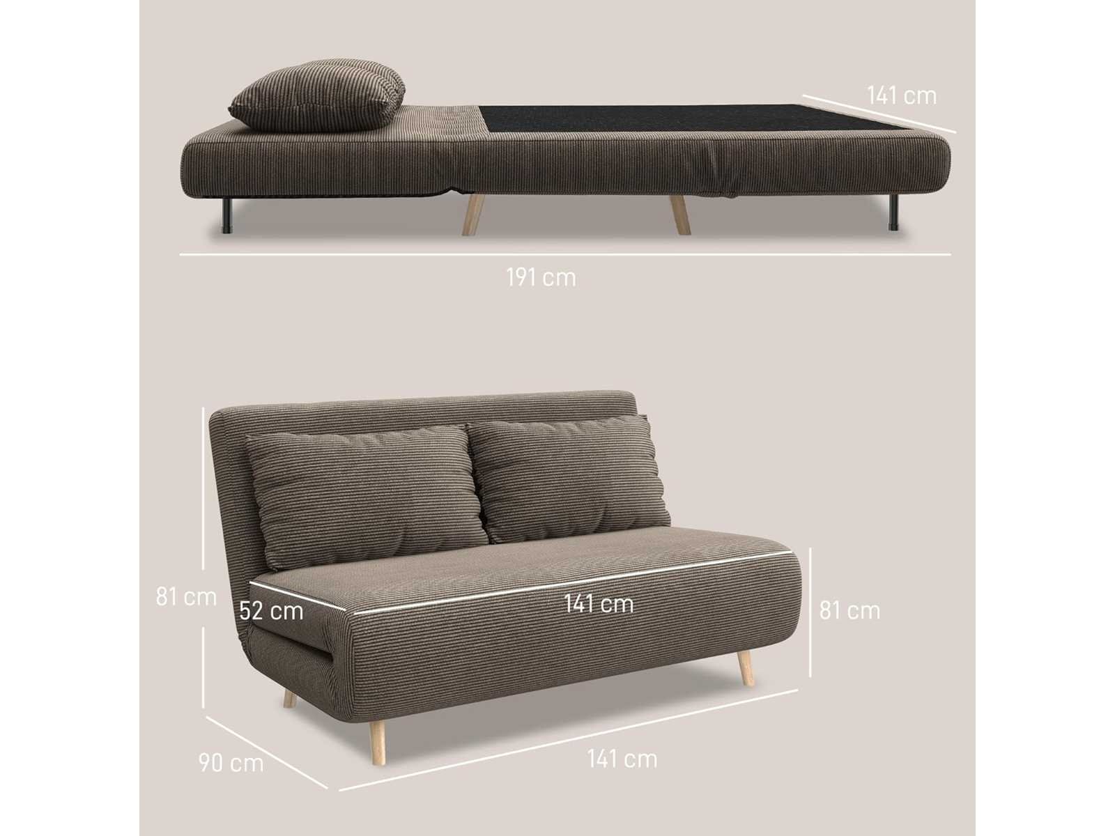 De verstelbare rugleuning van de bank biedt drie posities (tot 180°) en maakt het mogelijk om deze om te vormen tot een extra bed. Het tweezitter slaapbank, inclusief twee extra kussens, volledige bekleding en een vaste rugleuning, biedt uitstekende ondersteuning. De spoelkern biedt uitzonderlijk comfort De corduroy-stoffen bekleding van het slaapbank is zacht aanvoelend, duurzaam en ademend. Vier beukenhouten poten voor extra stabiliteit Beschermende teenkappen beschermen de vloer tegen lichte schade Montage vereist Donkerbruine kleur Materiaal: 100% polyester, schuim, beukenhout Bankafmetingen: 141 cm (W) x 90 cm (D) x 81 cm (H) Bedafmetingen: 191 B x 141 D x 27 H cm Bankafmetingen 141 cm (W) x 52 cm (D) x 41 cm (H) dikte 26 cm (zit), 13 cm (bed) Rugleuningafmetingen: 48B x 141D x 13D cm Rugleuningshoek 95°, 135°, 180° Kussenafmetingen: 64 cm B x 37 cm D x 15 cm H Beenhoogte 14 cm Laadvermogen: 120 kg Non