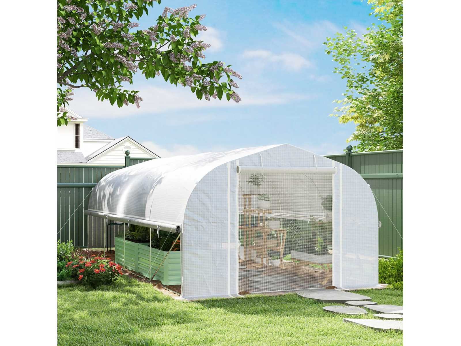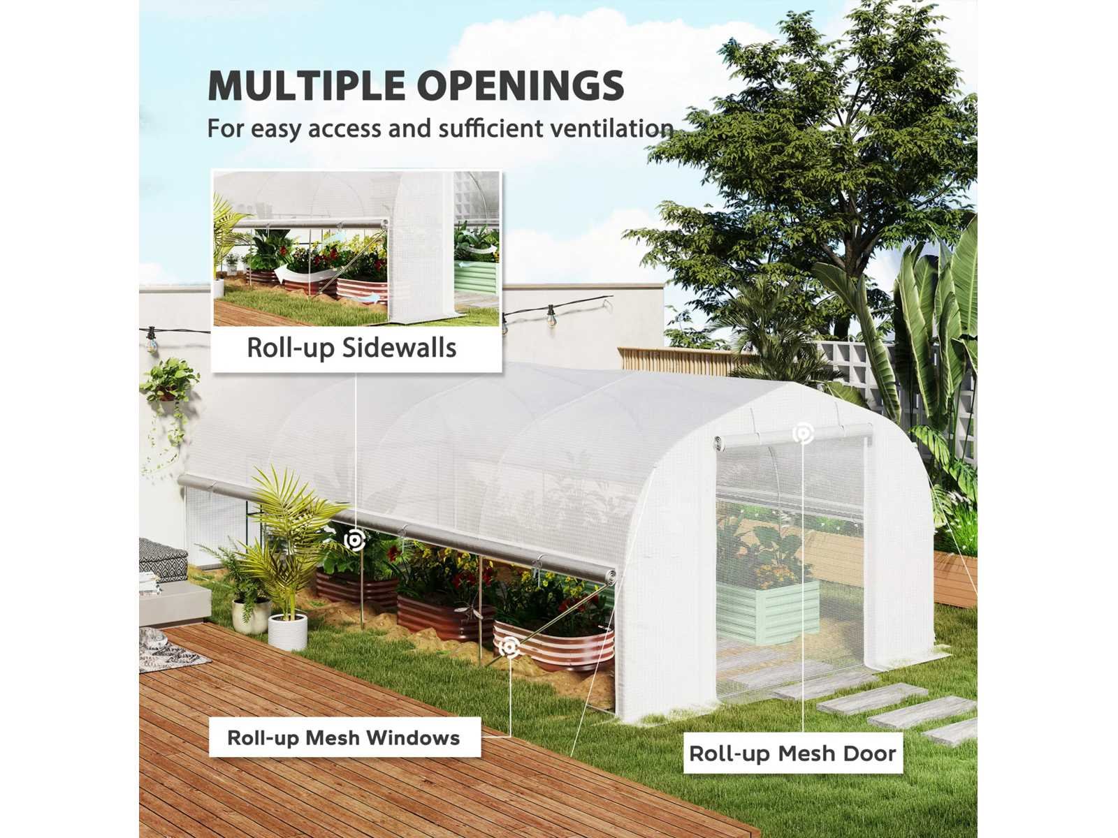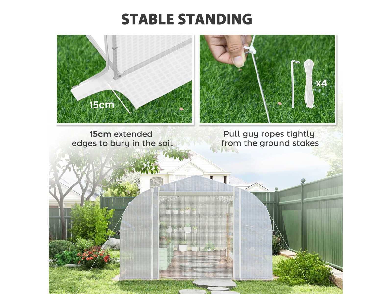 Specificatie: Kleur: Wit Materiaal: PE 140 g/m², gegalvaniseerd staal Totale afmetingen: 595 cm (L) x 300 cm (B) x 200 cm (H) Raamafmetingen: 40 cm (breedte) x 47 cm (hoogte) Afmetingen van de PE buitendeur: 150 cm (breedte) x 170 cm (hoogte) Afmetingen van de binnenste gaasdeur: 170 cm (breedte) x 164 cm (hoogte) Rand breedte: 15 cm Wind: Niveau 4 (windsnelheid minder dan 28 km/u) Voor montage: 3 tot 4 mensen worden aanbevolen Non