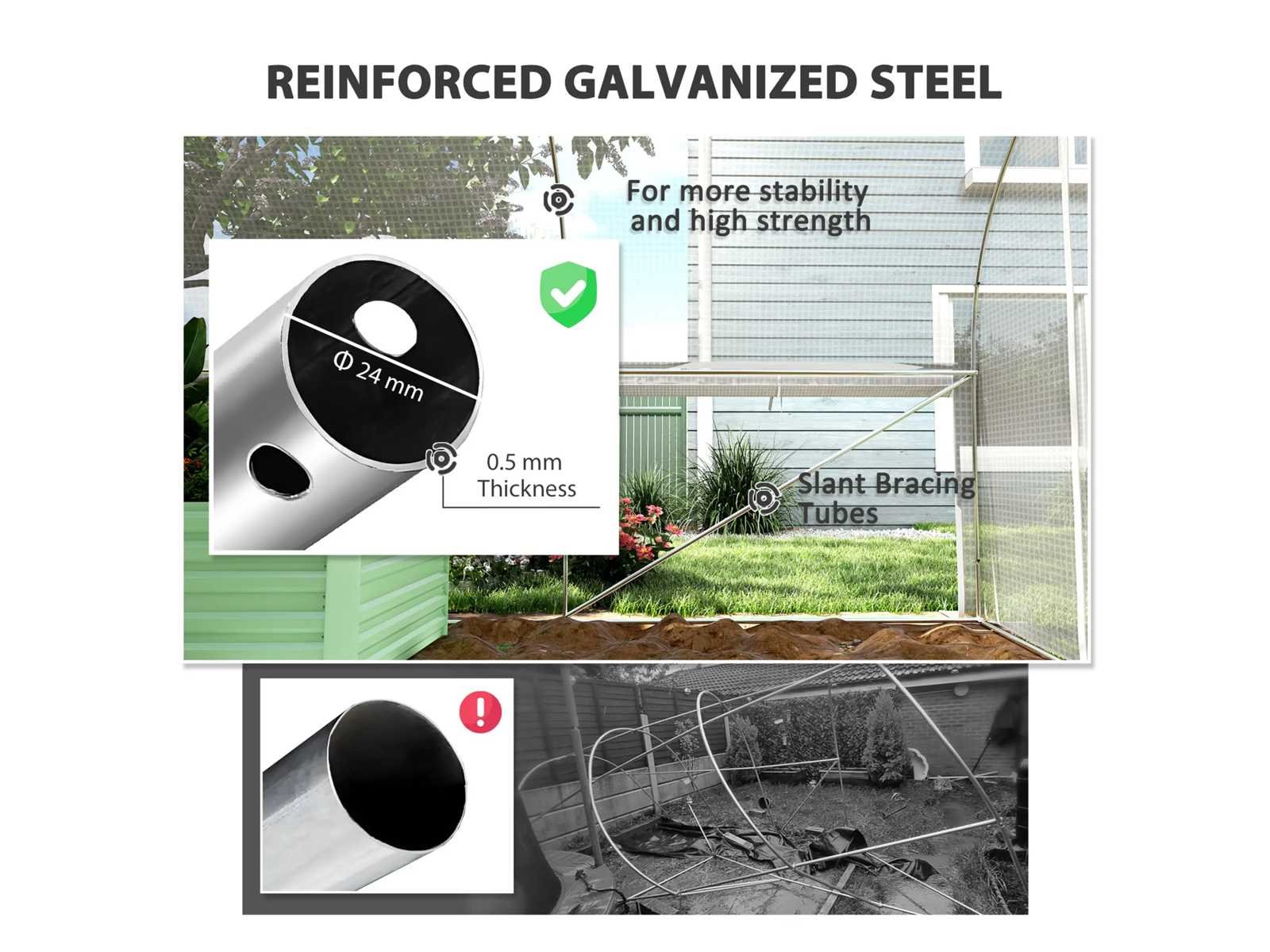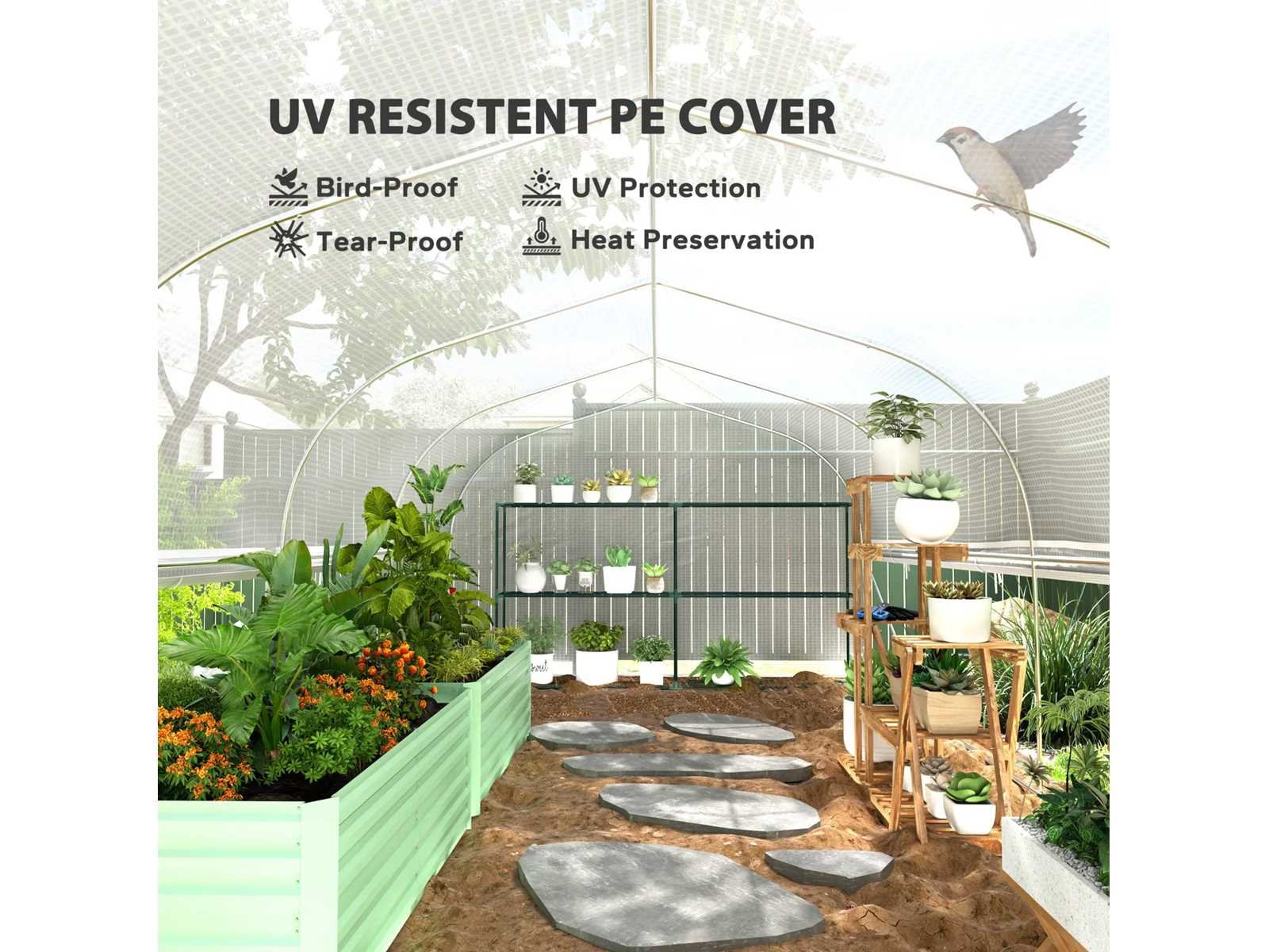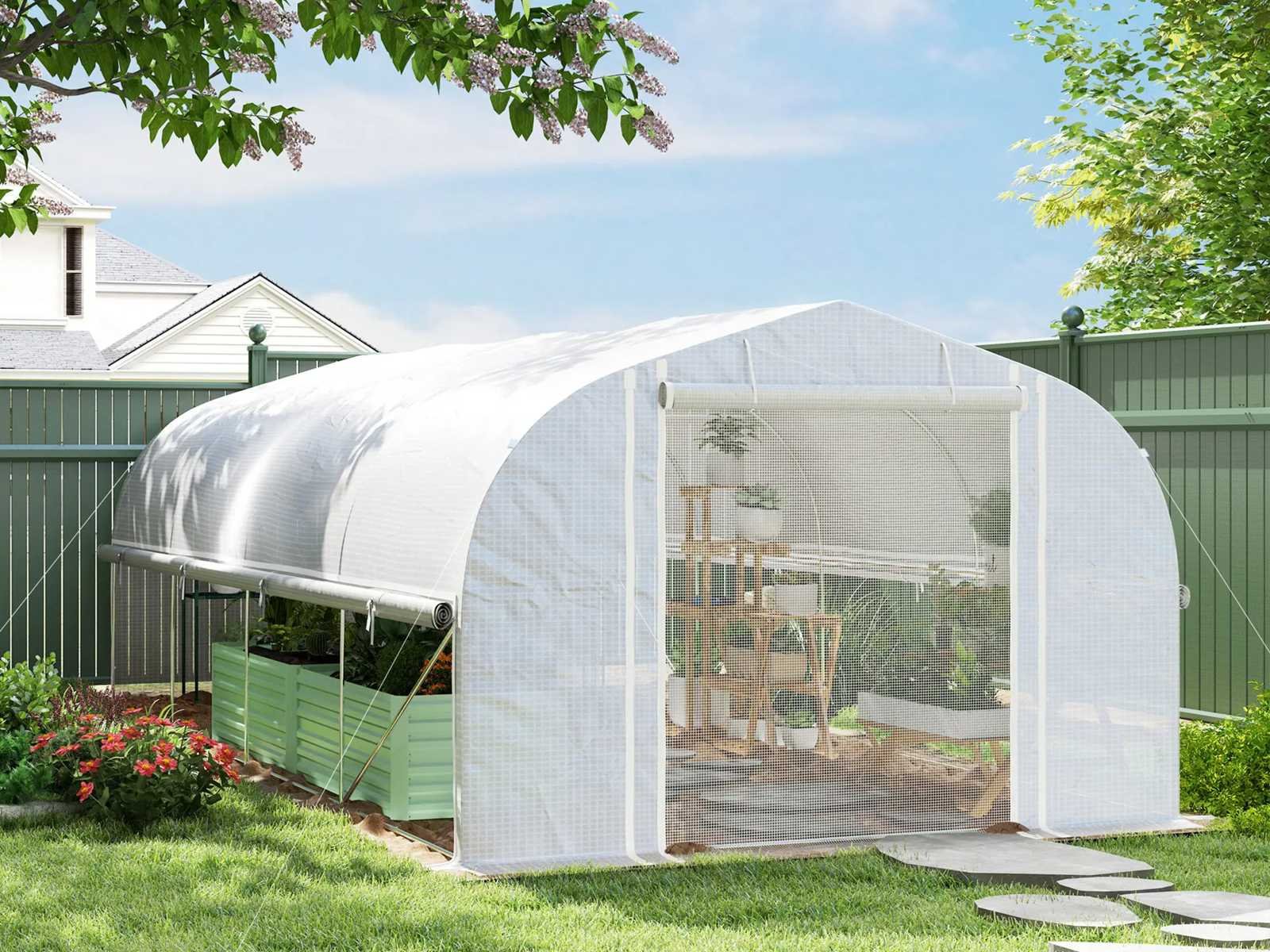 Specificatie: Kleur: Wit Materiaal: PE 140 g/m², gegalvaniseerd staal Totale afmetingen: 595 cm (L) x 300 cm (B) x 200 cm (H) Raamafmetingen: 40 cm (breedte) x 47 cm (hoogte) Afmetingen van de PE buitendeur: 150 cm (breedte) x 170 cm (hoogte) Afmetingen van de binnenste gaasdeur: 170 cm (breedte) x 164 cm (hoogte) Rand breedte: 15 cm Wind: Niveau 4 (windsnelheid minder dan 28 km/u) Voor montage: 3 tot 4 mensen worden aanbevolen Non