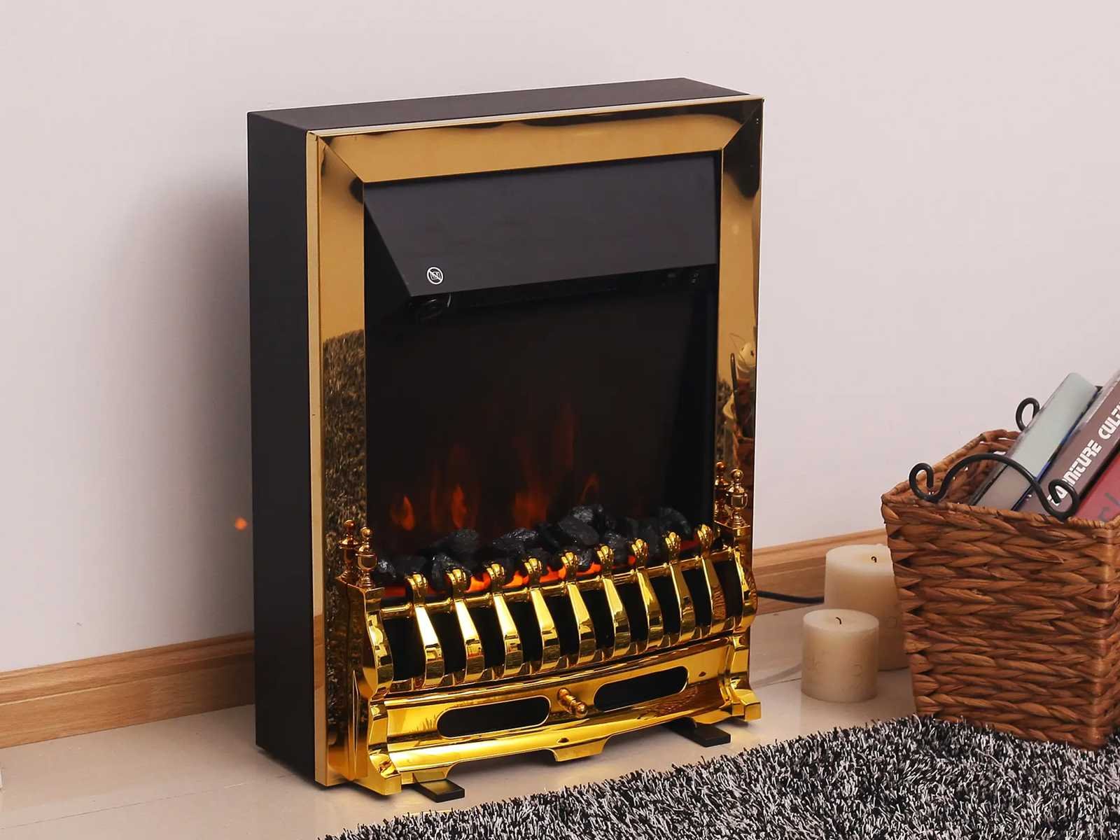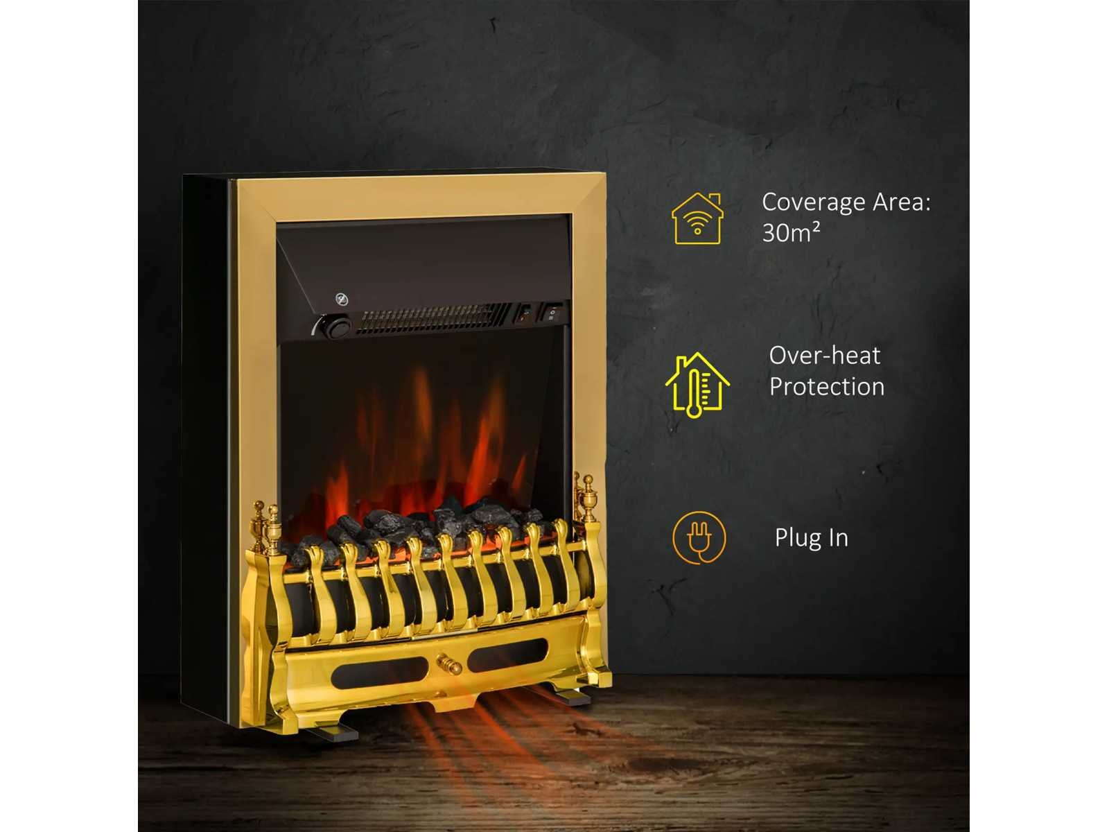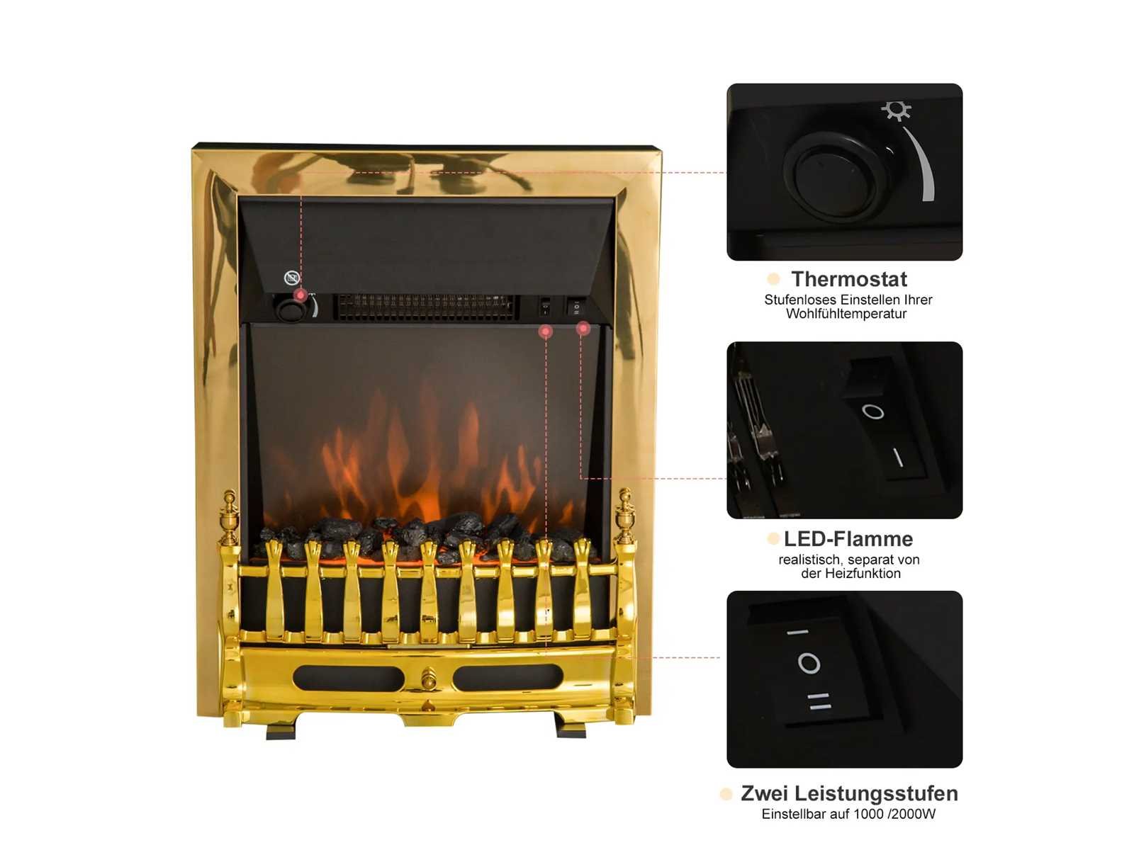 Beschrijving: ? Glanzend uiterlijk ? De LED-vlam kan aan- of uitgaan, ongeacht de verwarming. ? Met het effect van verbrande boomstammen ? 2 selecteerbare verwarmingsniveaus, 1000/2000 W ? Thermische uitschakeling ter bescherming tegen oververhitting ? Voorste aan/uit-schakelaar ? Vrijstaand ? CE- en GS-gecertificeerd Technische gegevens: ? Materialen: Metaal en plastic ? Afmetingen: 48,2 x 18,5 x 59,2 cm (L x B x H) ? Kleur: Goud ? Vermogen: 1000/2000 W ? Spanning: 220 - 240 V ? Kabellengte: 1,6 m Non