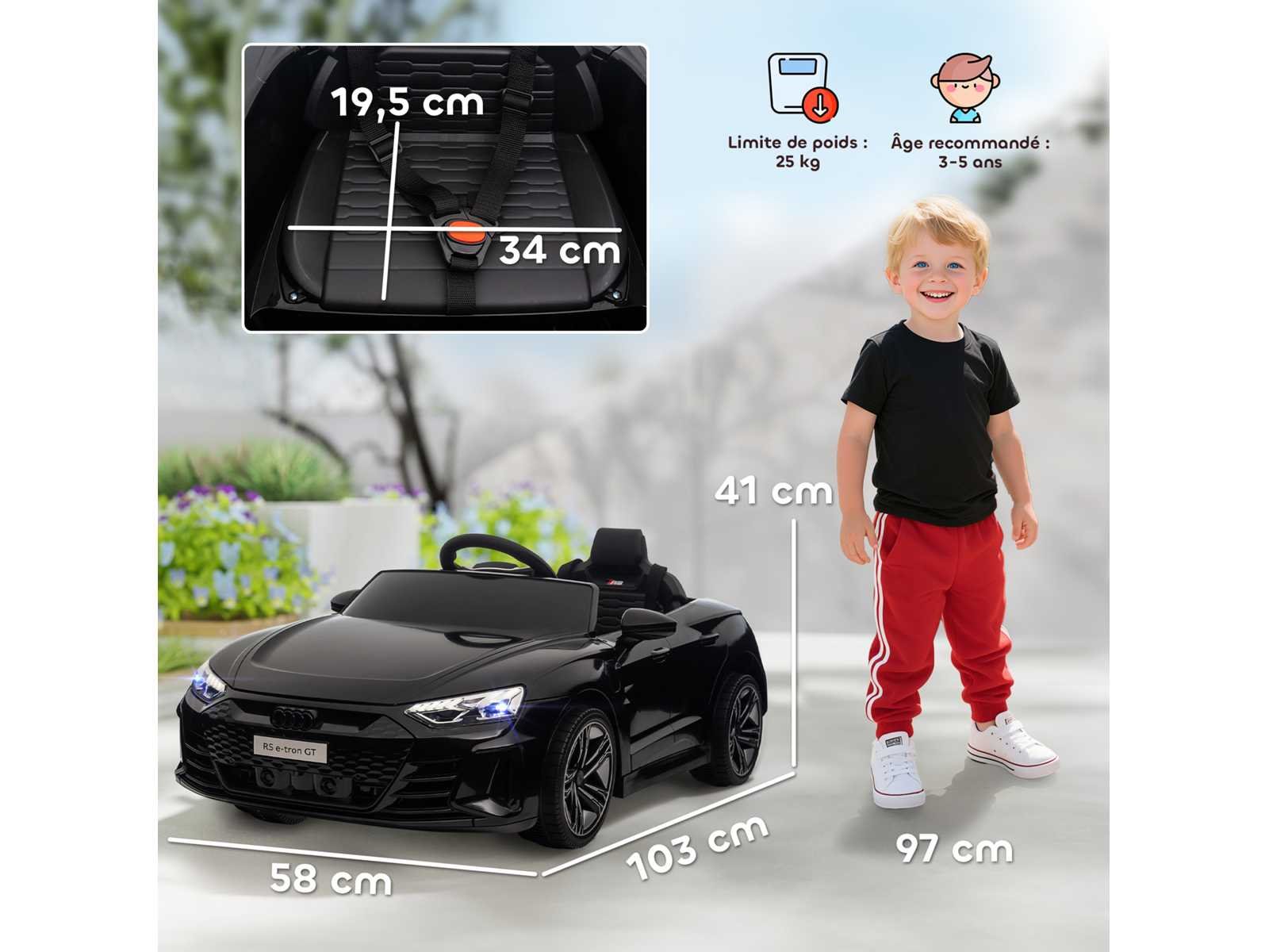 Specificaties: - Kleuren: zwart - Materialen: PP, metaal - Totale afmetingen: 103L x 58B x 41H cm - Zitafmetingen: 34B x 19,5D x 13H cm (vanaf de vloer) - Batterij: 12V 4,5AH - Eerste oplaad: 8-10 uur, gewone lading: 10-12 uur - Snelheid: 3-5 km/u - Afstandsbediening: 25 m - PP-wielen: Ø 19 cm - Aanbevolen maximale belasting: 25 kg - Certificeringsleeftijd: 37-95 maanden. Aanbevolen leeftijden: 3 - 6 jaar - Certificeringen: EN 71-1-2-3, EN 62115, EMC, ROHS, EMC, LVD, ROHS, ERP, RED, MSDS Non