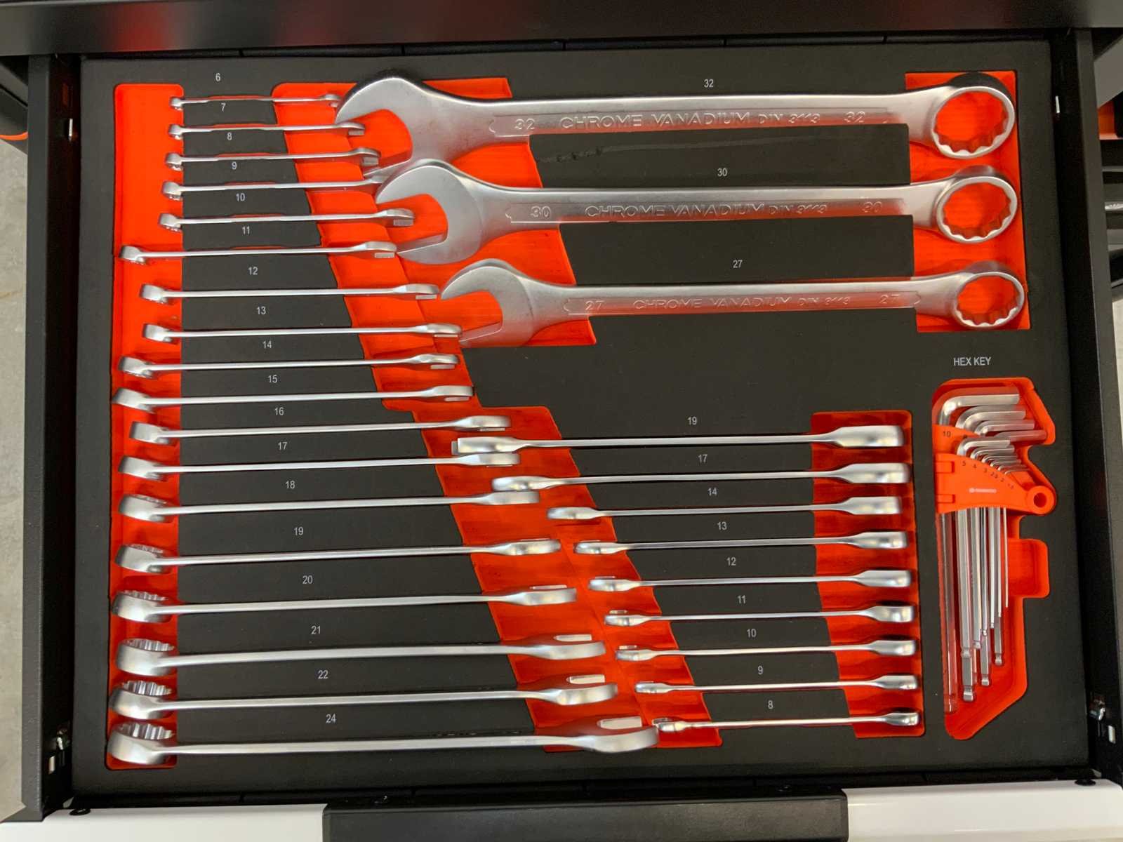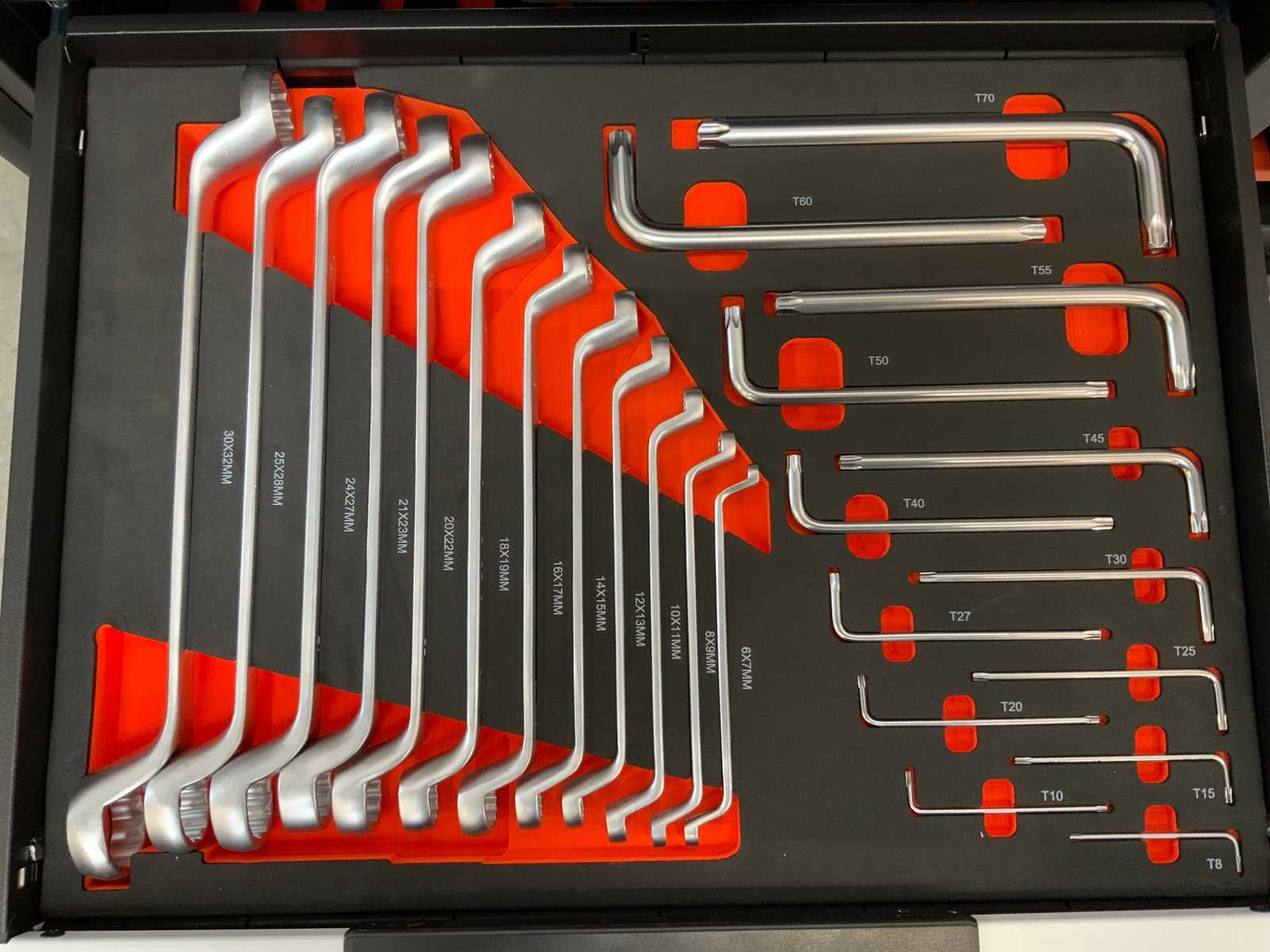 267 delig; 13 lades waarvan 11 lades gevuld; 12 tangen; 12 hamers; 8 Files ; 6 zeshoek sleutels; 6 T-Handle ; 21 schroevendraaiers; 40 steeksleutels; 10 imbus sleutels; 127 doppen en bitjes; 25 sleutels ; houten werkblad; verrijdbaar; remmen; 2 delen afsluitbaar; 5595 Nee Merk: Daewoo Model: DAMWS267 Type: 267 delig Lengte: 106cm Breedte: 57cm Hoogte: 110cm