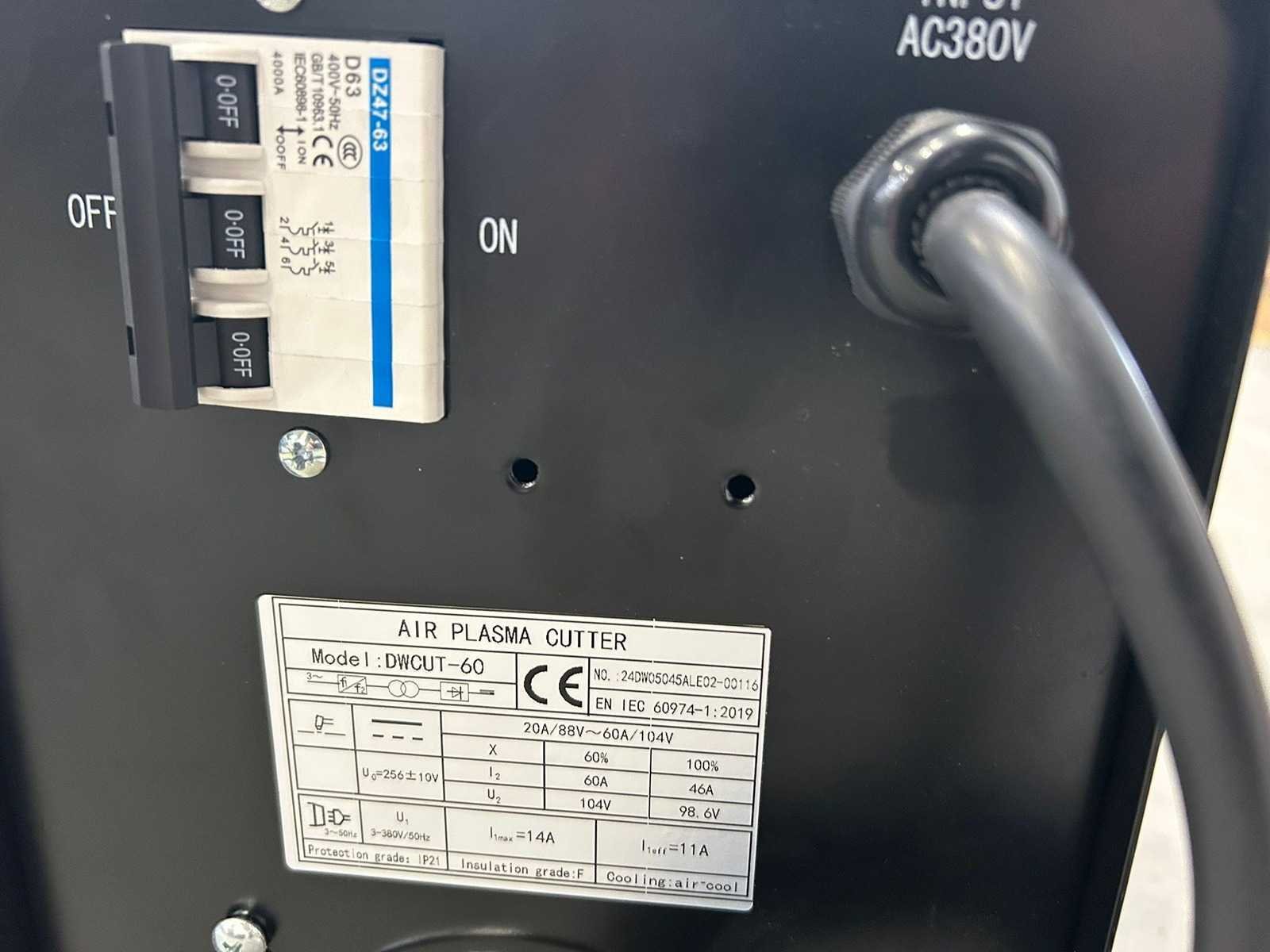 Rated power: 9.2 KVA; Rated current: 14 A; No-load voltage: 256 V; Output current adjustment: 20-60 ; Rated output voltage: 104 V; Max cutting thickness: 20 mm; Cyclic duration factor: 60%; Efficiency: 70%; Insulation grade: F; Protection grade: IP21; Arc-start: Contact; 6094 Nee Merk: Daewoo Type: DWCUT60 Bouwjaar: 2024 Max. snijdikte: 20mm Aansluiting: 380V Machinegewicht: 15kg Afmeting l: 535mm Afmeting b: 210mm Afmeting h: 380mm