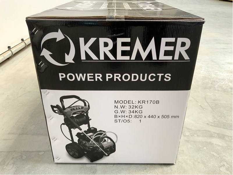 Ongebruikt in doos; temperatuurbereik min.: 0 °c; temperatuurbereik max.: 60 °c; capaciteit: 540 l/hr; mobiel: ja; vermogen: 5,14 kW; met diverse toebehoren; 3902; Nee Merk: Kremer Type: KR170B Max. druk: 170bar Gewicht: 36kg Lengte: 770cm Breedte: 580cm Hoogte: 1000cm